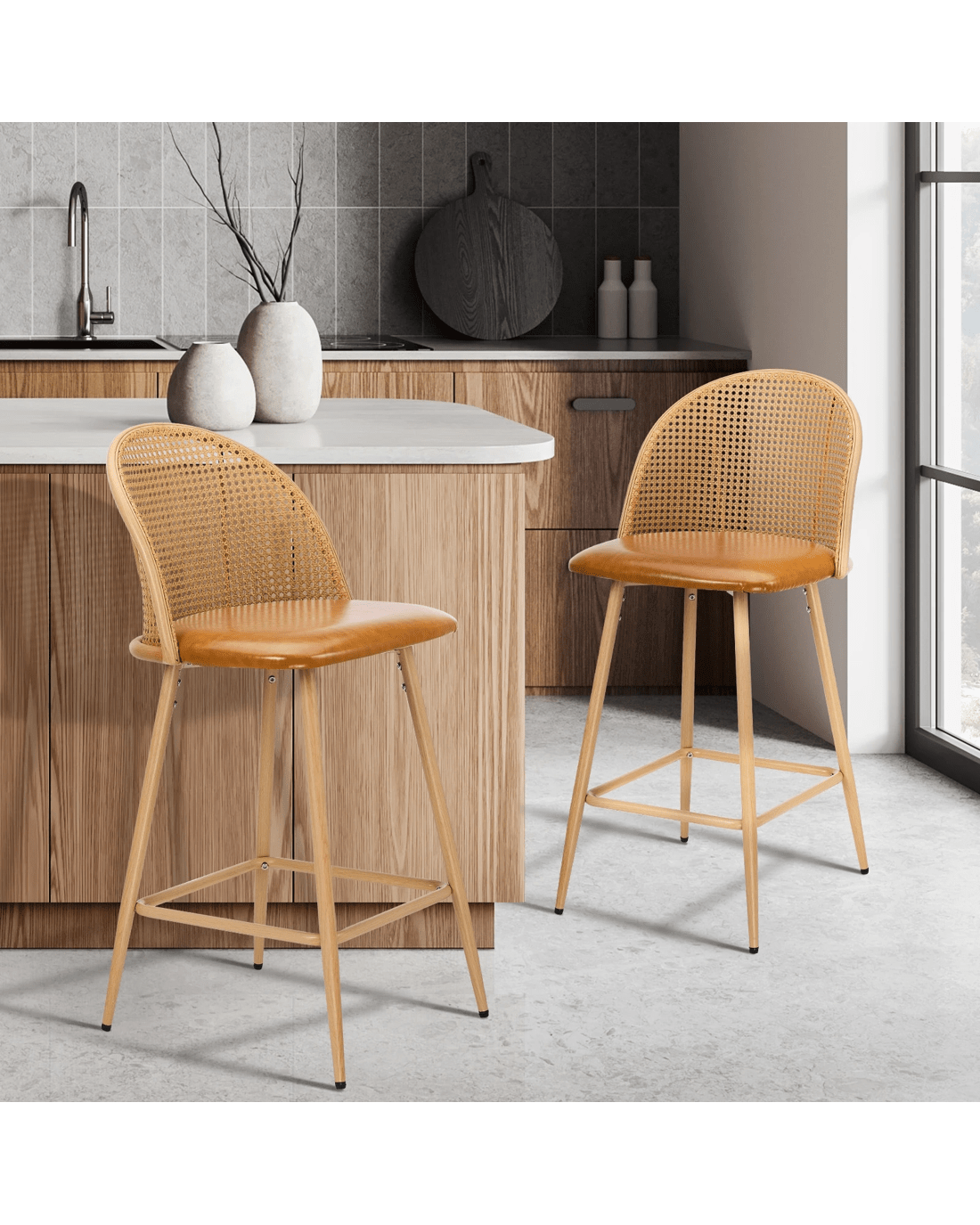 Oikiture Bar Stools Kitchen Counter Stool Rattan Dining Chair Pu Brown X2 - Brown