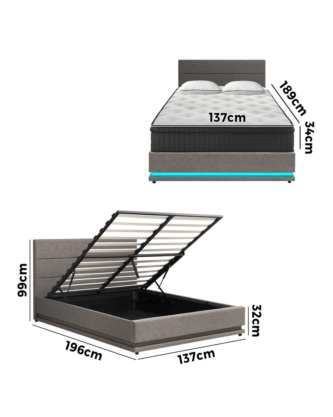 Double: 189cm x 137cm x 34cm