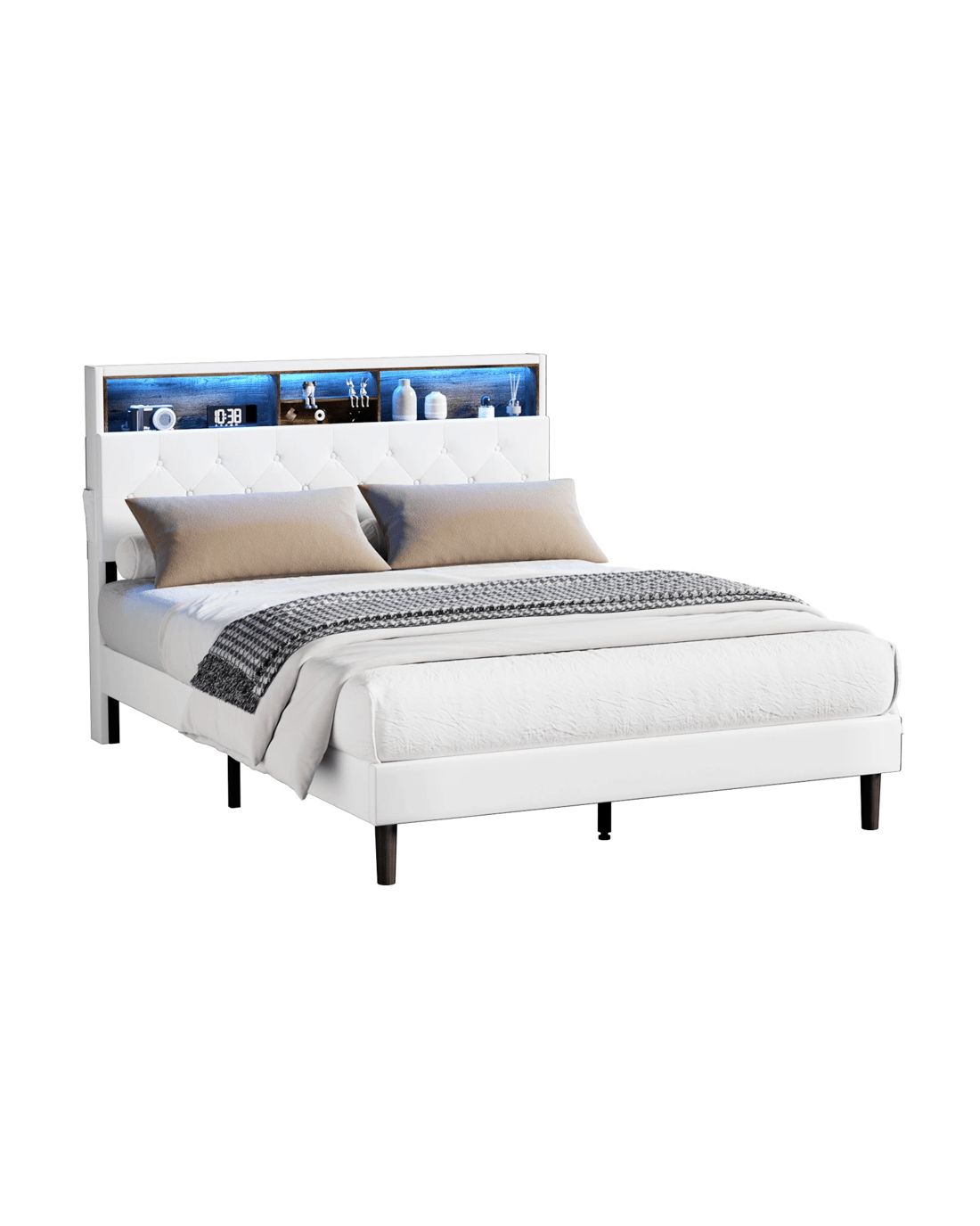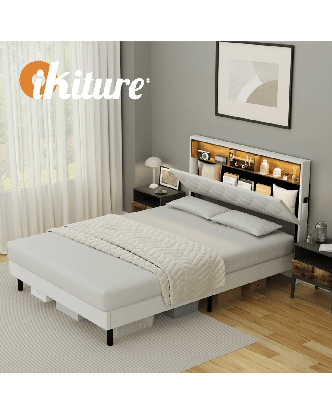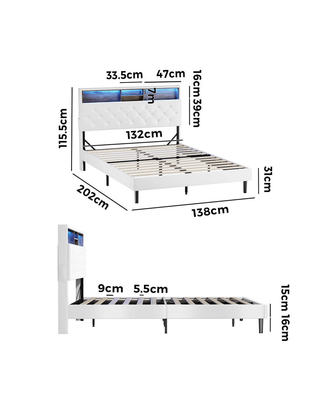 Sold by Kamprad's Oikos 1943Oikiture Bed Frame Double Size with LED Storage Bedhead - White
