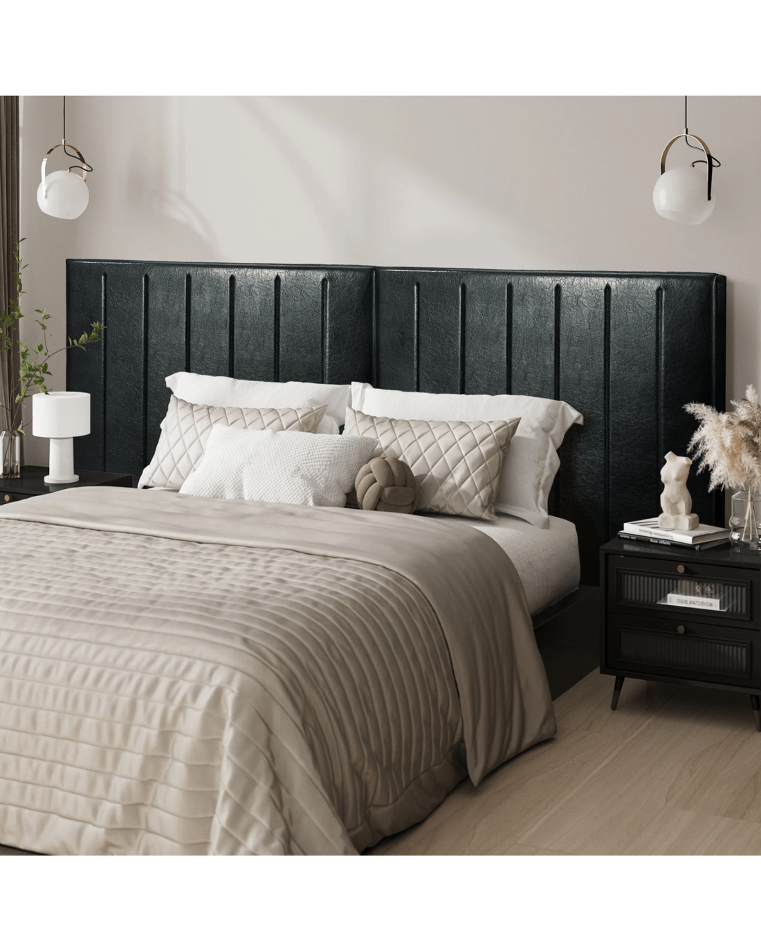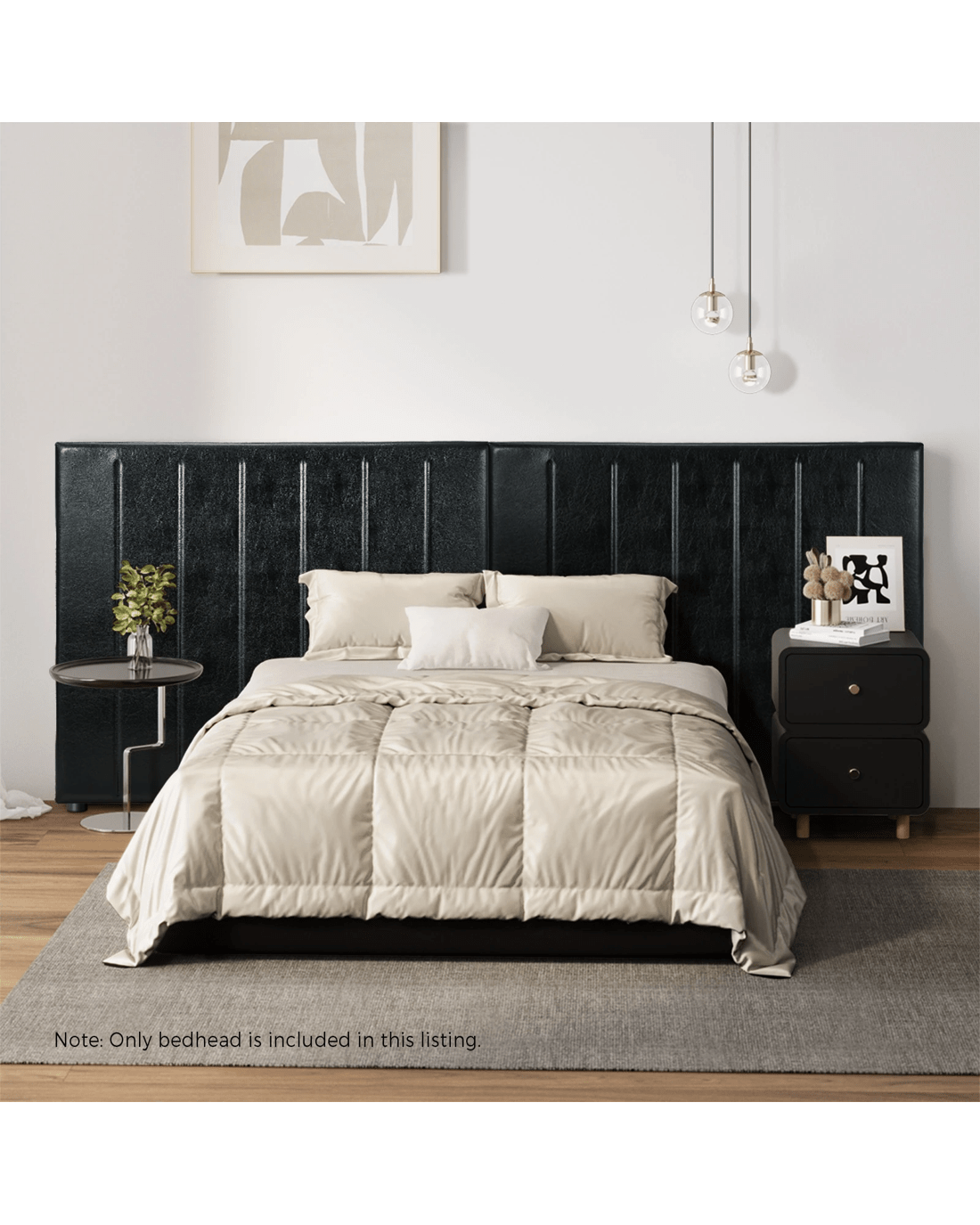 Stunning and simple. Our Oikiture Bed Head can quickly and easily transform your mundane bed into one of exquisite class and elegance. Wrapped in premium PU Leather upholstery and augmented by a rich padding that is inviting and sumptuous, the bed head adds a visual and tactile dimension to your bed with its dotted accents for exceptional charm and comfort. The clean lines ensure that it effortlessly complements a wide variety of bedroom decor to suit your personal style with minimum hassle. Beyond the aesthetics, the tall PU Leather bed head also provides exceptional support for your back and head as you lie back to enjoy your favourite bedroom past times. No more stacking of pillows to get the right backing while sitting upright in bed. The attention to details is meticulous that marries good craftsmanship with quality materials such as the pine wood construction that lends the bed head its strength and durability. Plus, the sturdy legs also ensure the bed head can stand up to robust use time and again. Finished in black hues and available in a Queen size, the bed head is easy on the eye and senses and would be perfect for matching similarly-styled bed frames for a well-blended furniture piece. Never look at your bed the same way again. The Oikiture Bed Head will certainly elevate it to a splendid spectacle that you will surely appreciate.
