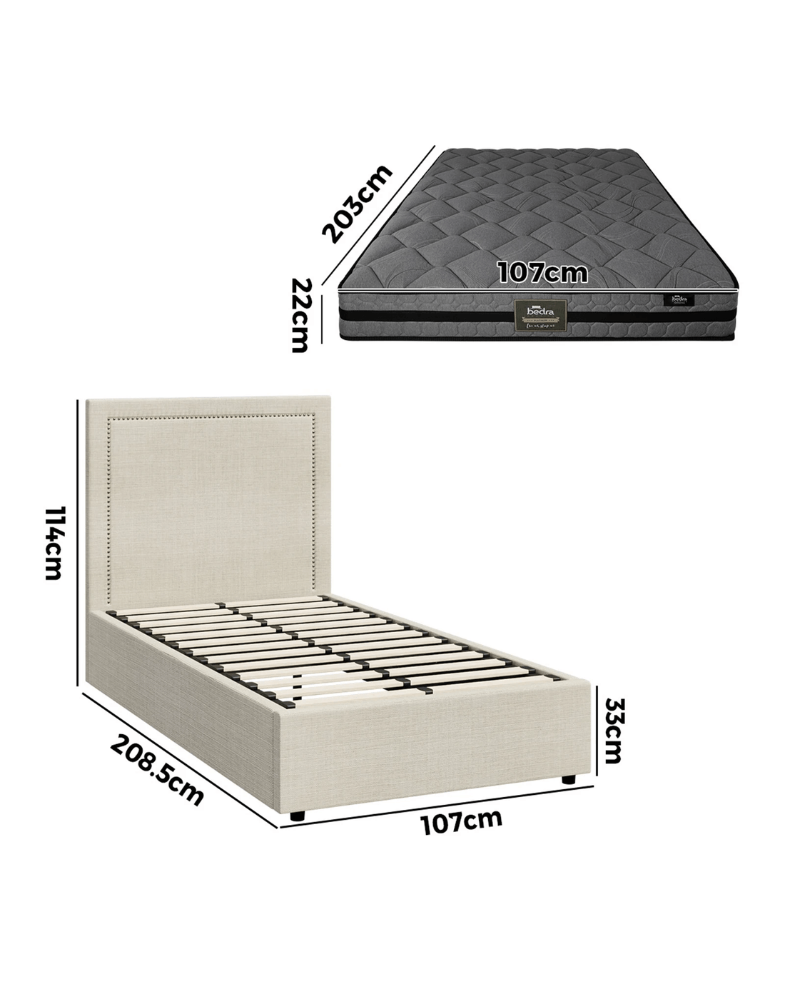 King Single: 208.5cm x 107cm x 114cm
