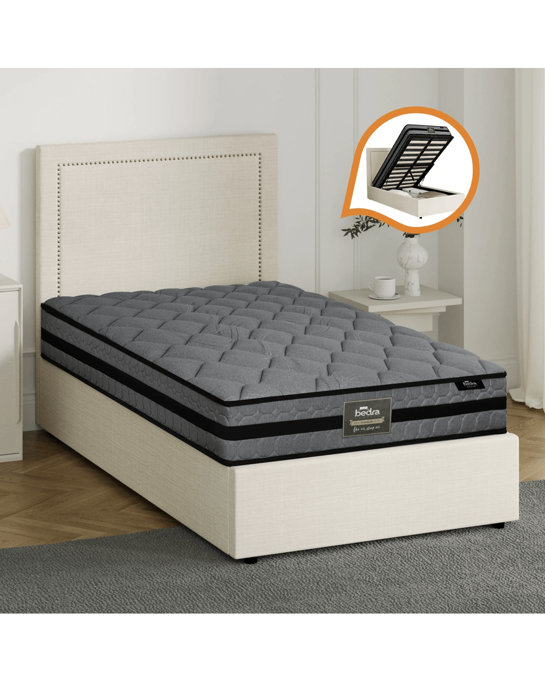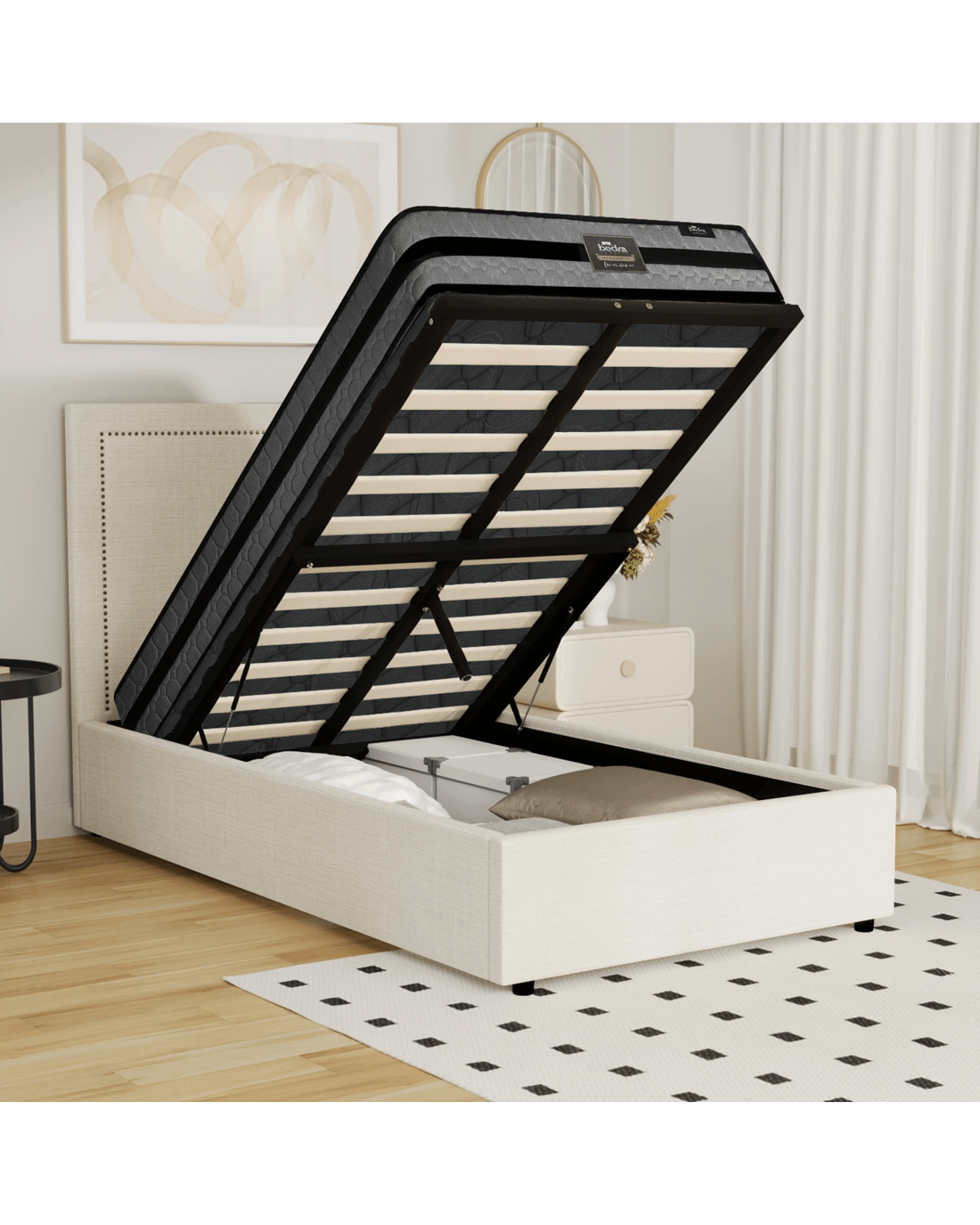 Plus, the bed frame is definitely more than meets the eye. With its assisted hydraulic gas lift hinges, the bed can be easily brought up to reveal generous storage space for bedding and other assorted bedroom essentials.