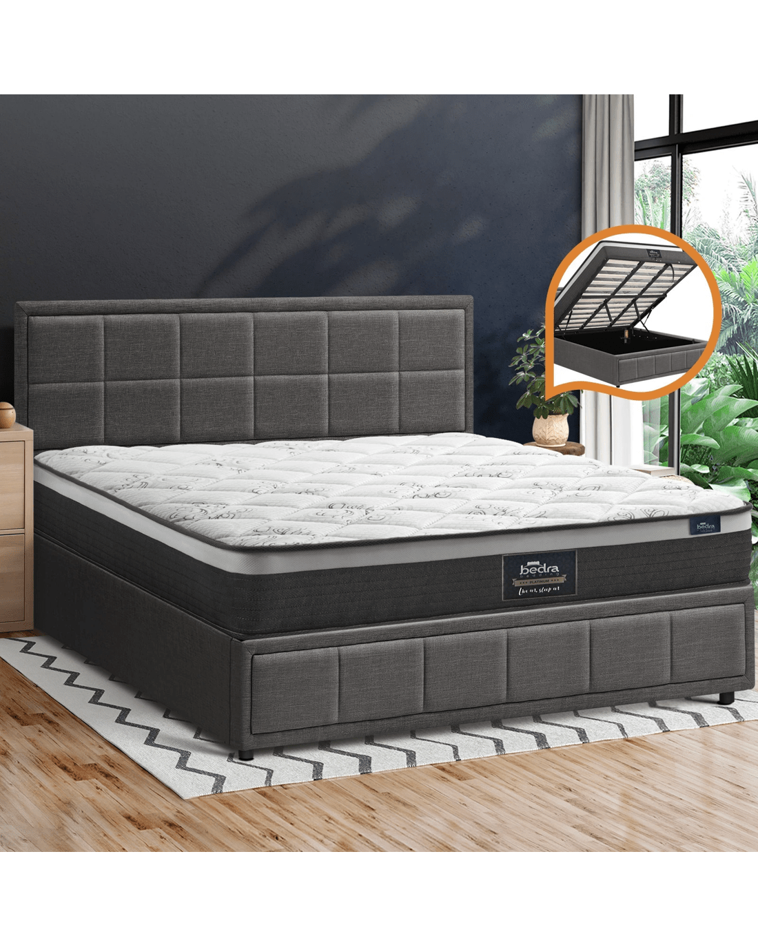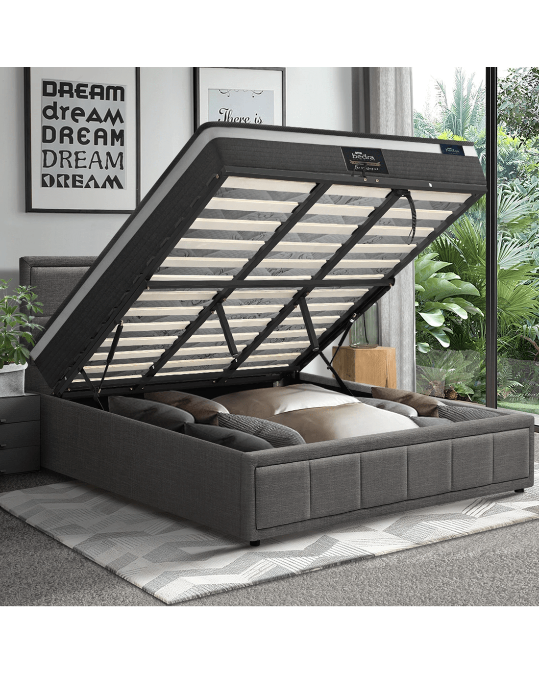 Plus, the bed frame is definitely more than meets the eye. With its assisted hydraulic gas lift hinges, the bed can be easily brought up to reveal generous storage space for bedding and other assorted bedroom essentials.