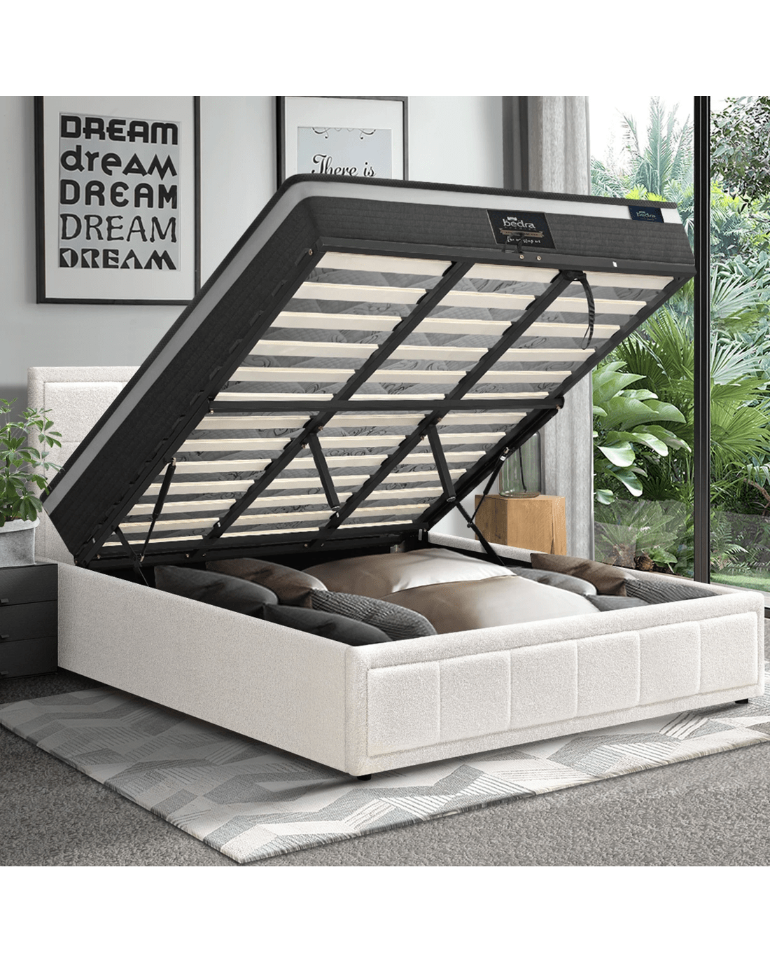 Plus, the bed frame is definitely more than meets the eye. With its assisted hydraulic gas lift hinges, the bed can be easily brought up to reveal generous storage space for bedding and other assorted bedroom essentials.