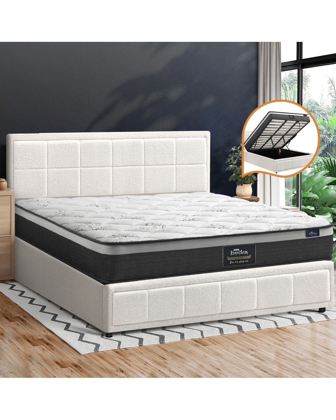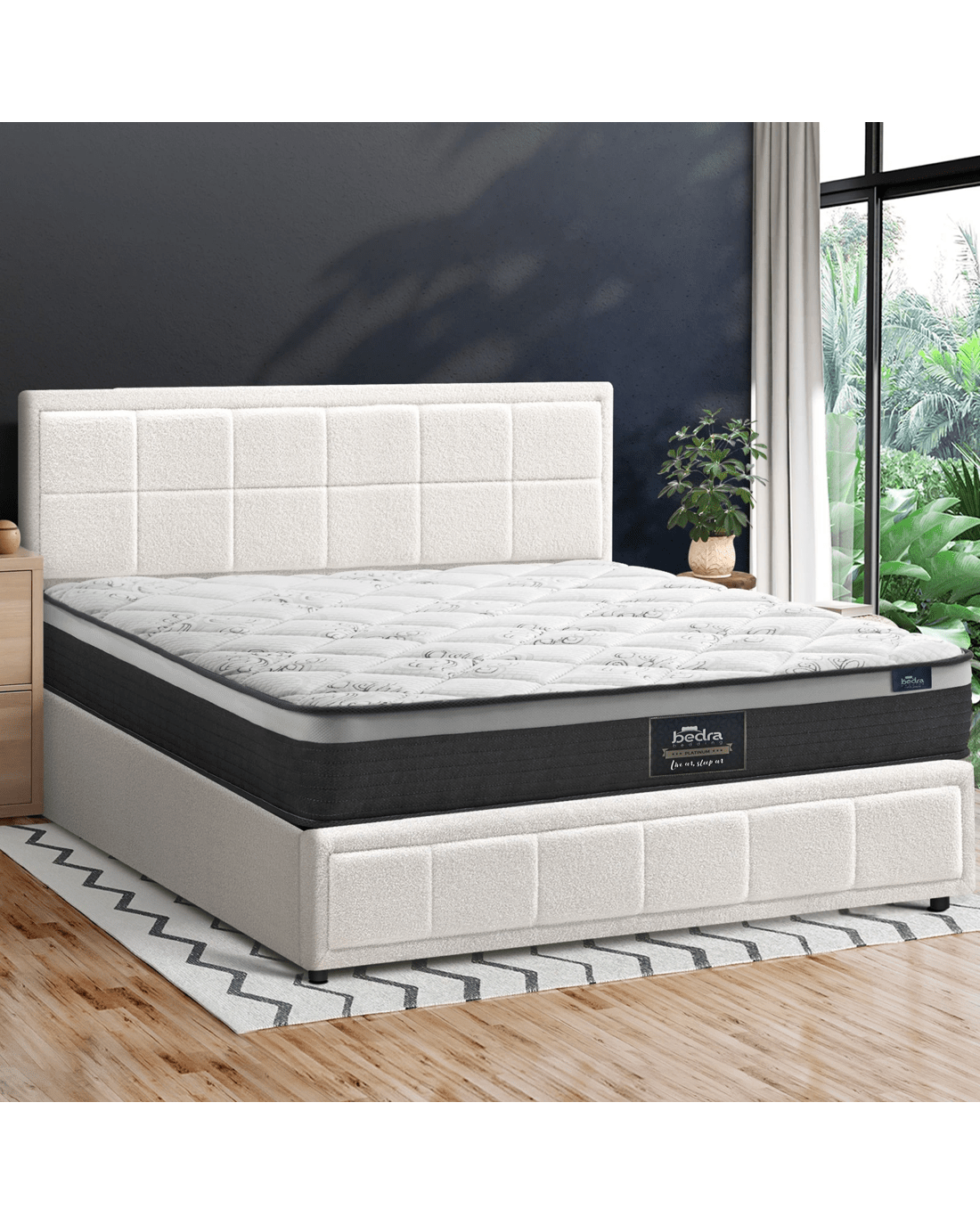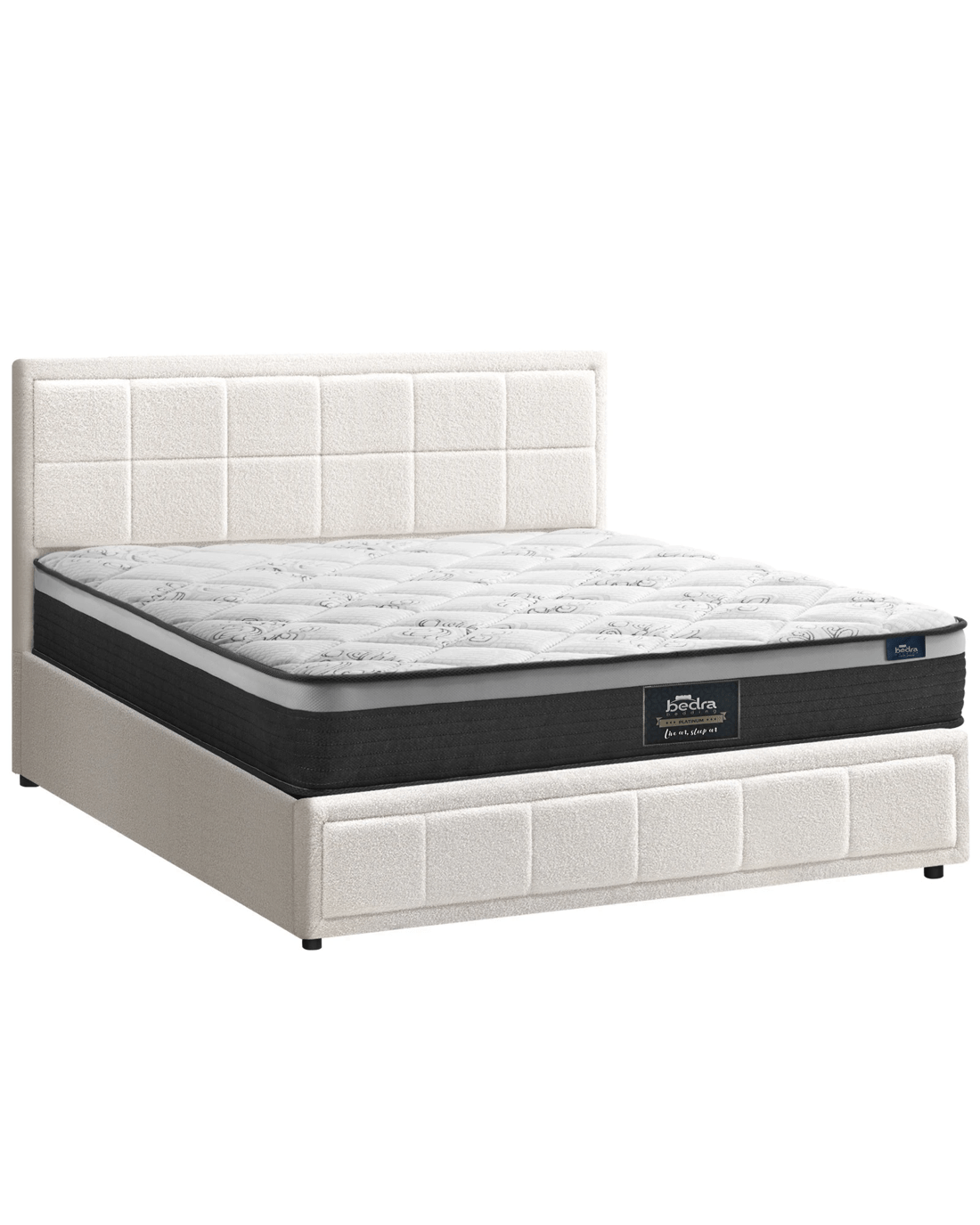 Best of all, the stylish bed frame also includes a comfortable Bedra Bedding Pocket Springs mattress to complete the set. This high-quality spring mattress features all the benefits of an independent pocket springs system that provides reinforced edging, motion isolation, anti-disturbance and full body support. Naturally, the highly breathable mattress complies with all required standards and certification and is hygienically safe from top to bottom and everything else in between.