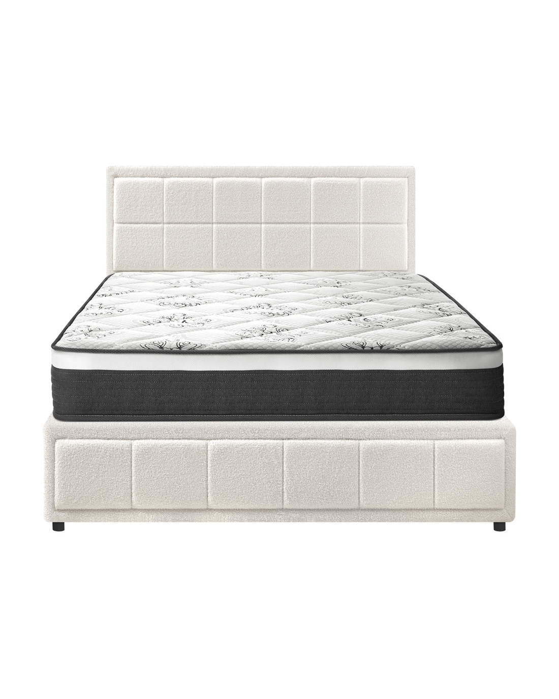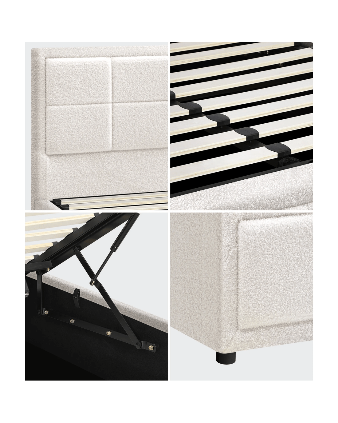 Featuring a well-padded 3-D bedhead and bed end design with premium boucle fabric, the Oikiture Gas Lift Bed Frame exudes bespoke elegance and adds a luxurious presence to any bedroom decor. Soft to the touch that lends a swank and intimate aura to accompany your calm and restful sleep.