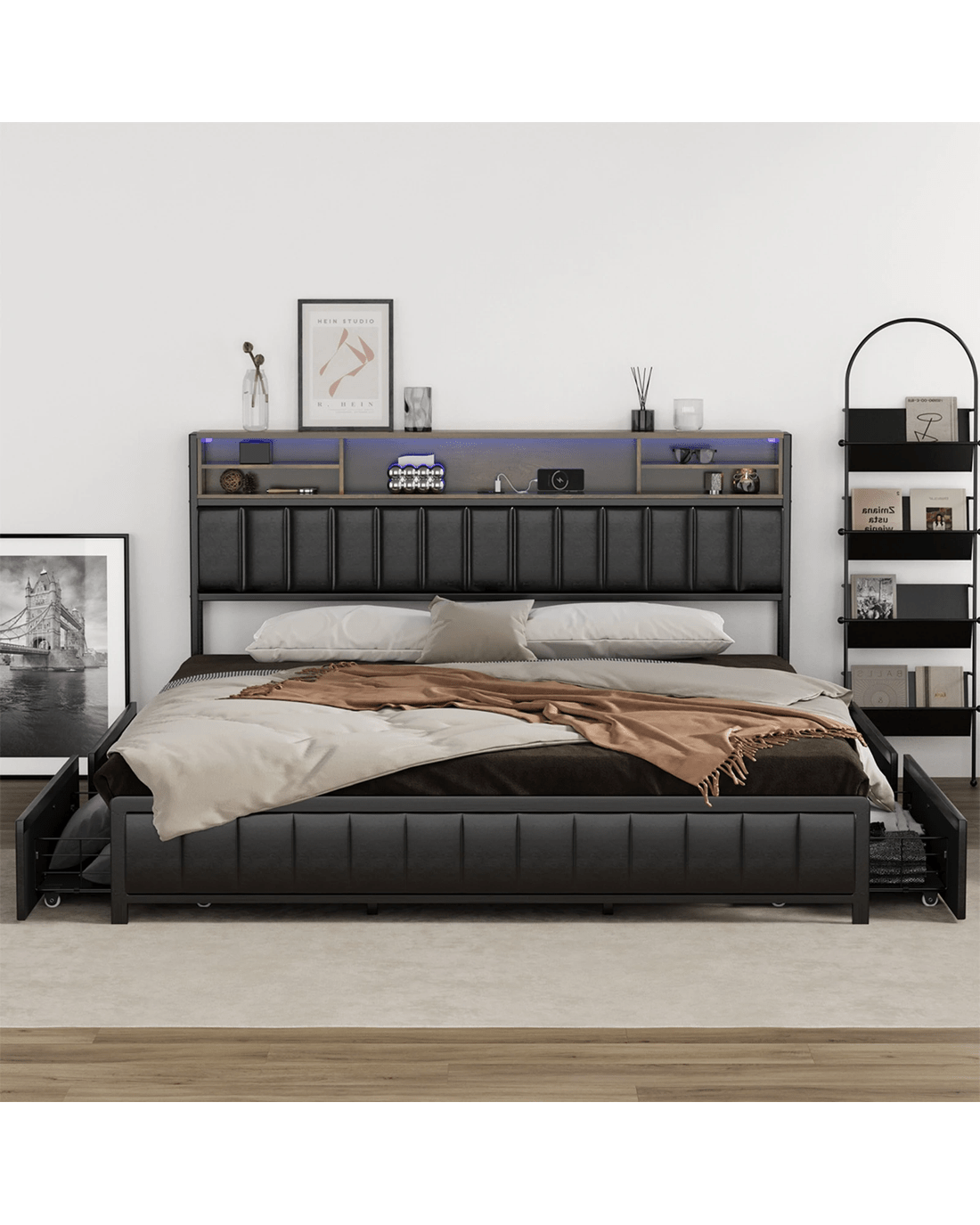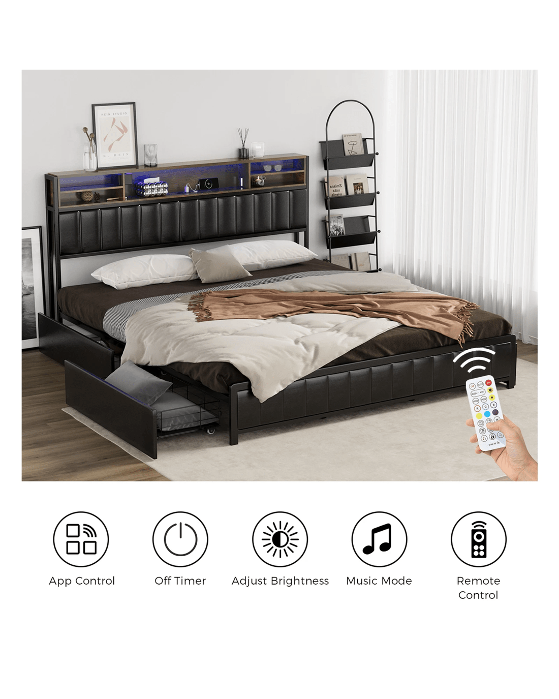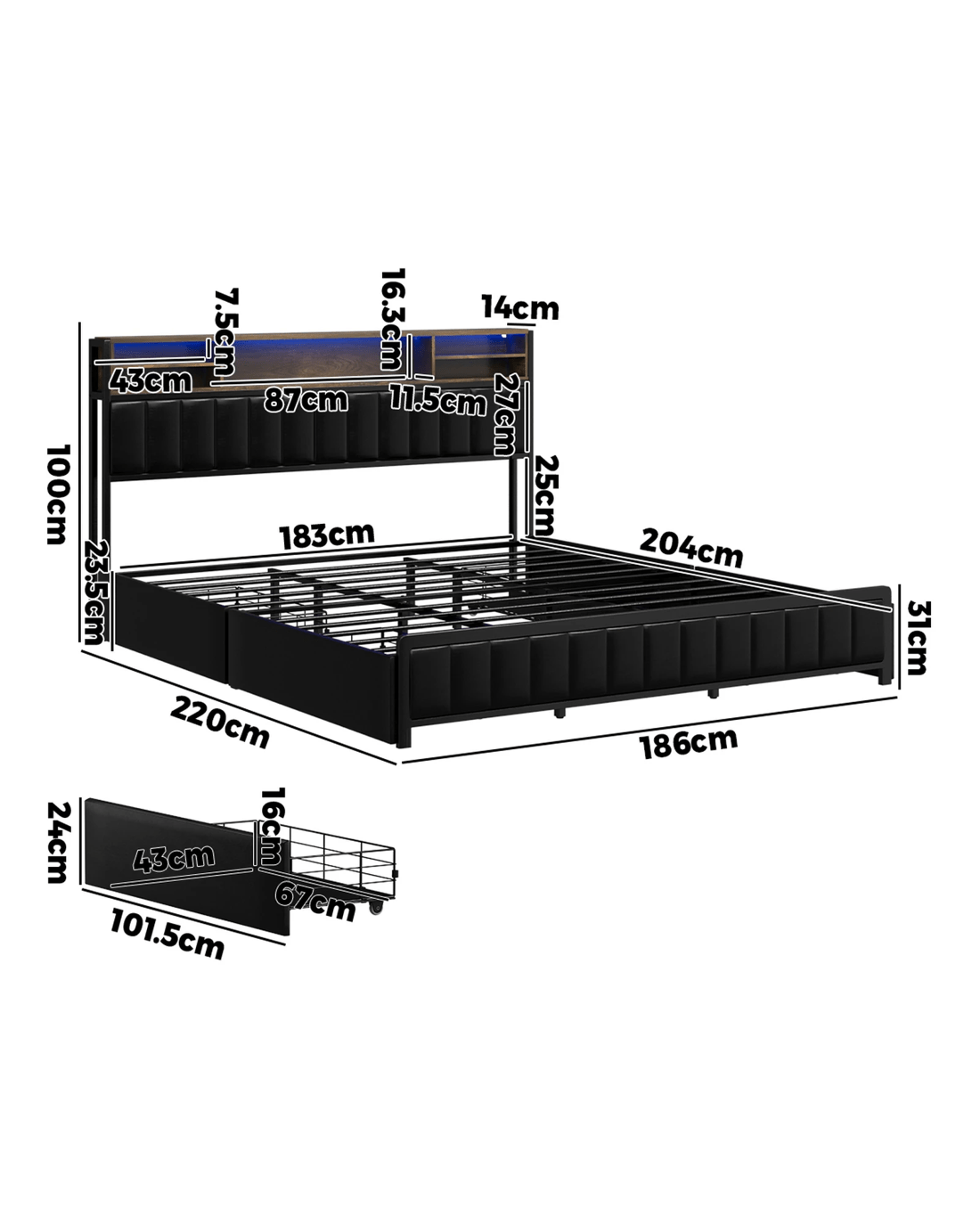 Sold by Kamprad's Oikos 1943Oikiture Bed Frame King Size LED Storage Headboard USB Charge 4 Drawers - Black