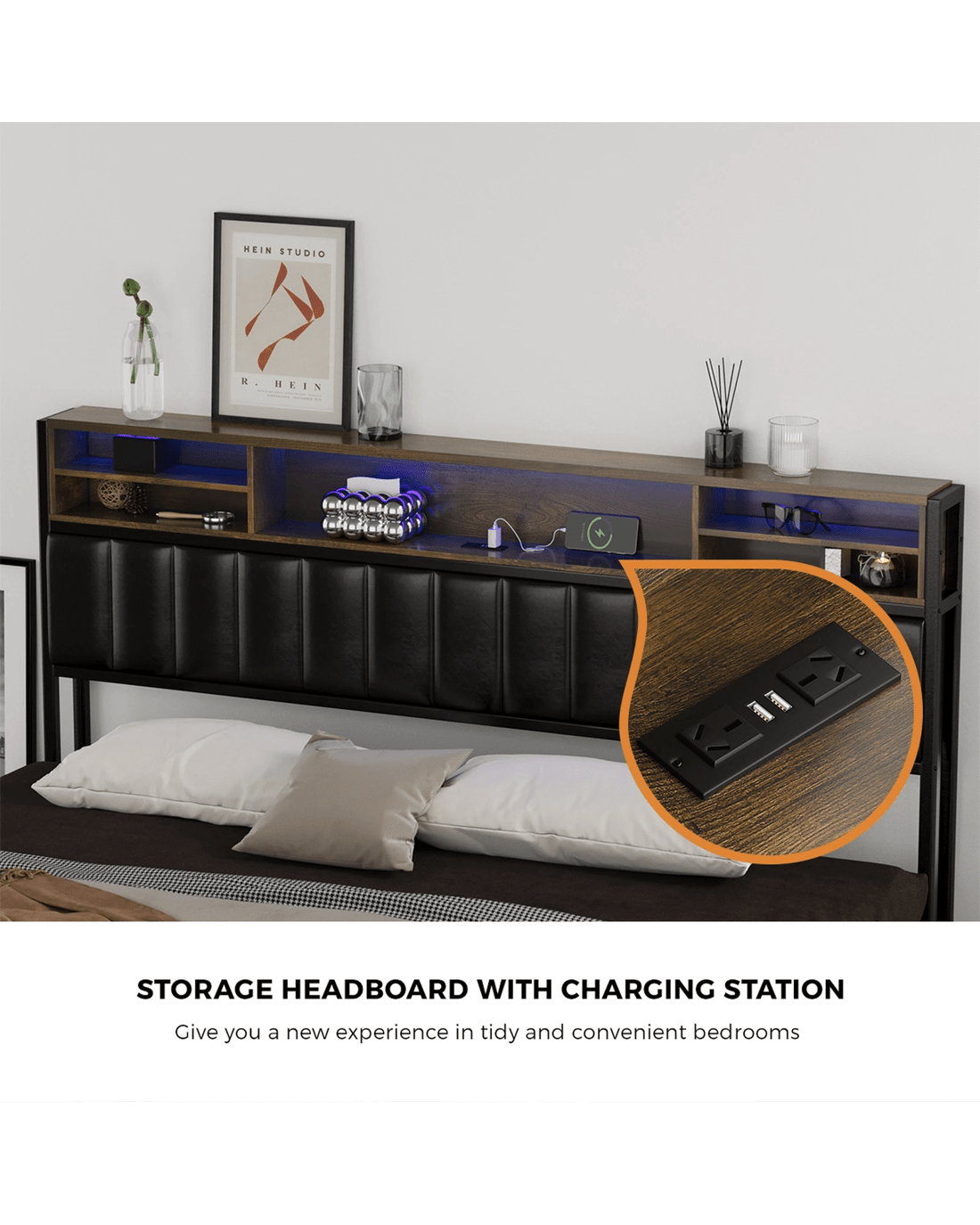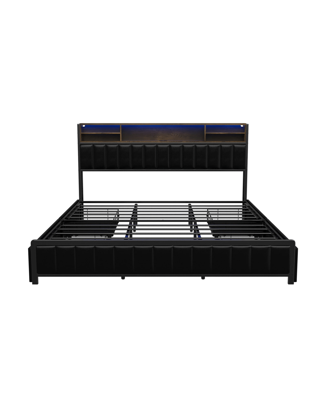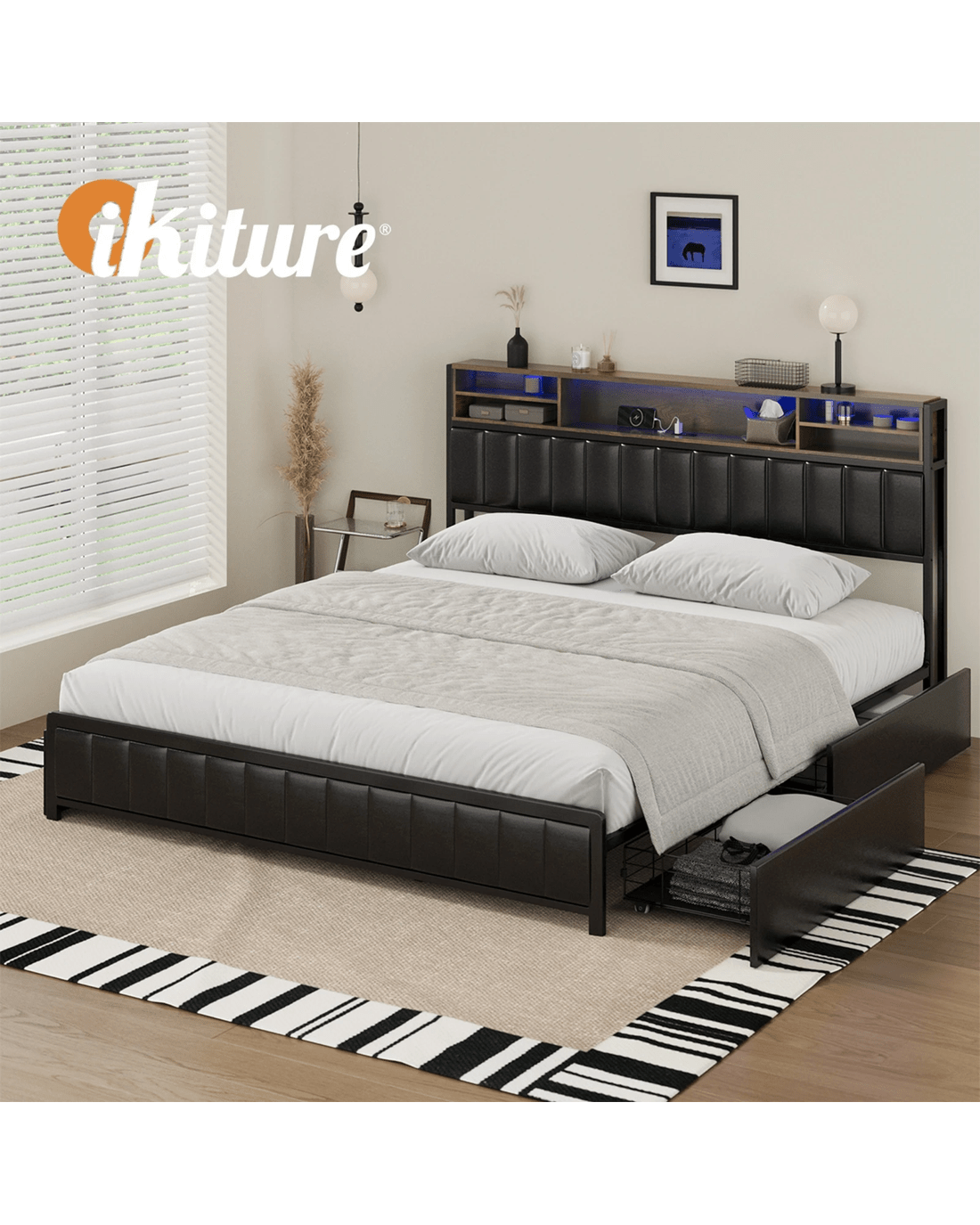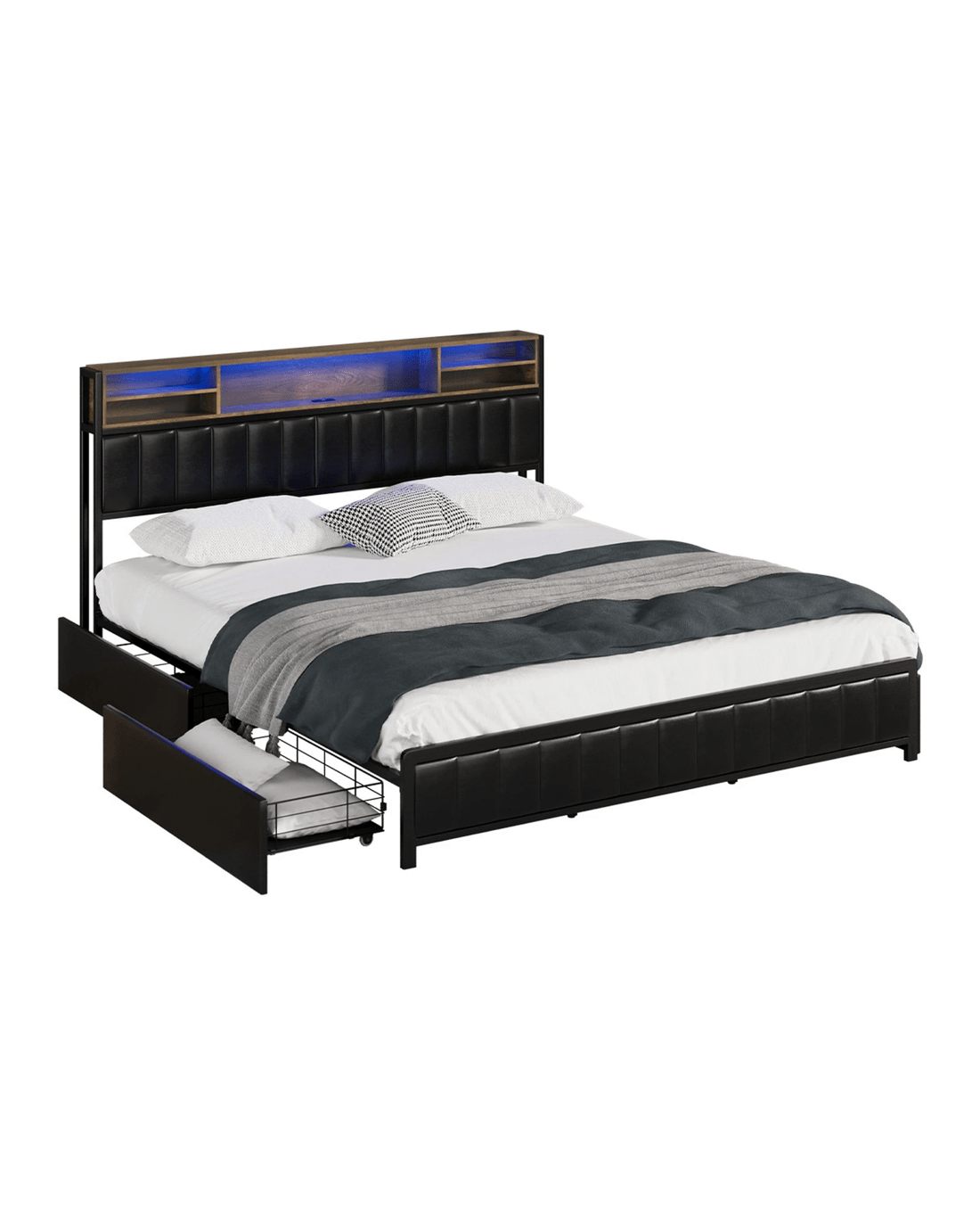 Sold by Kamprad's Oikos 1943Oikiture Bed Frame King Size LED Storage Headboard USB Charge 4 Drawers - Black