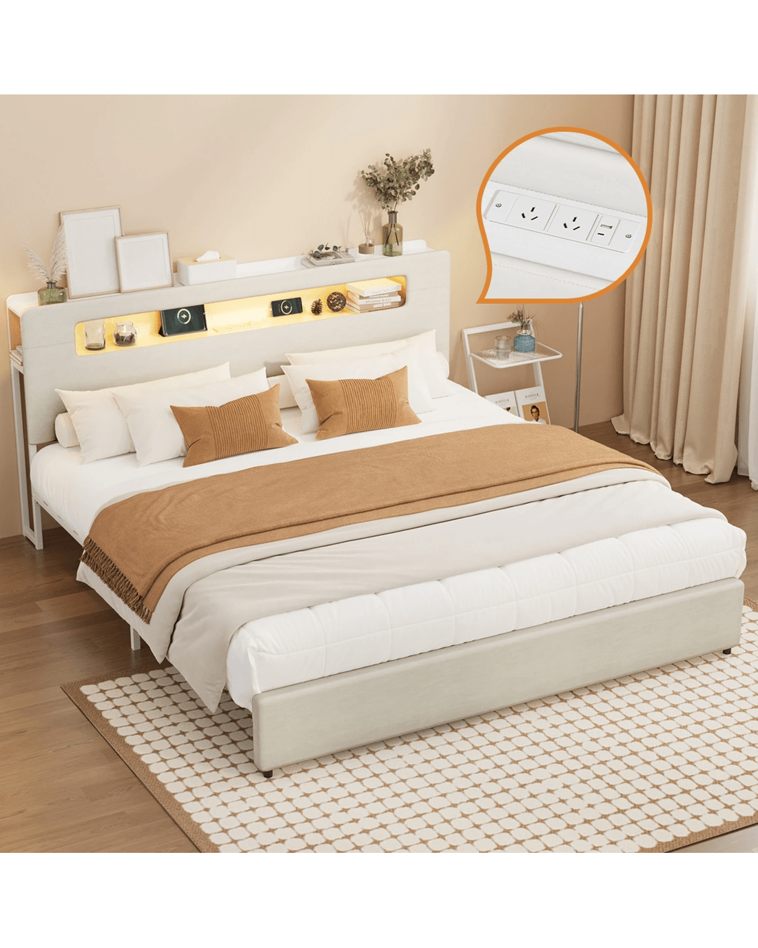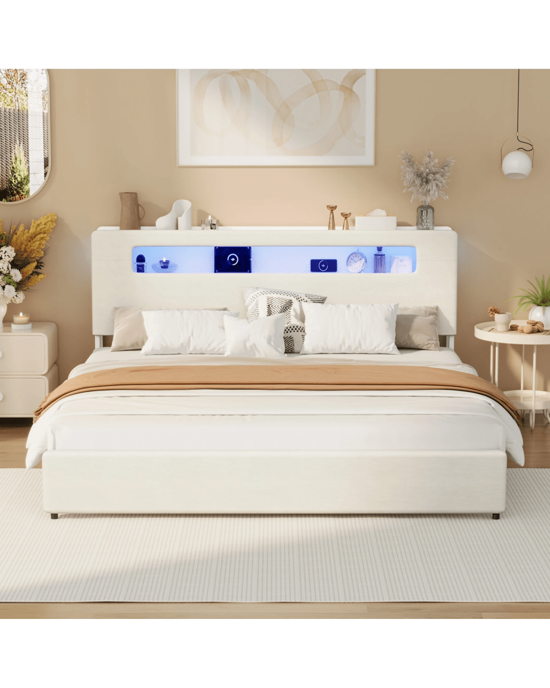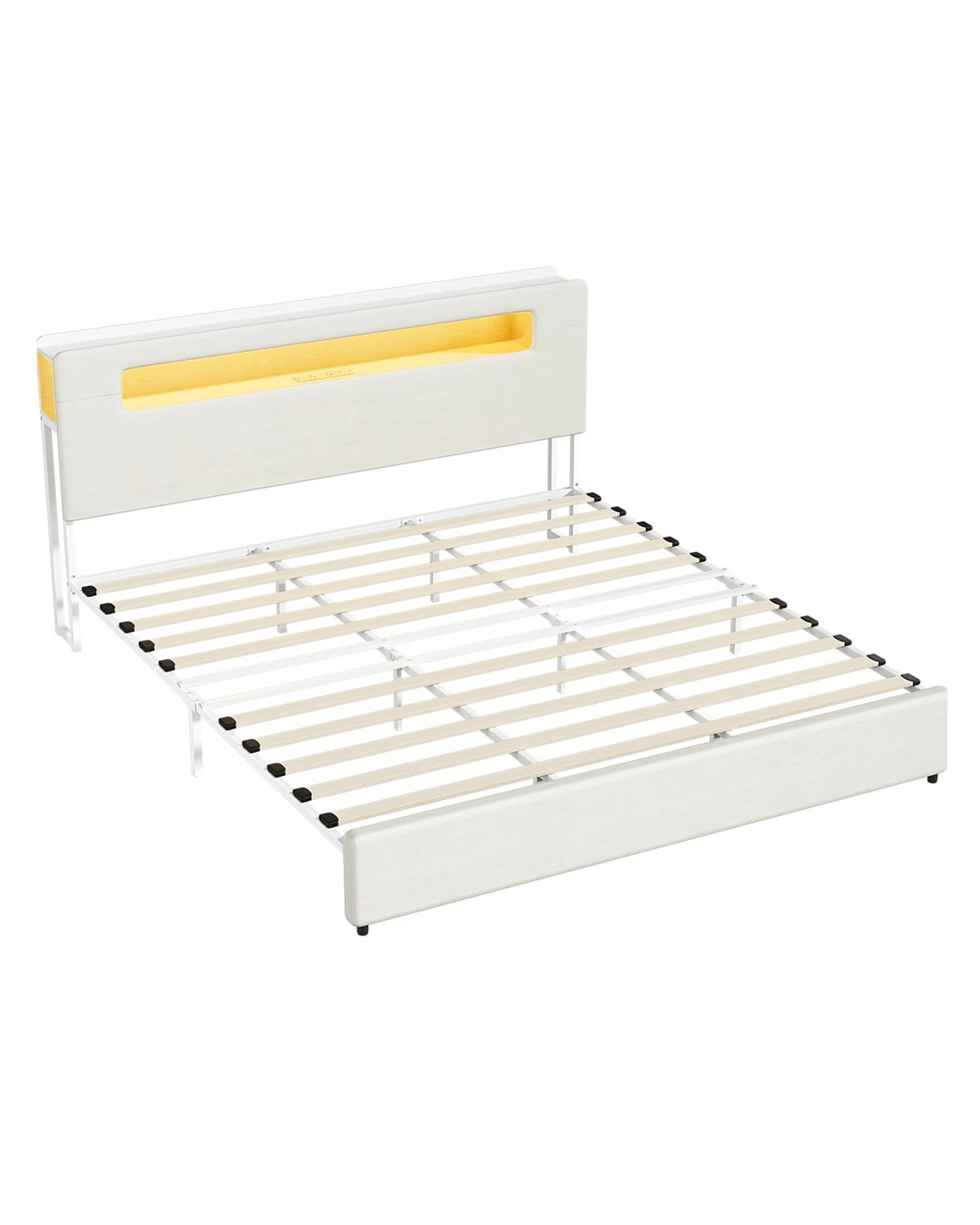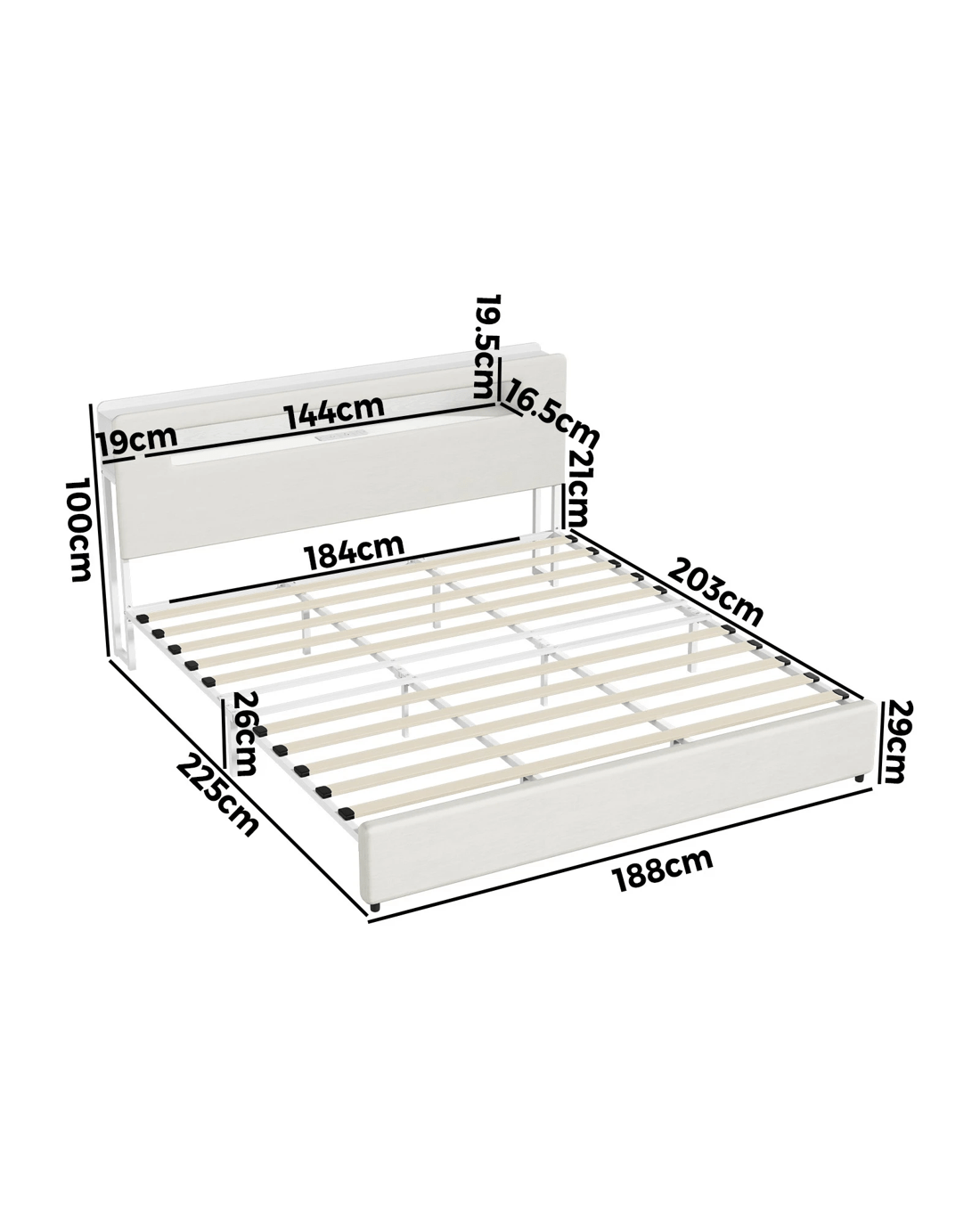 Sold by Kamprad's Oikos 1943Oikiture Bed Frame King Size with LED Lights USB Charging Storage Headboad - White