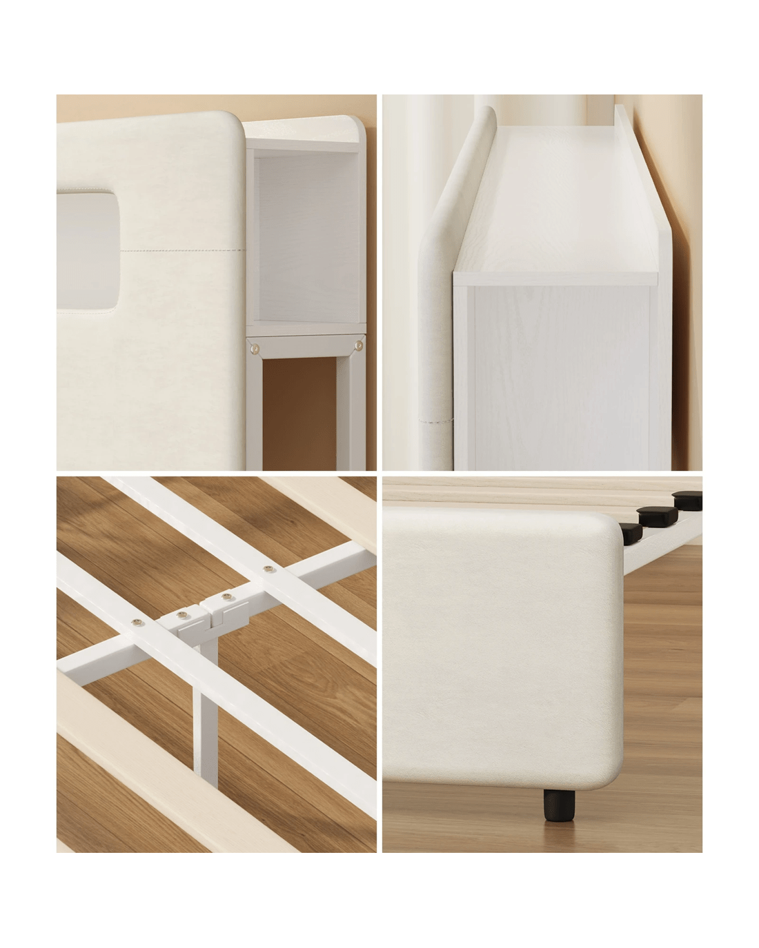 First up, the headboard and tailboard are both upholstered in a soft linen fabric for a chic and swanky vibe. And within the headboard, a storage display shelf lets you store all your bedroom essentials and anything else that meets your fancy to have at your bedside. Books, mementos, collectible or media devices. Add to that list anytime.