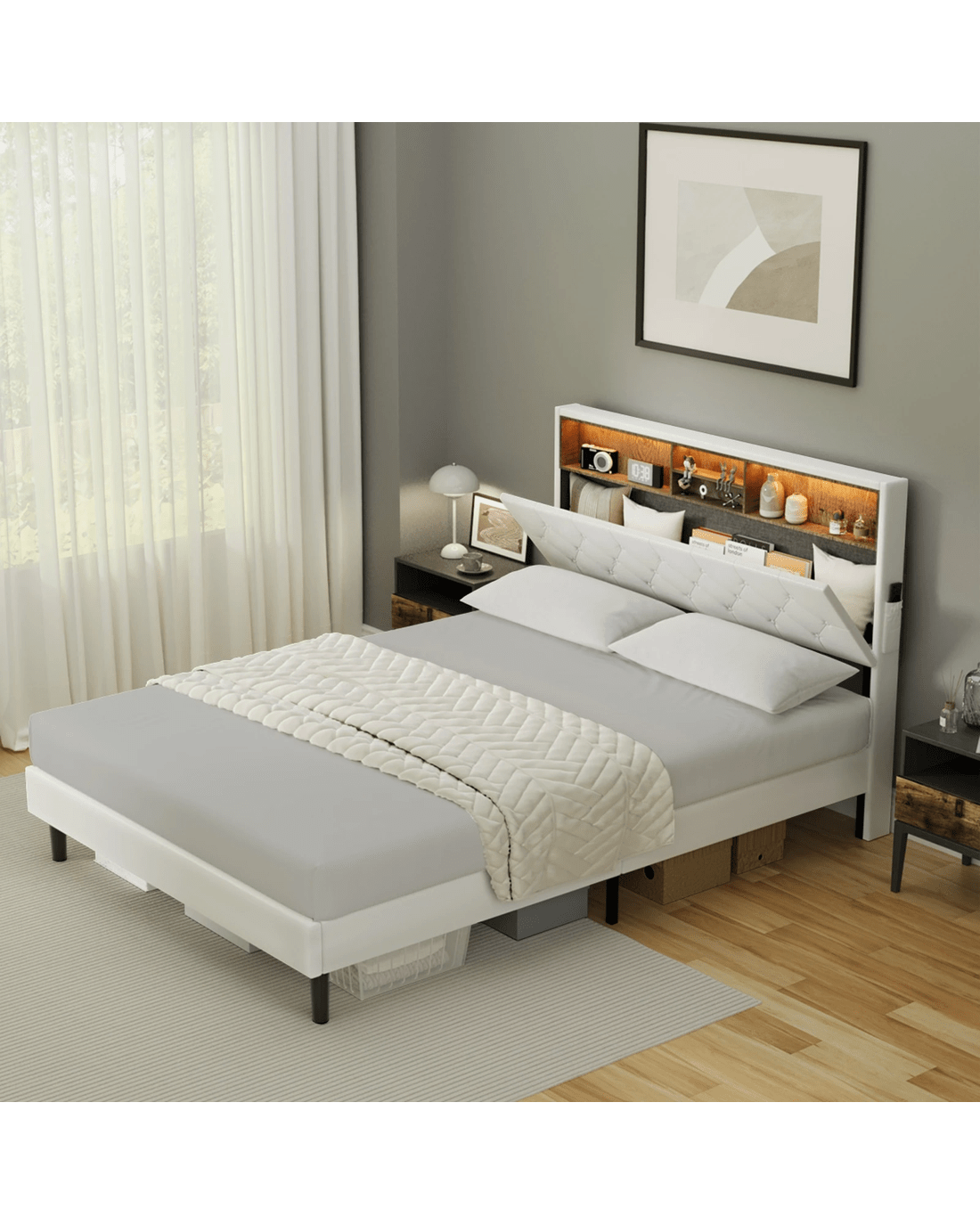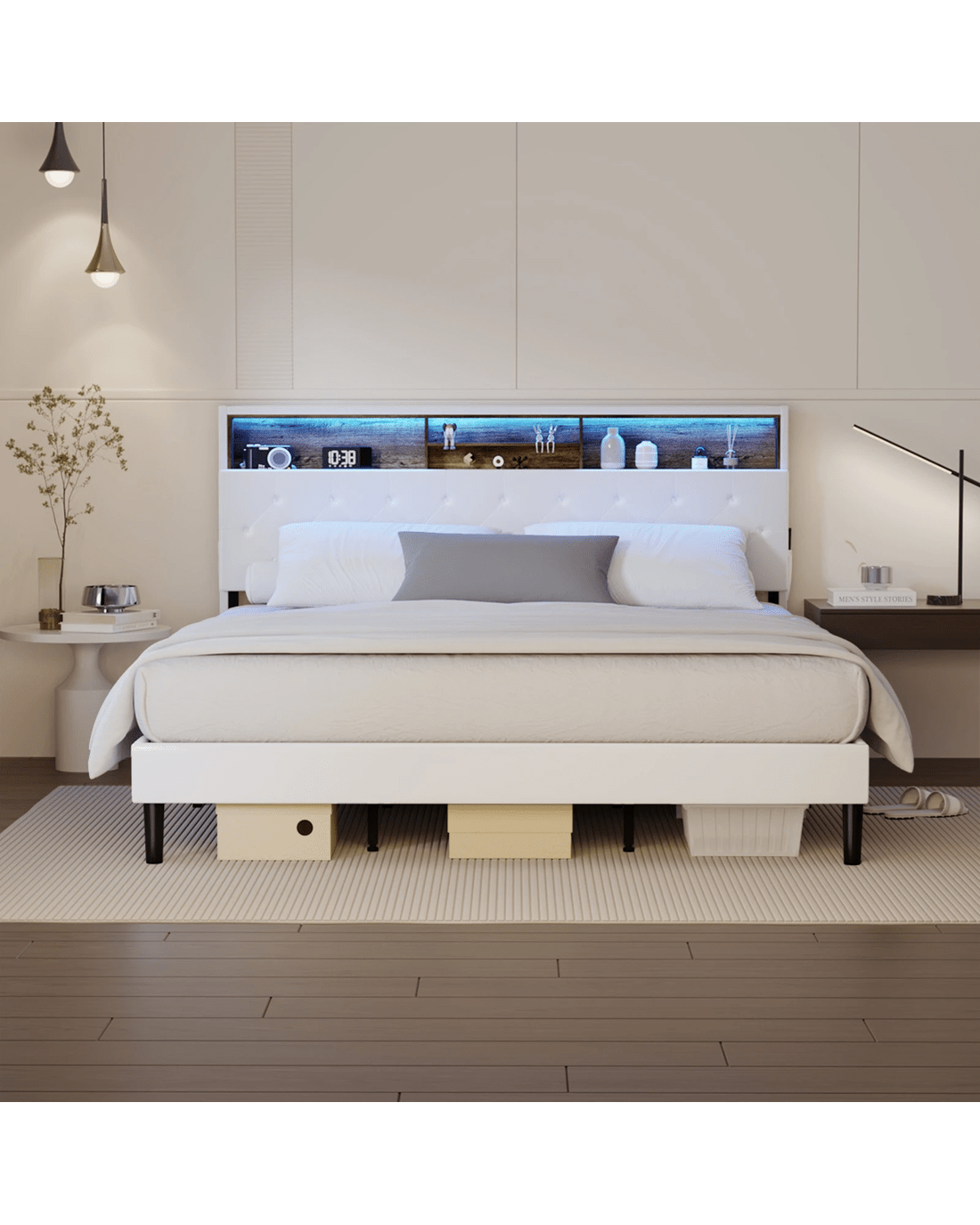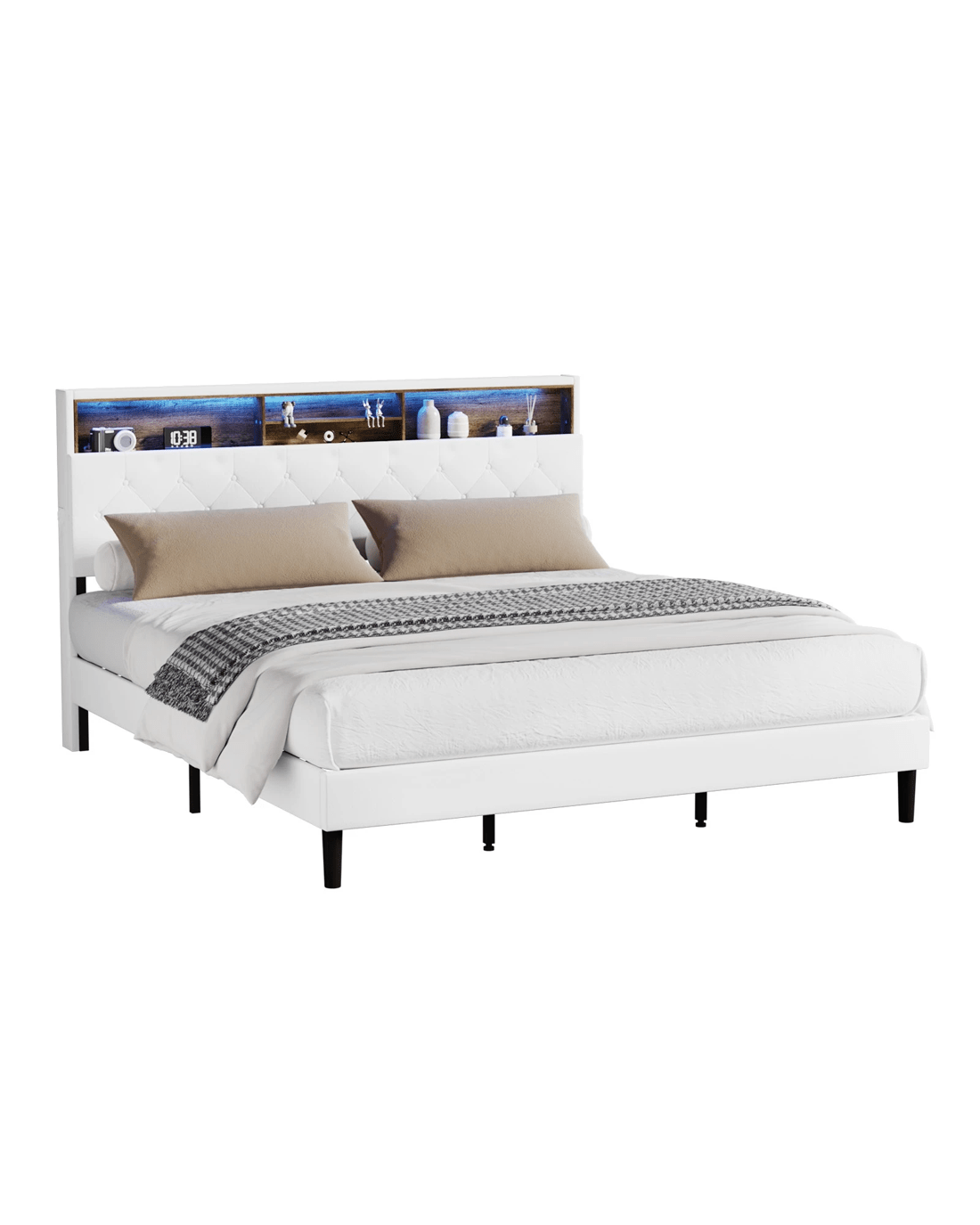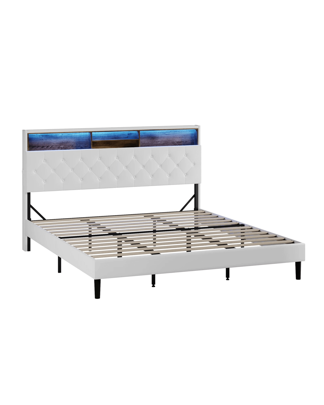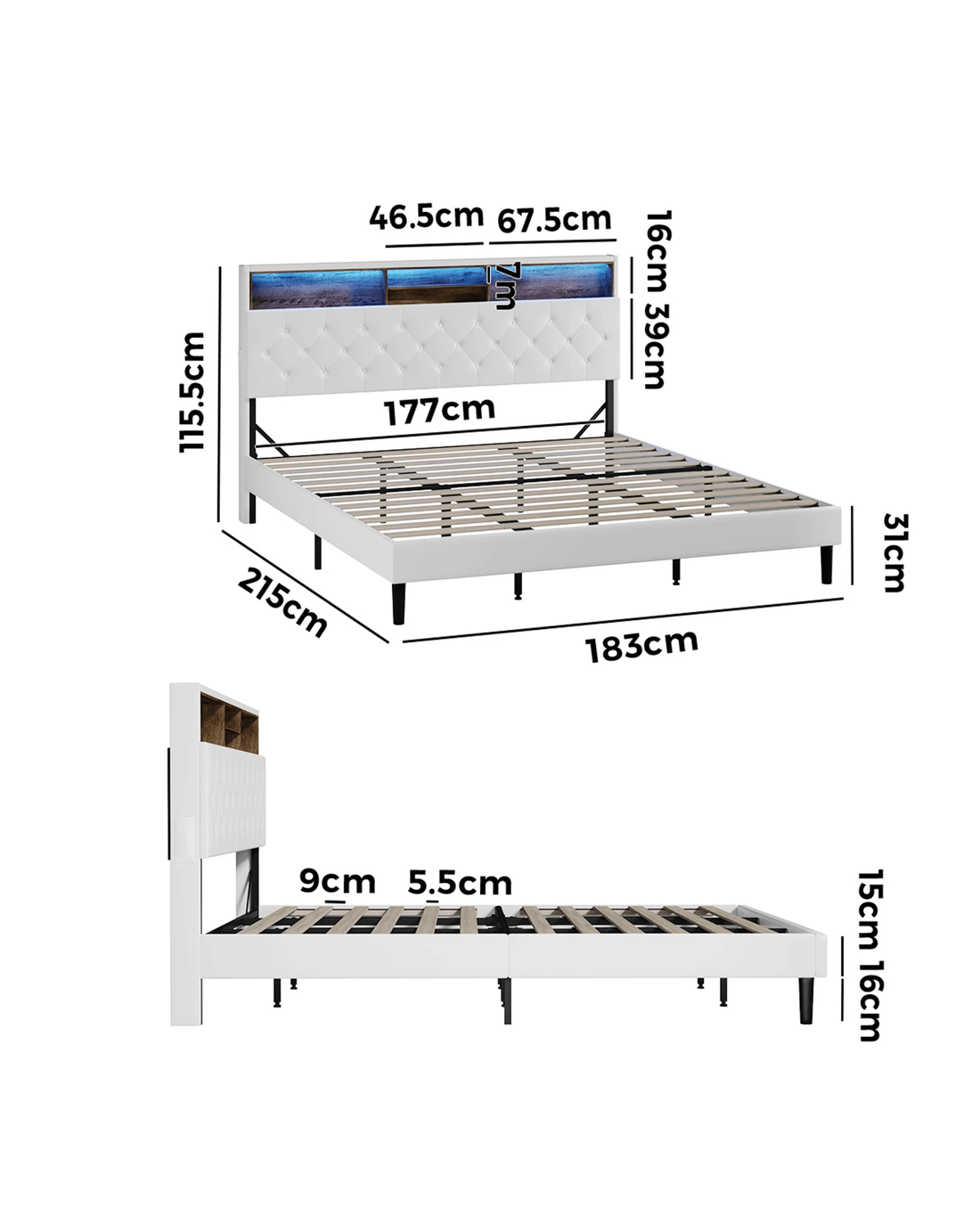 Sold by Kamprad's Oikos 1943Oikiture Bed Frame King Size with LED Storage Bedhead - White