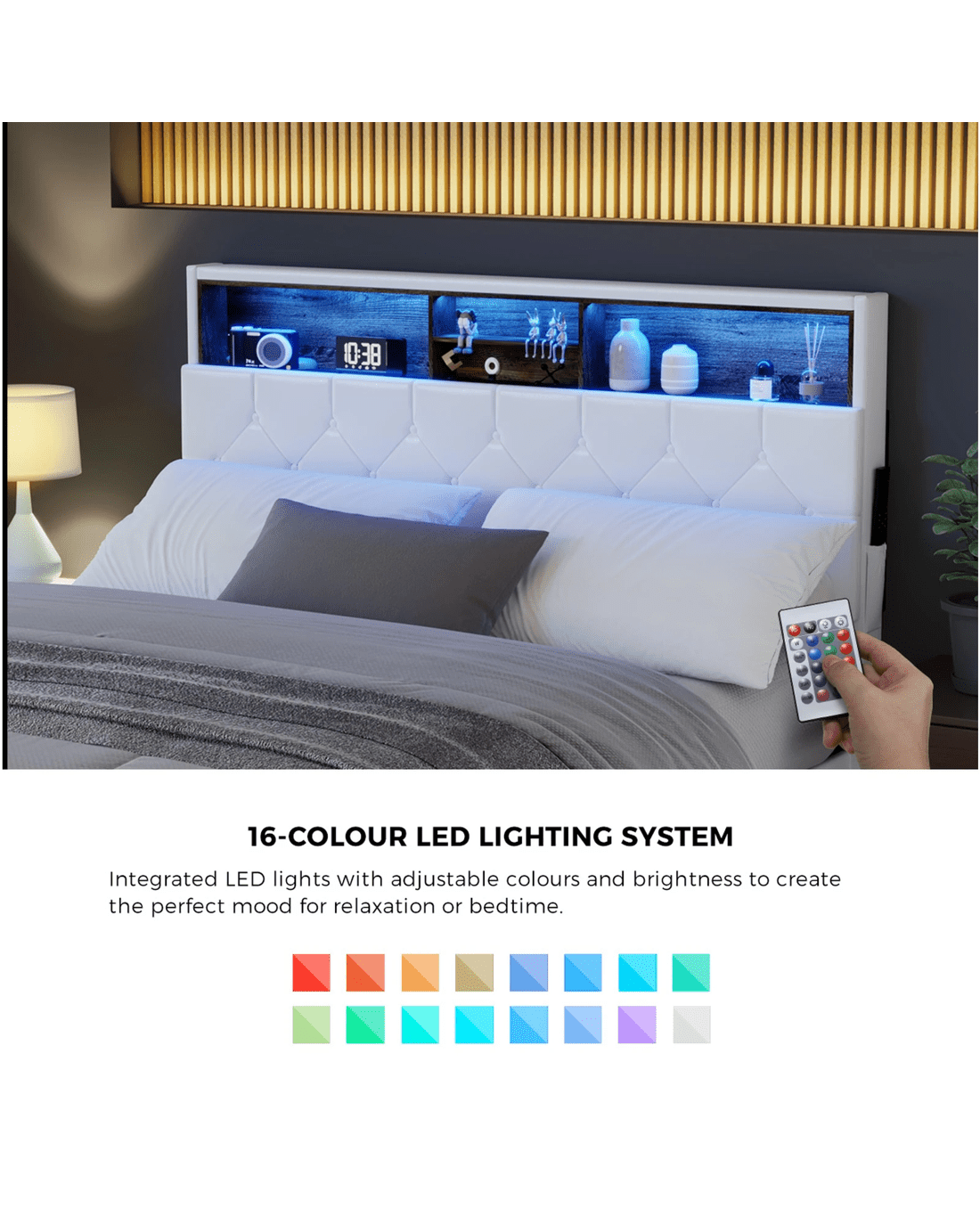 What is even more spectacular is the 16-colour LED light strip that lines the display shelf. An illuminated presence to set the mood and ambience while you carry out your favourite bedside activities. Need a bit more spectacle? Just activate the four flashing modes for a bedside light show. Brilliant!