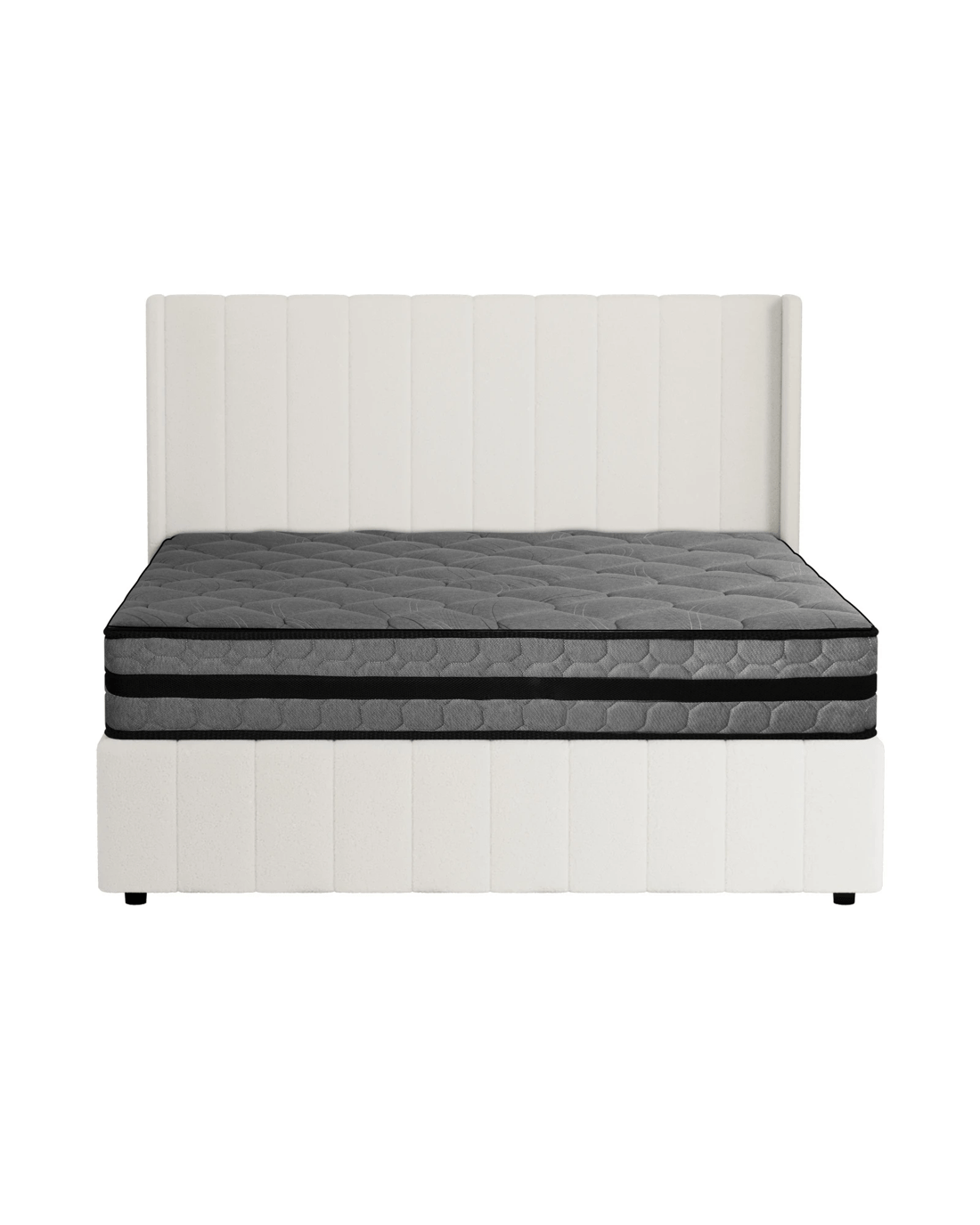 Featuring a well-padded winglet bedhead and bed end design with premium boucle fabric upholstery, the Oikiture Gas-Lift Bed Frame exudes bespoke elegance and adds a luxurious presence to any bedroom decor. Soft to the touch that lends a swank and intimate aura to accompany your calm and restful sleep.