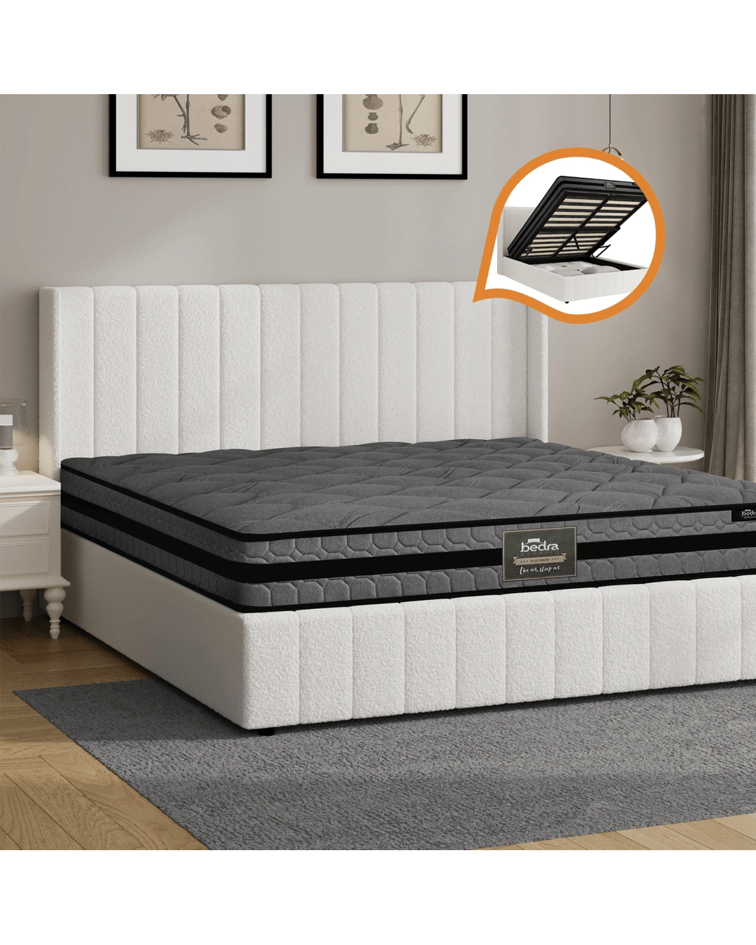 Sold by Kamprad's Oikos 1943Oikiture Bed Frame Queen Size Gas Lift Storage Boucle Beds W/ Mattress Set BILY - White