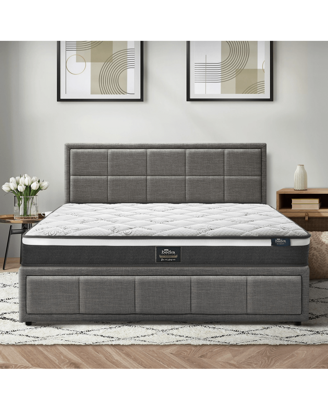 Best of all, the stylish bed frame also includes a comfortable Bedra Bedding Pocket Springs mattress to complete the set. This high-quality spring mattress features all the benefits of an independent pocket springs system that provides reinforced edging, motion isolation, anti-disturbance and full body support. Naturally, the highly breathable mattress complies with all required standards and certification and is hygienically safe from top to bottom and everything else in between.