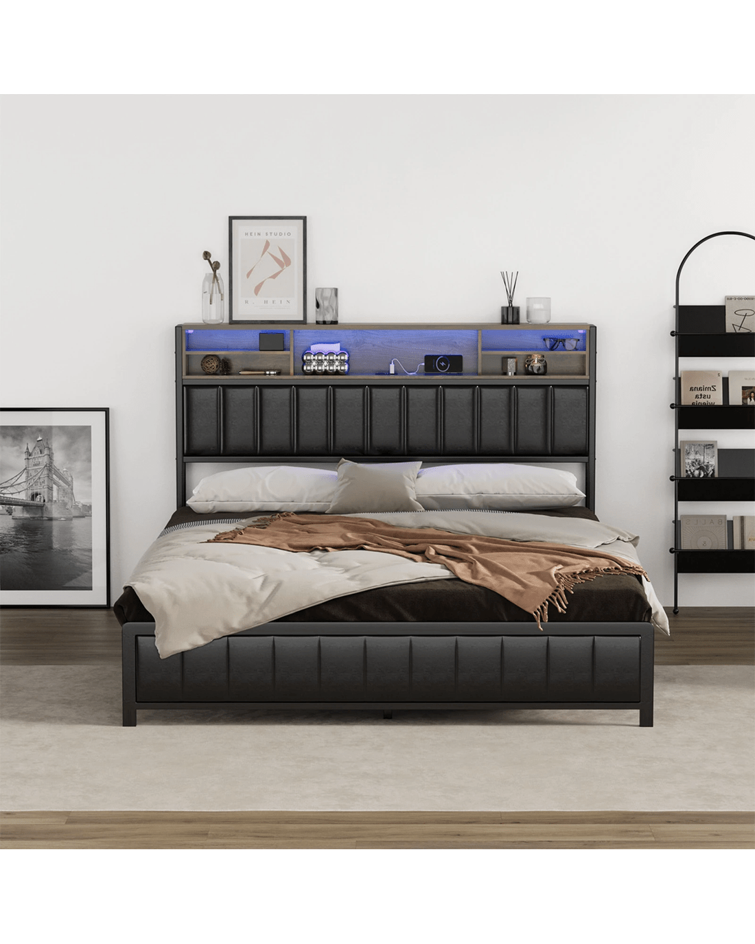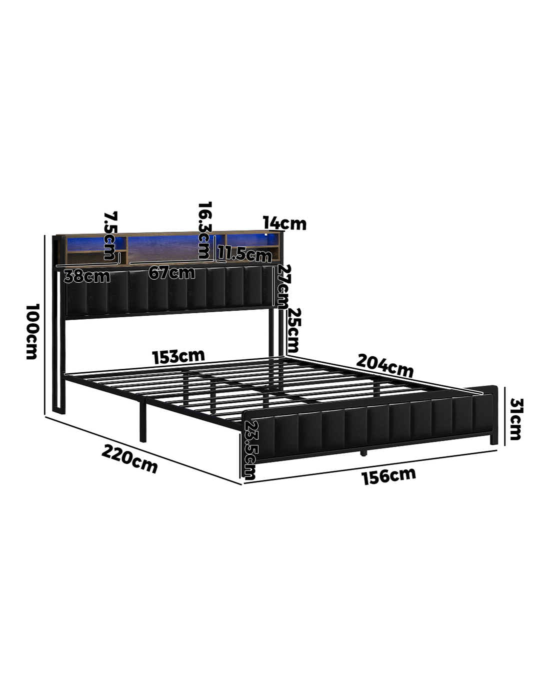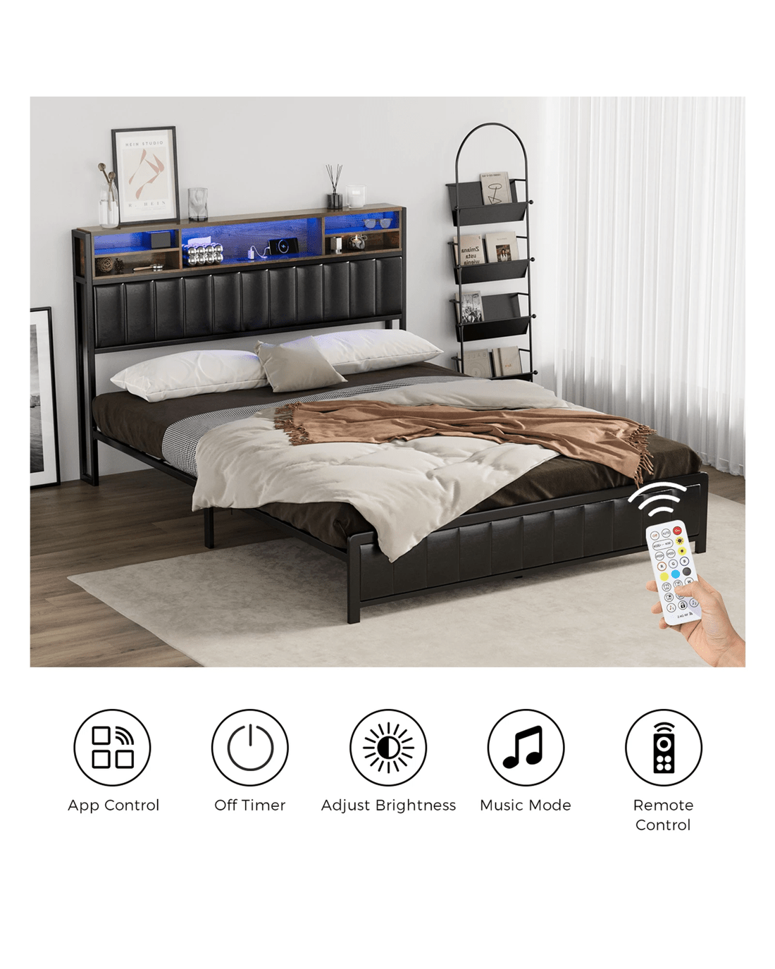 Sold by Kamprad's Oikos 1943Oikiture Bed Frame Queen Size LED Storage Headboard With USB Charge - Black