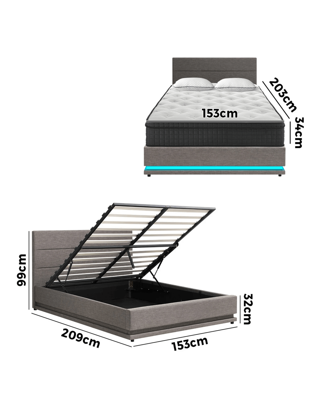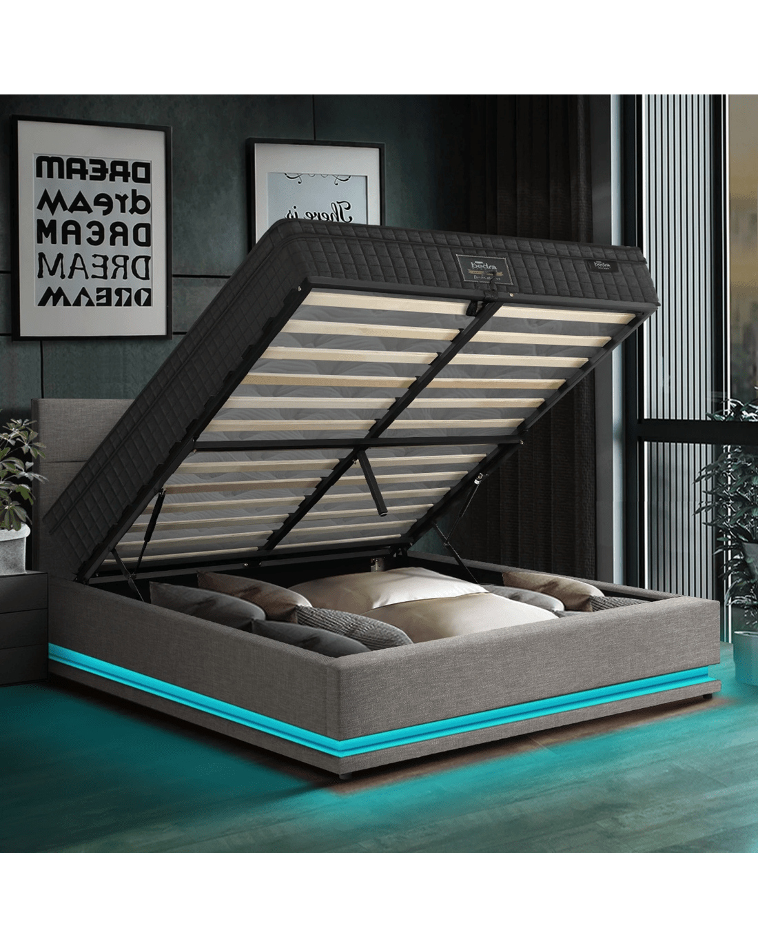 Sold by Kamprad's Oikos 1943Oikiture Bed Frame Queen Size LED with Gas Lift Storage Mattress Set LAYZ - Grey
