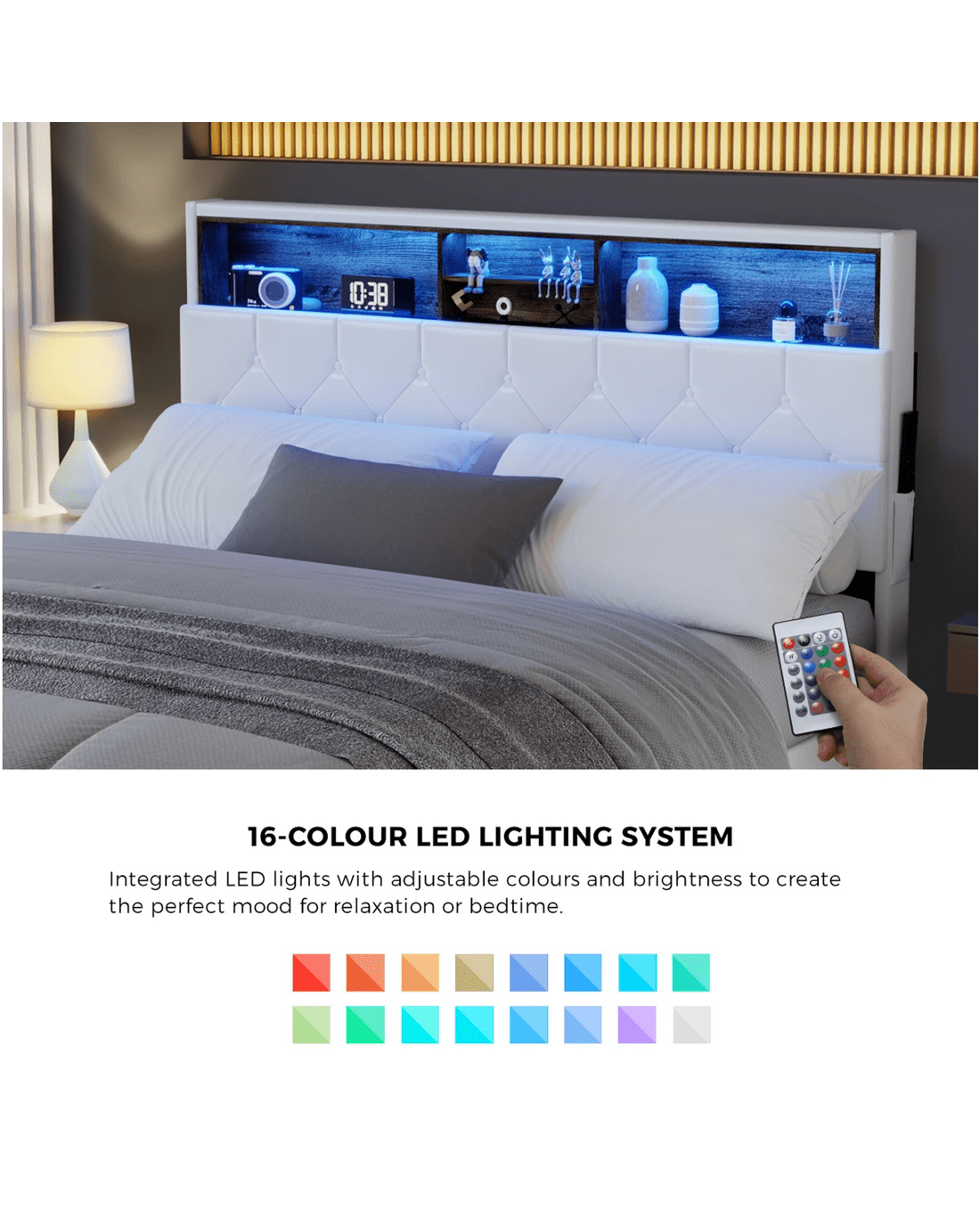 What is even more spectacular is the 16-colour LED light strip that lines the display shelf. An illuminated presence to set the mood and ambience while you carry out your favourite bedside activities. Need a bit more spectacle? Just activate the four flashing modes for a bedside light show. Brilliant!
