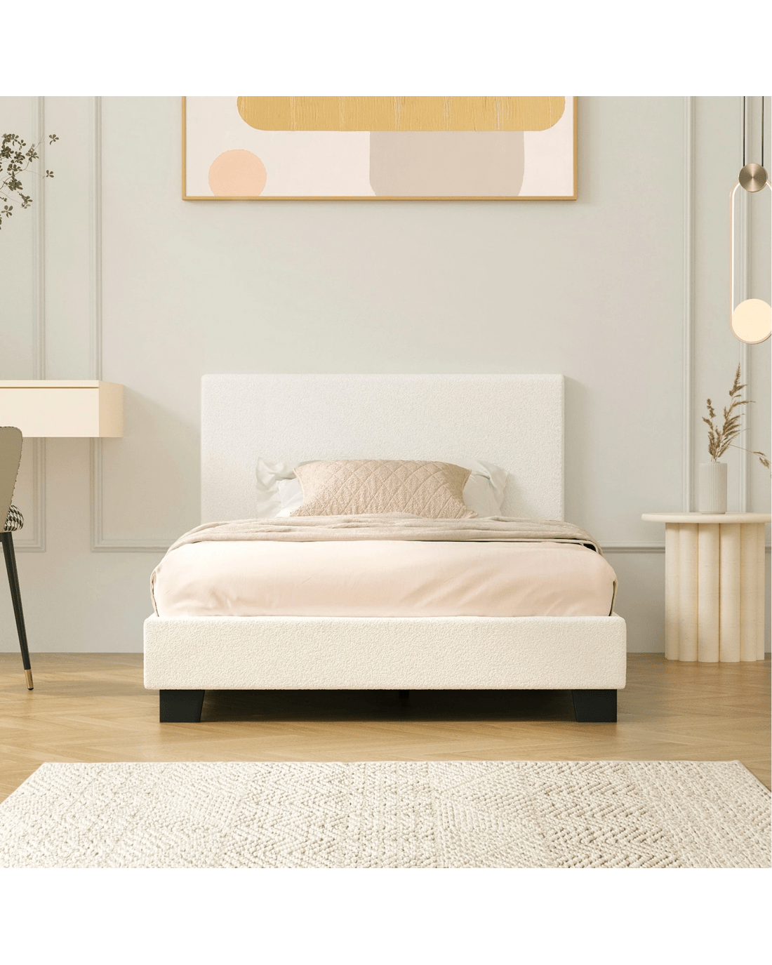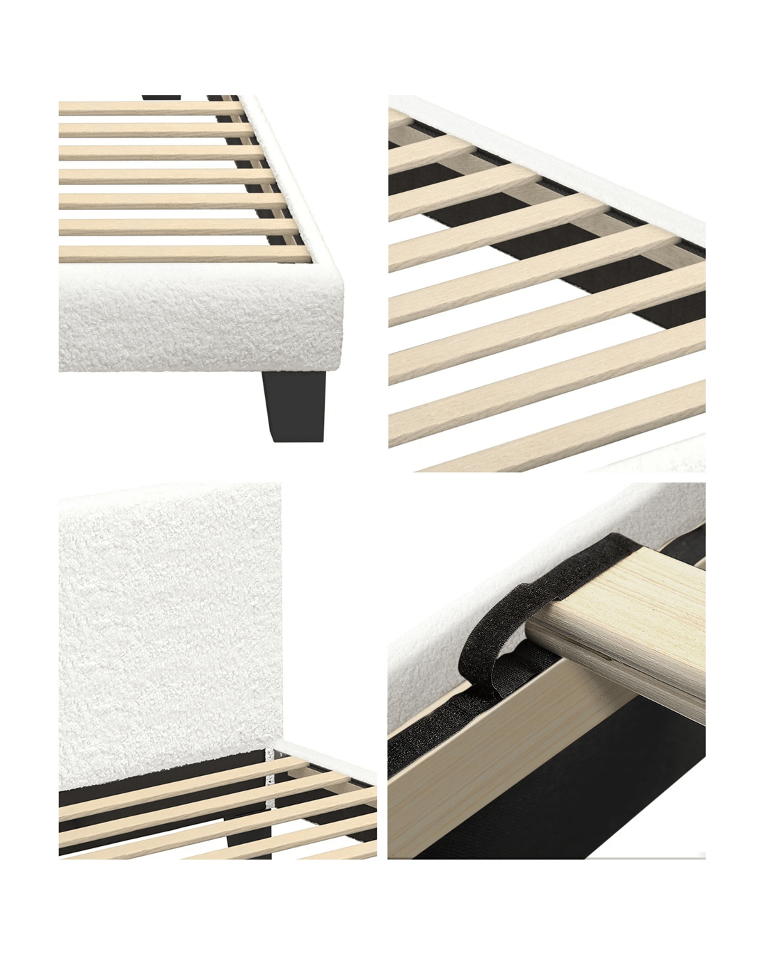 Create a calming bedroom with our Boucle Fabric series bed frame. Fitted with solid legs and plywood slats that designed with Velcro to hold it on the platform bed in place, this bed brings you the extra security that you need to get a good sleep throughout the night.