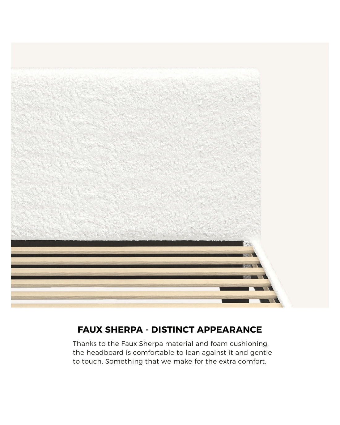 Finished in distinct wool-like appearance, the bedhead and frame are fitted with Sherpa material that is gentle to touch. You can lean against the headboard and feel the foam cushioned while reading a book or watching TV on your bed.