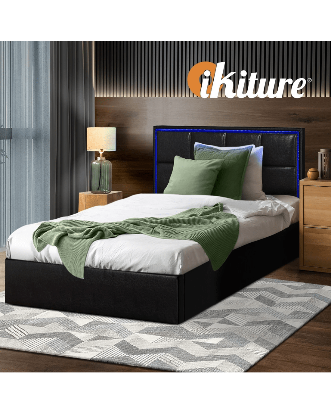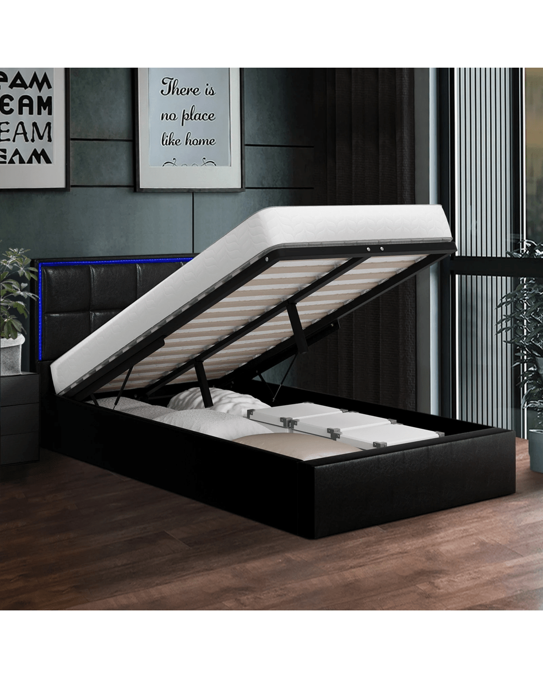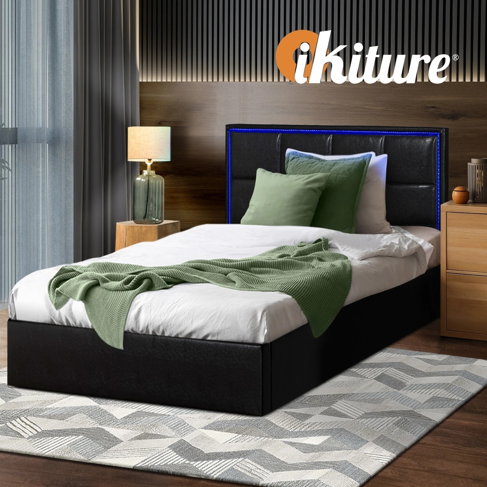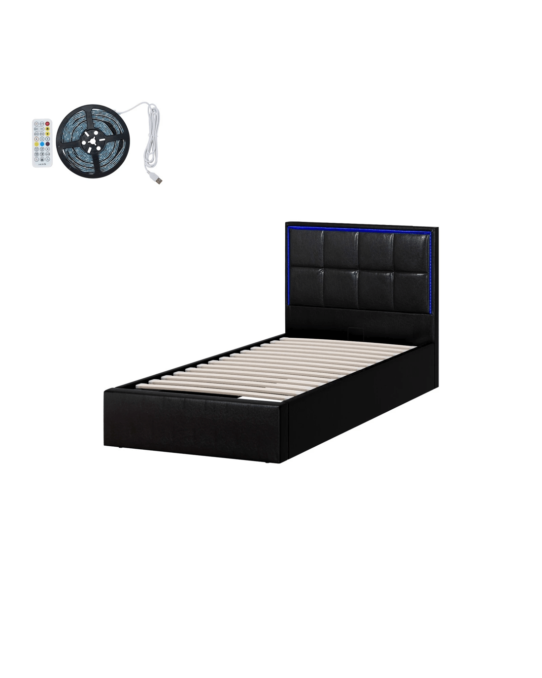 Oikiture Bed Frame Single Size RGB LED Gas Lift Storage Base Leather - Black
