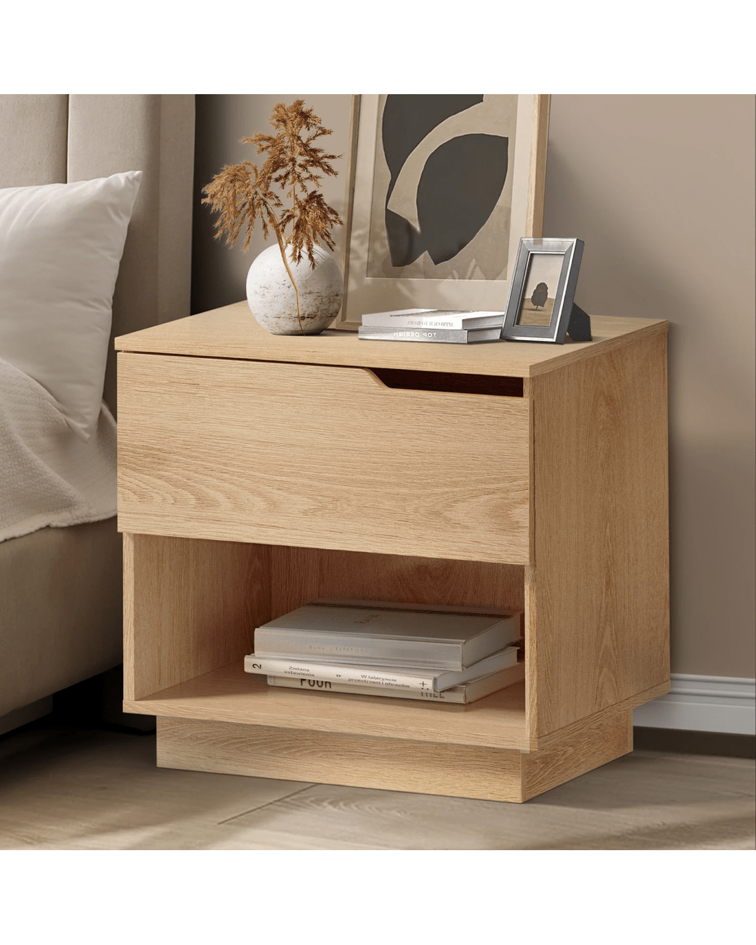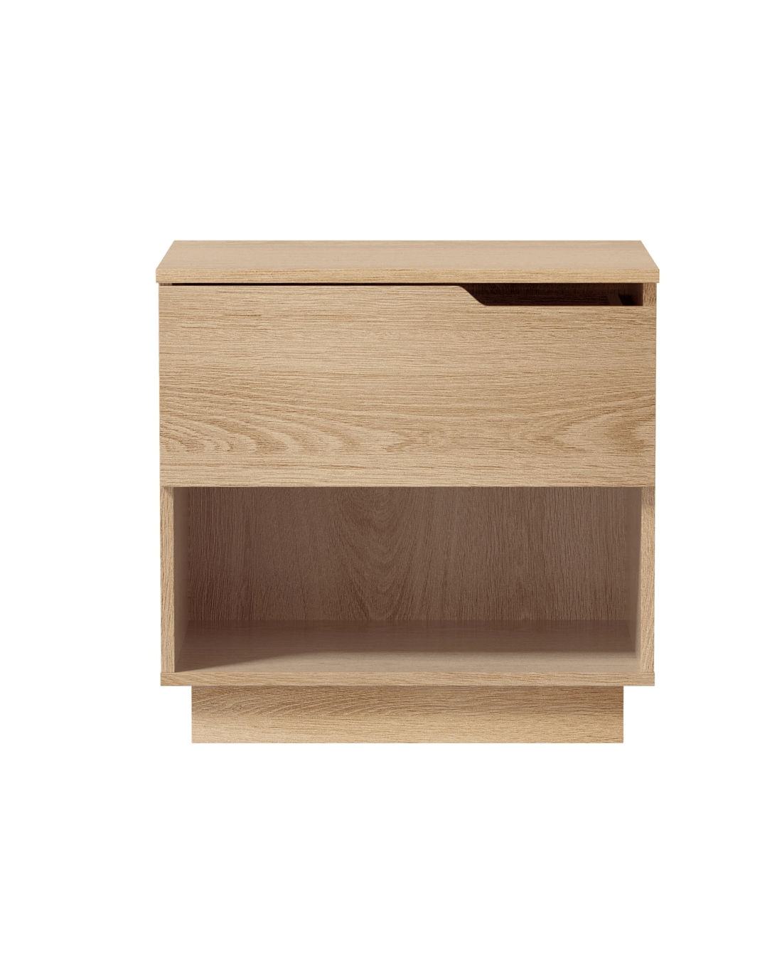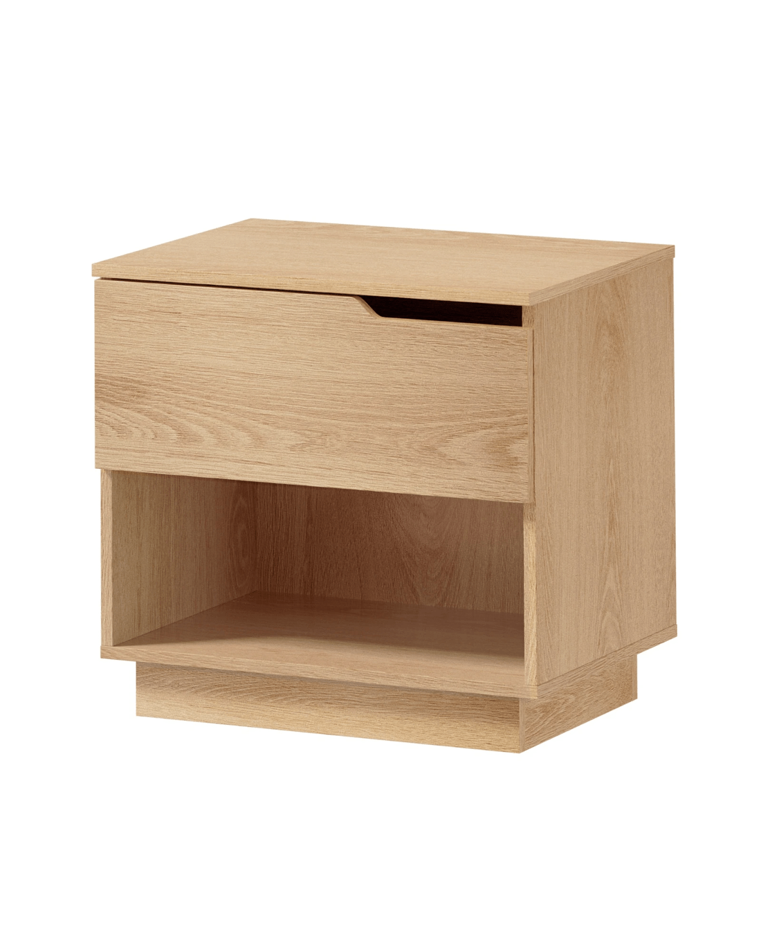 Our Oikiture Bedside Table features a natural wood-like finish with tasteful wood grain textures to create depth and character. Made with quality materials for durability, our bedside table, with single drawer with open shelf, provides ample storage solutions to meet your requirements.