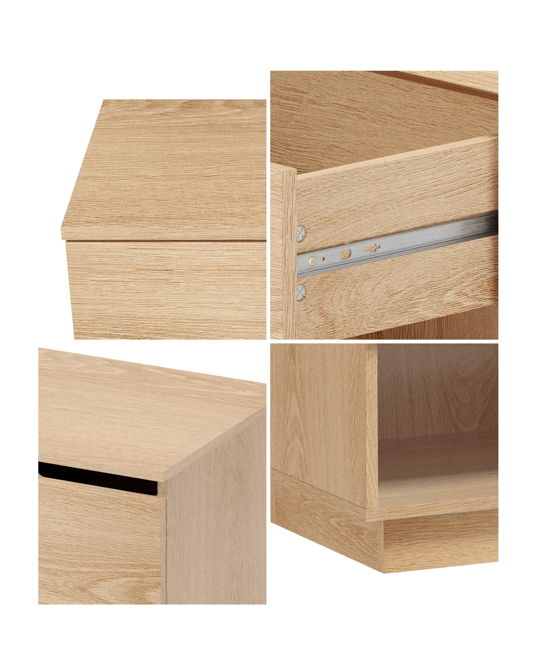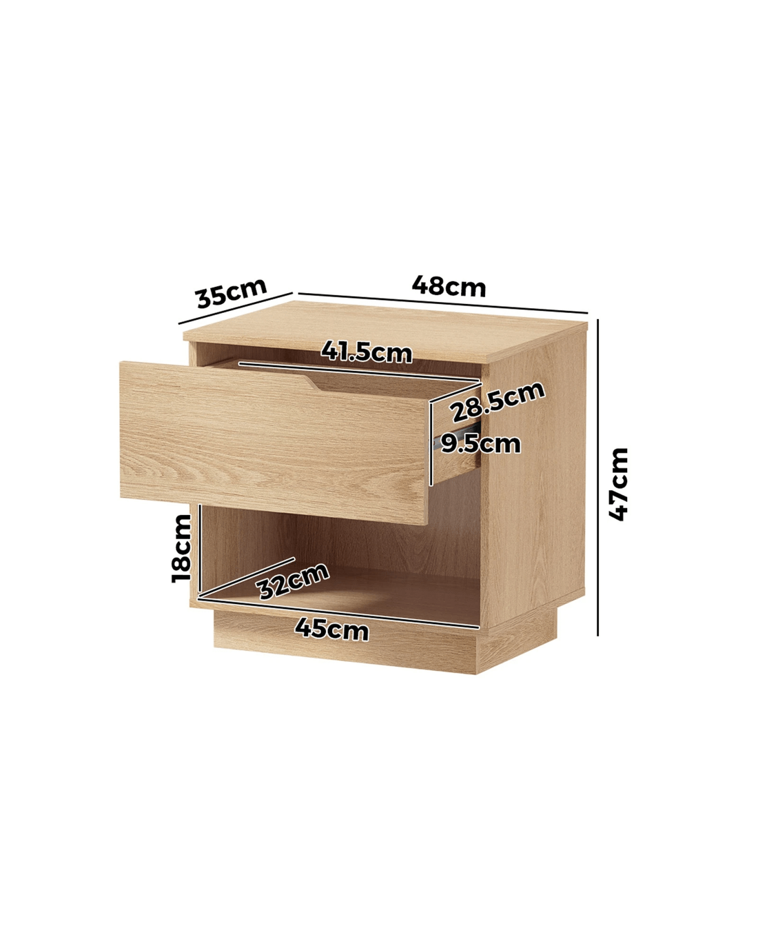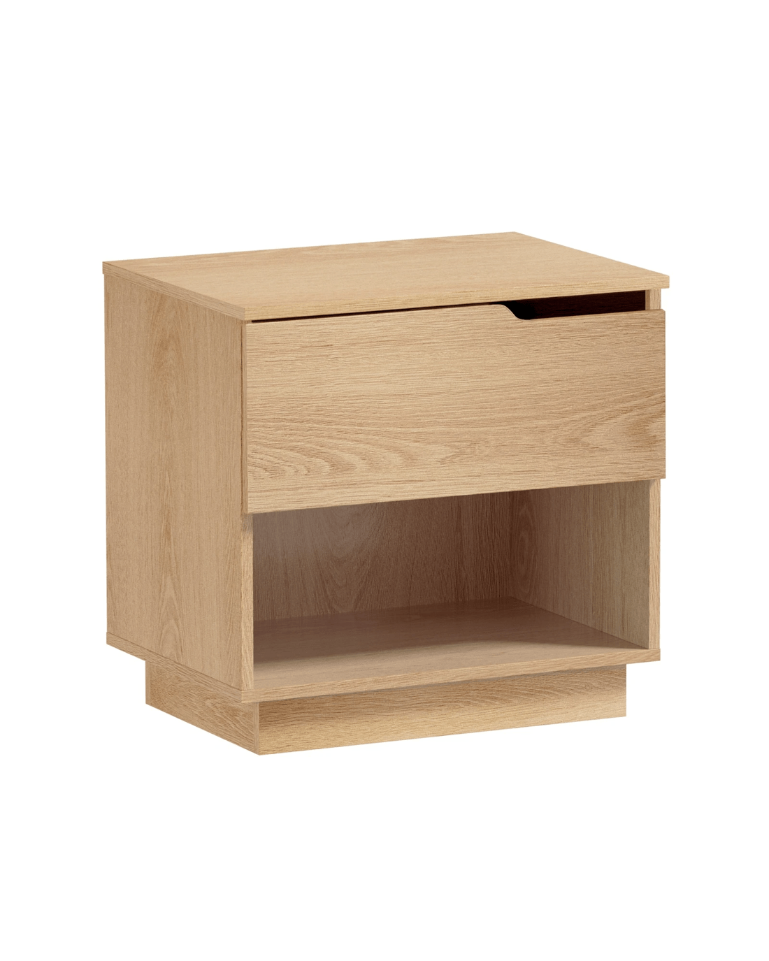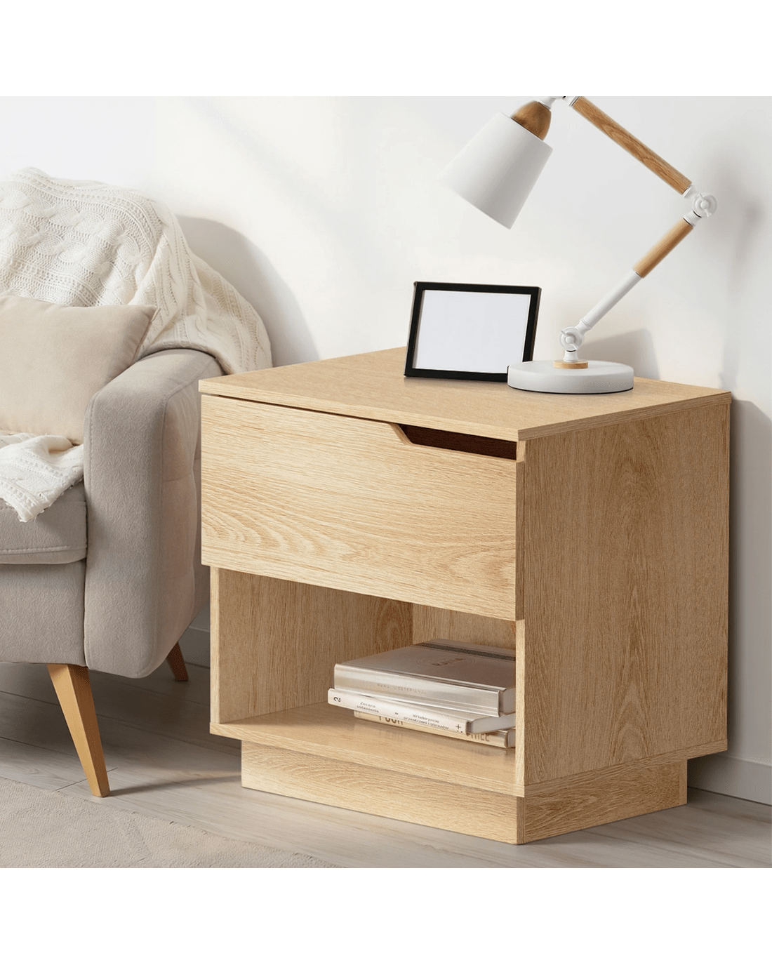 Our Oikiture Bedside Table features a natural wood-like finish with tasteful wood grain textures to create depth and character. Made with quality materials for durability, our bedside table, with single drawer with open shelf, provides ample storage solutions to meet your requirements.