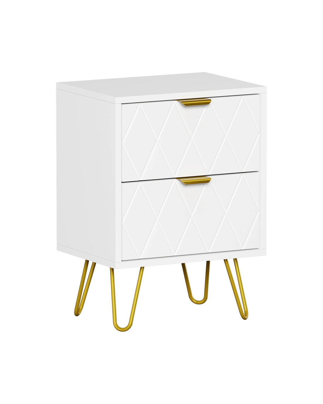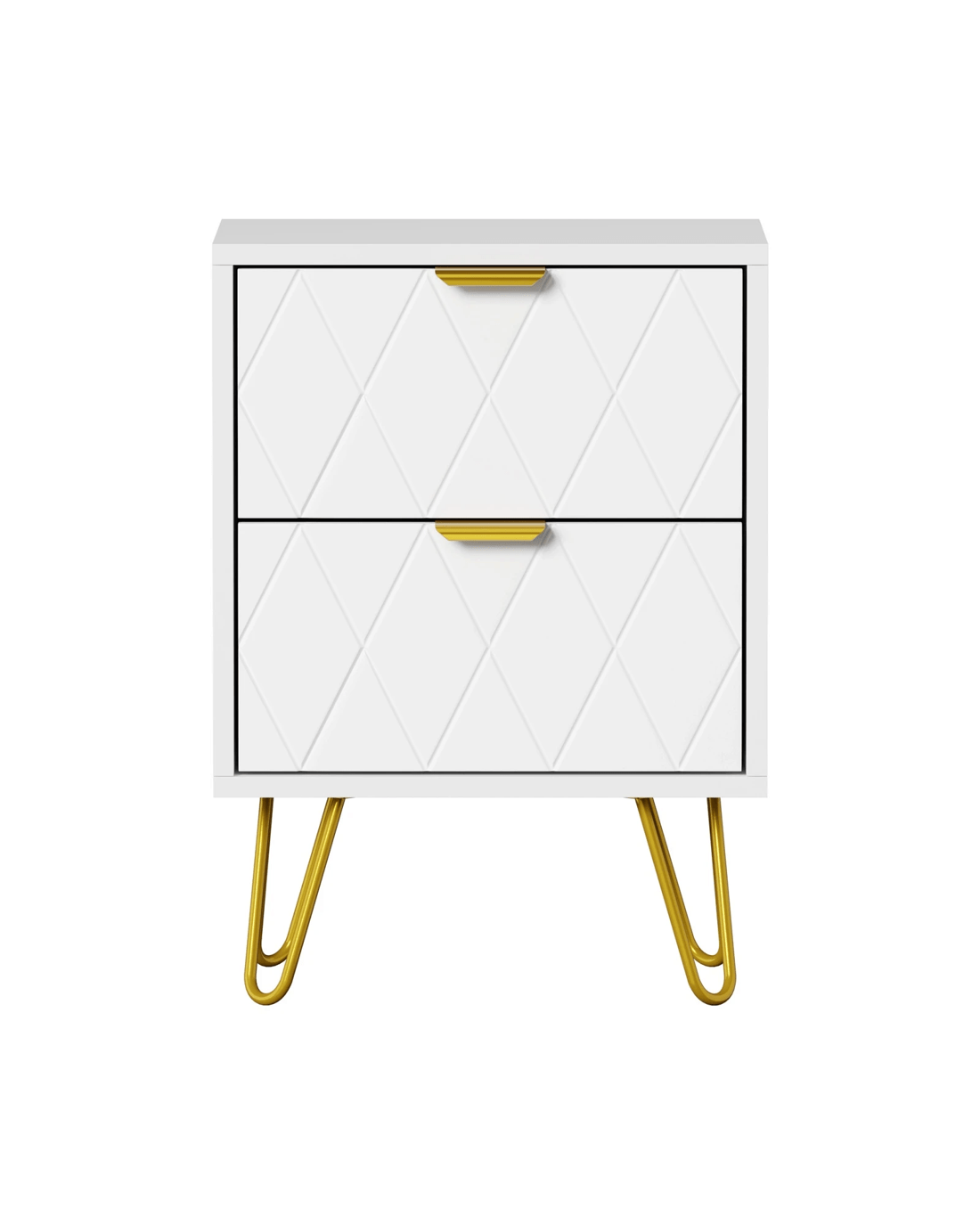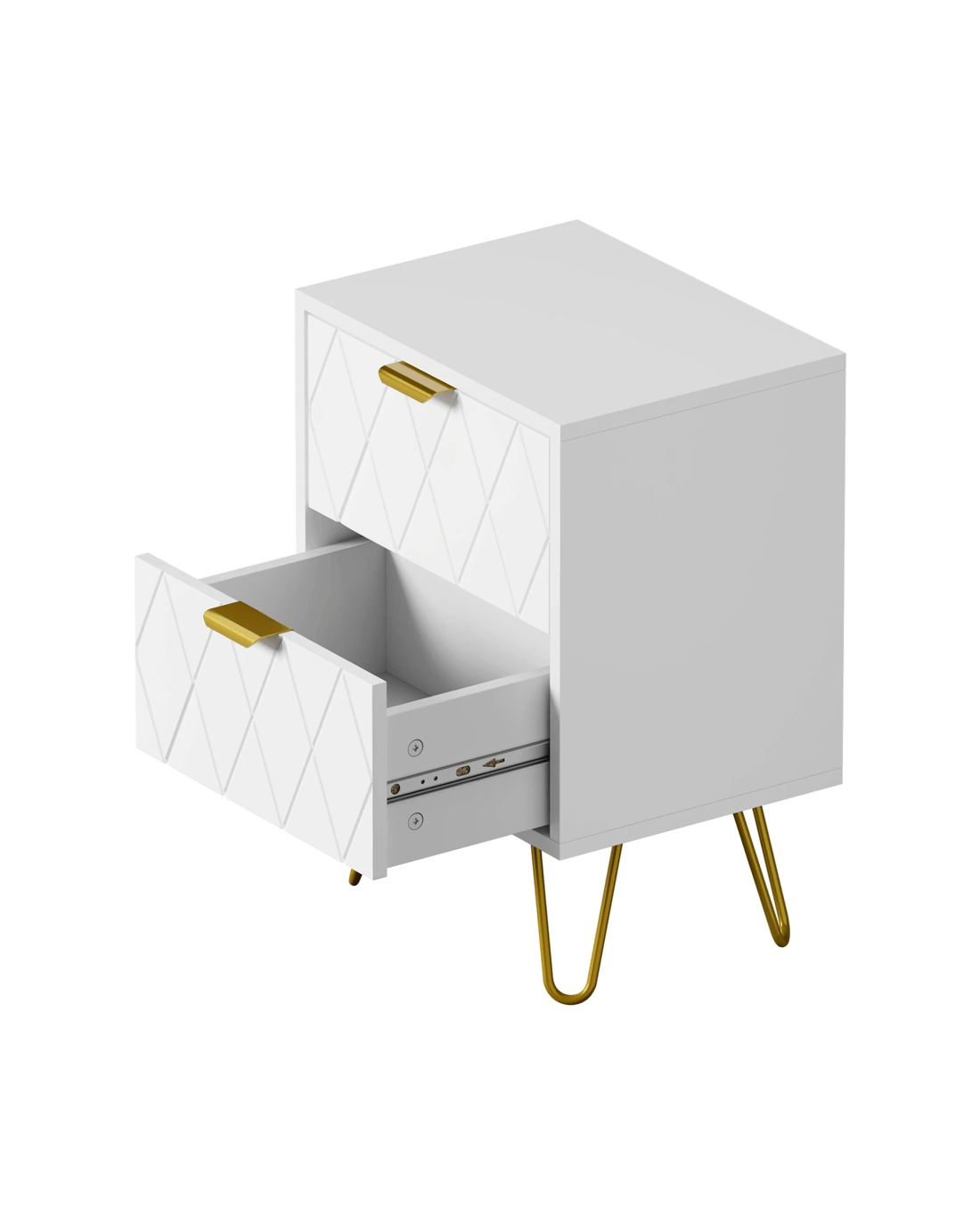 Looking resplendent in white and gold, the bedside table has all the vibes of an eclectic classic design that stands out from the ordinary. With character and presence to add an artistic touch to your decor. The two drawers, with its slanted lines front panel and gold-plated metal handles, are blessed with ample space with easy opening and closing.