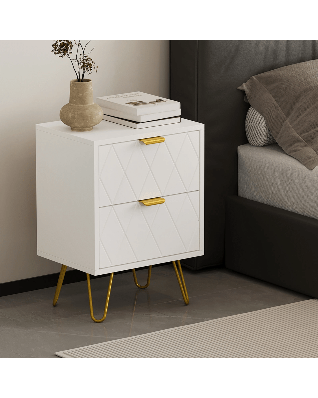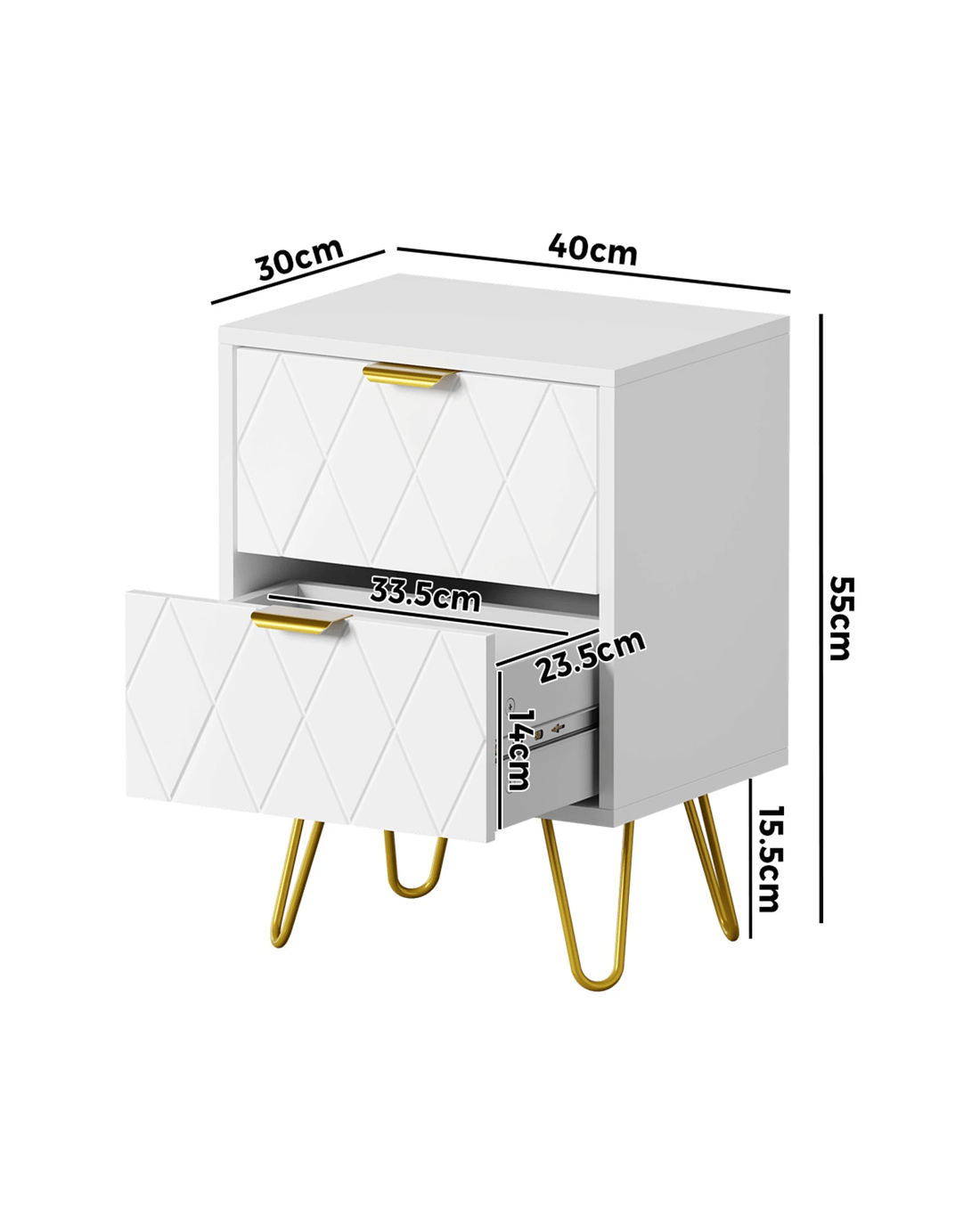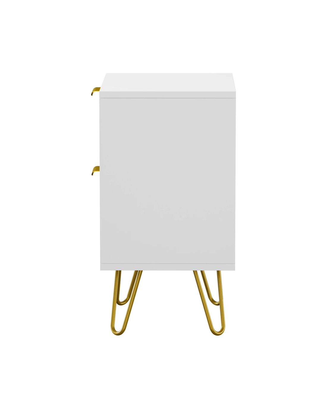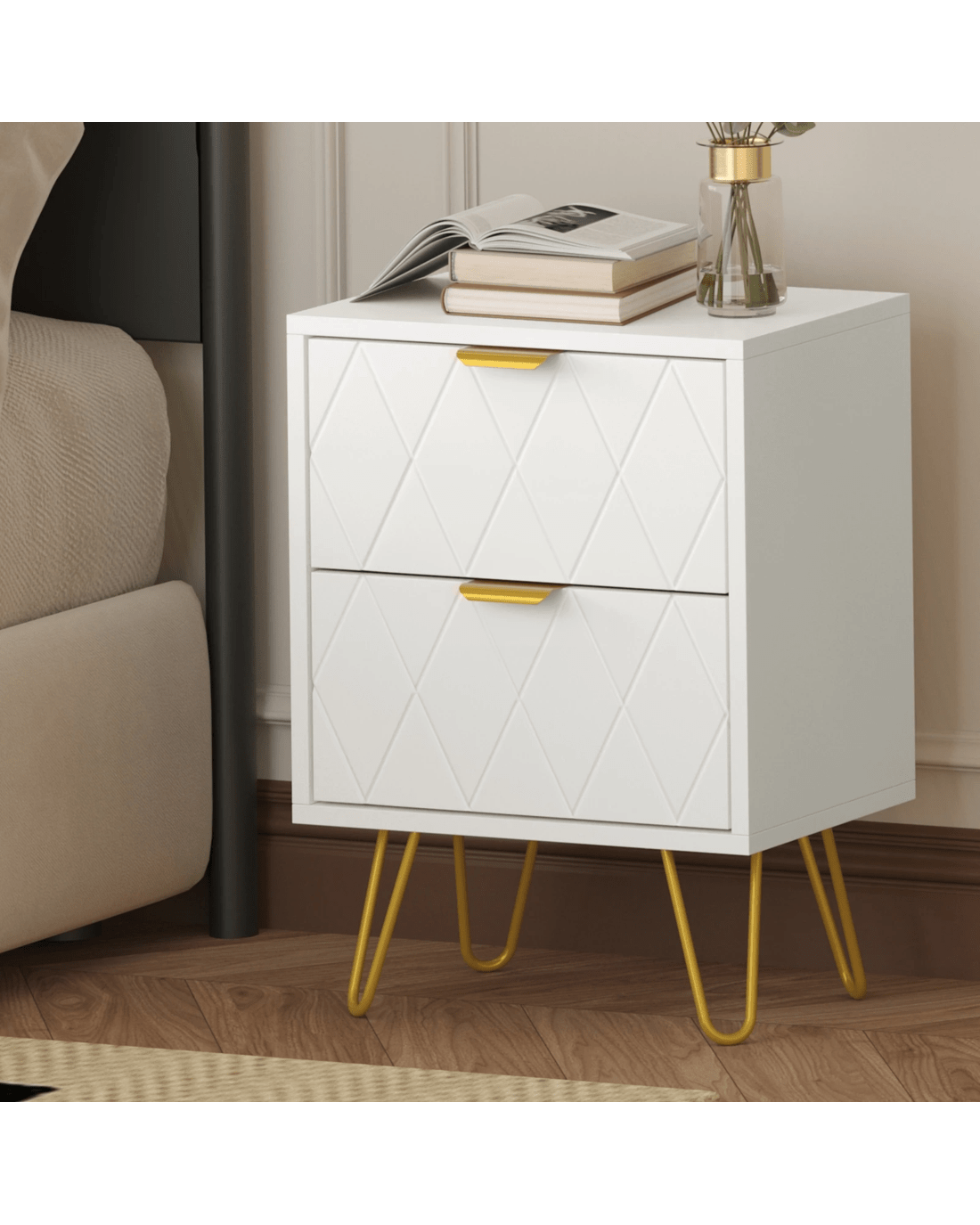 Looking resplendent in white and gold, the bedside table has all the vibes of an eclectic classic design that stands out from the ordinary. With character and presence to add an artistic touch to your decor. The two drawers, with its slanted lines front panel and gold-plated metal handles, are blessed with ample space with easy opening and closing.