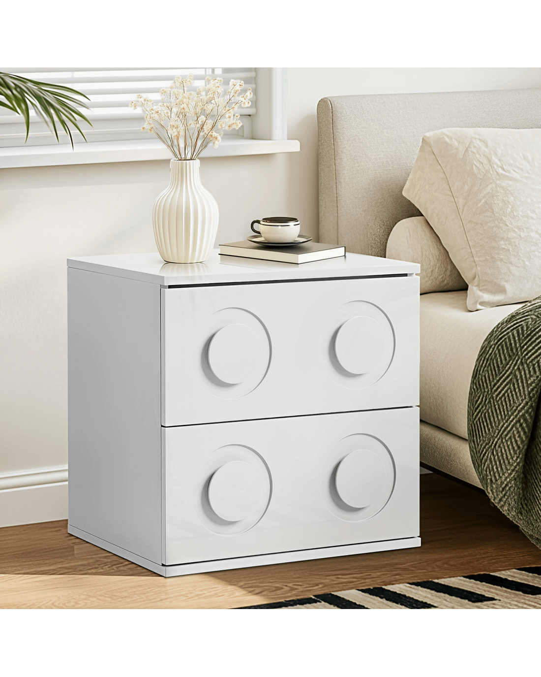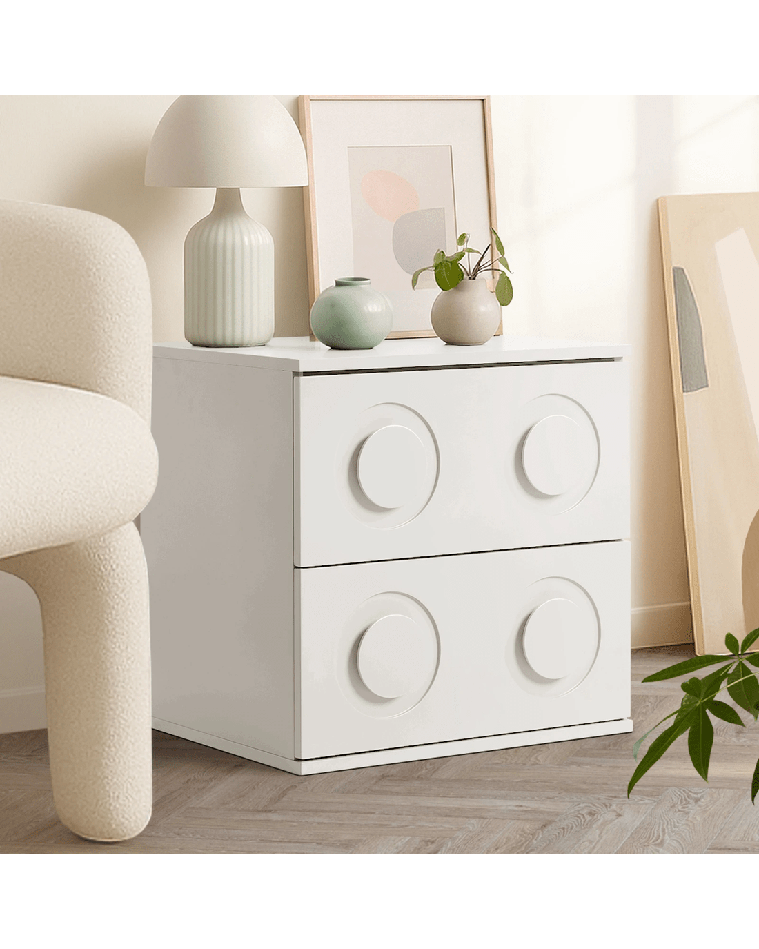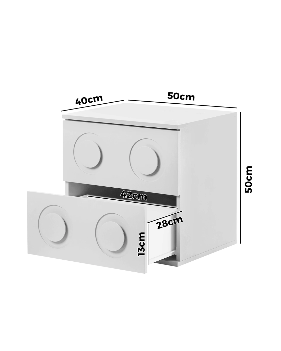 In terms of style, the bedside table, with its dots profile, has all the vibes of a quirky post-modern piece that stands out from the ordinary. With character and presence to add an artistic touch to your decor. The two drawers, with unique dot-like handles, are blessed with ample space with easy opening and closing.