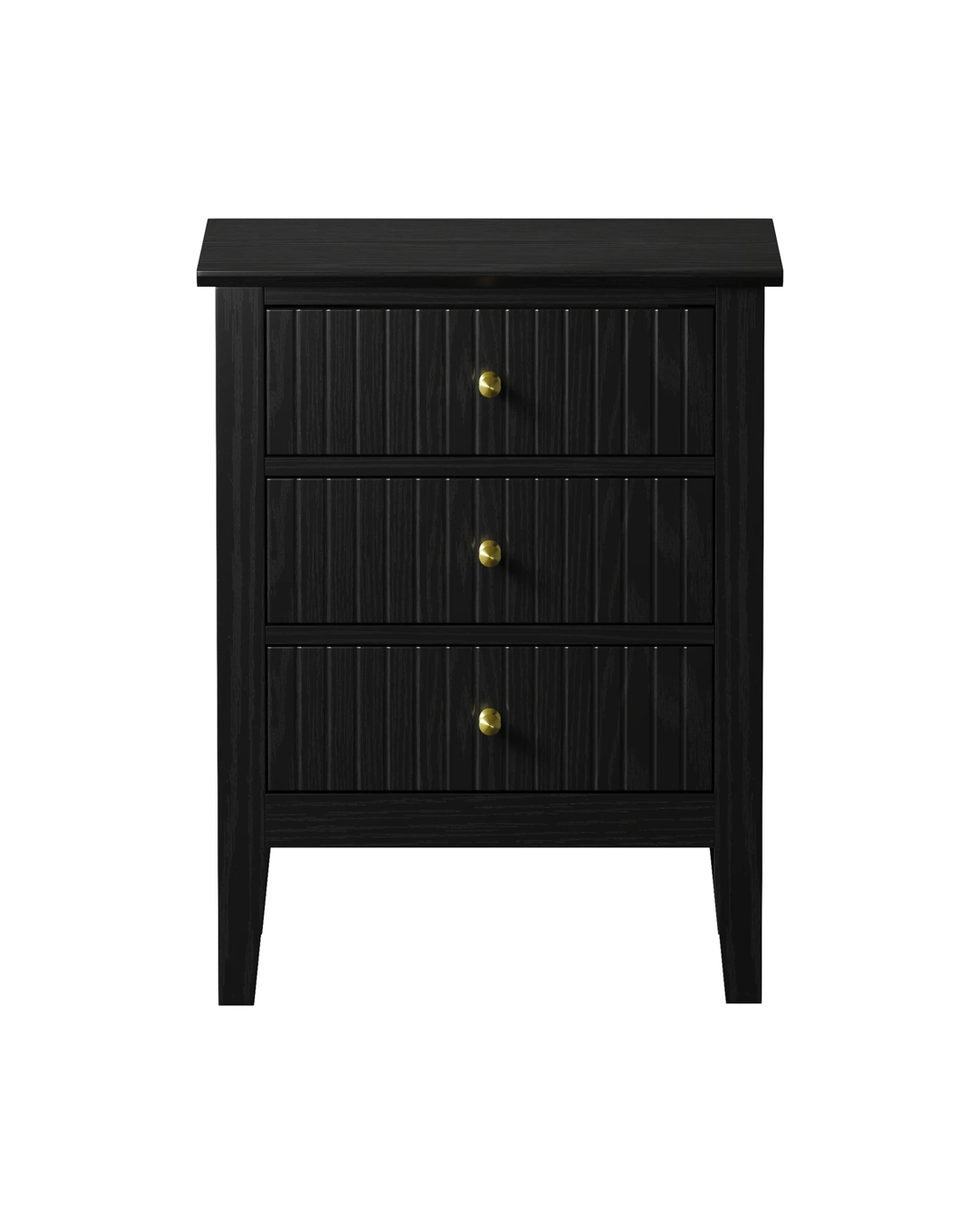 In terms of style, the bedside table has all the vibes of a cottage-inspired piece that stands out from the ordinary. With character and presence to add a rustic touch to your decor. The triple drawers, with stripe textured fronts, are blessed with ample space whilst the auric-hue brass handles make for easy opening and closing besides their aesthetic qualities.