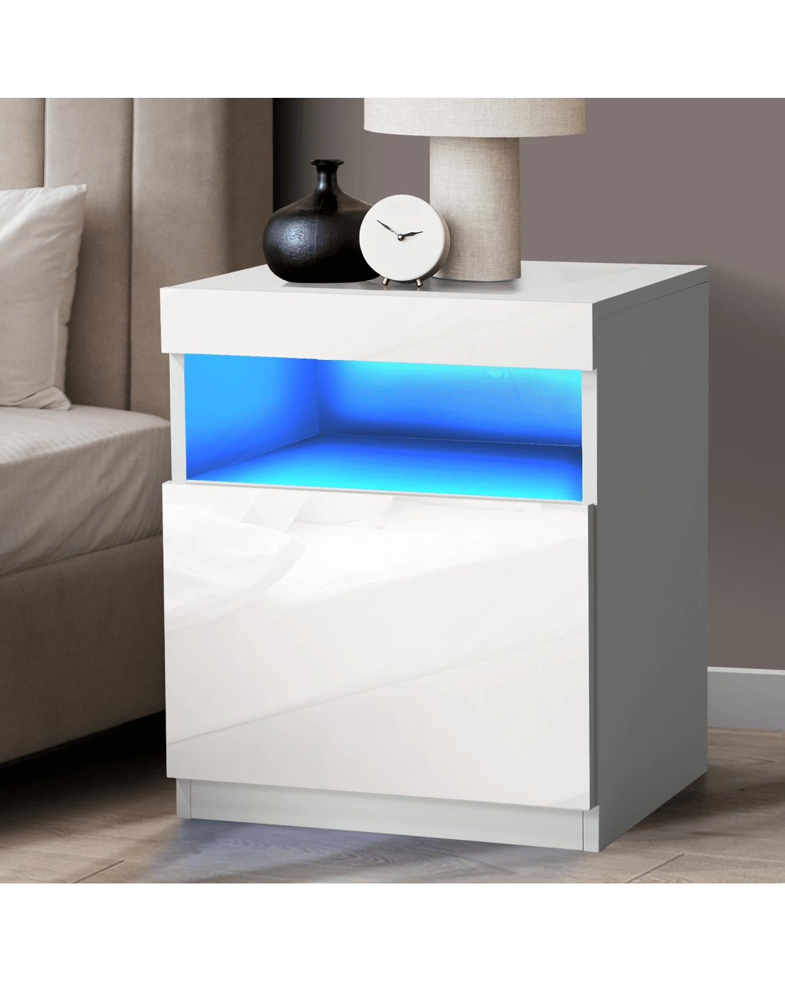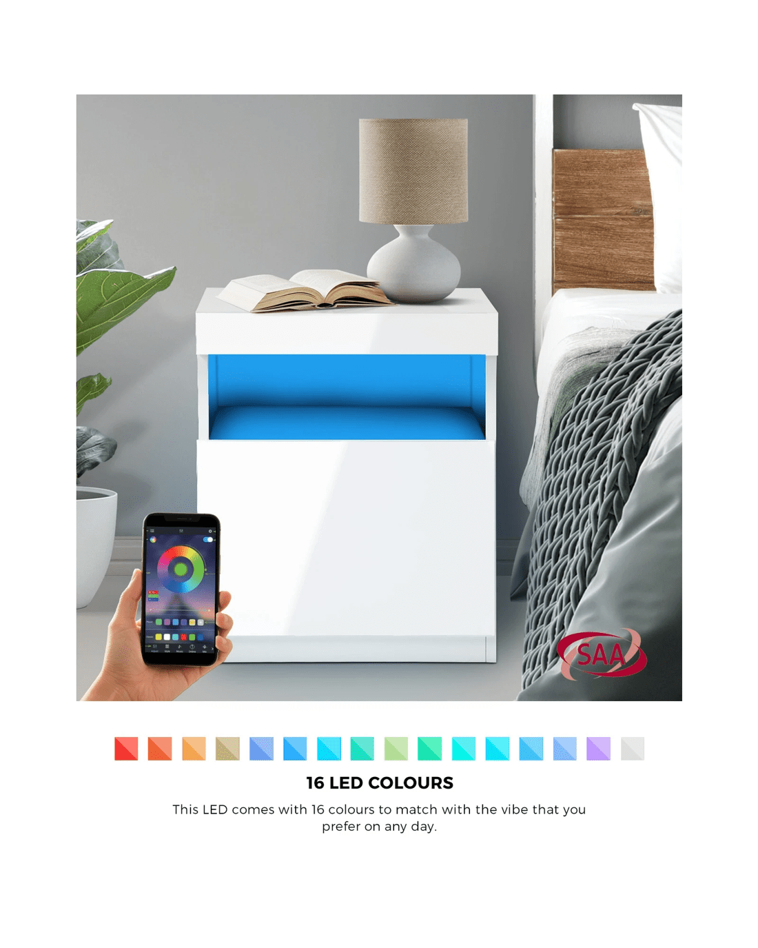 But wha's really astounding about this bedside table is the customisable LED lighting with 16 colours and 4 flashing modes to create a spectacular lightshow or ambient lighting for perfect rest and relaxation. The bedside table can even be a showcase for your treasured mementos or collectibles with display lighting. Everything is easily set with a handy App downloaded to your mobile device for hassle-free adjustments.Plus, a useful USB port is also built-in for convenient charging or powering of your favourite media devices.