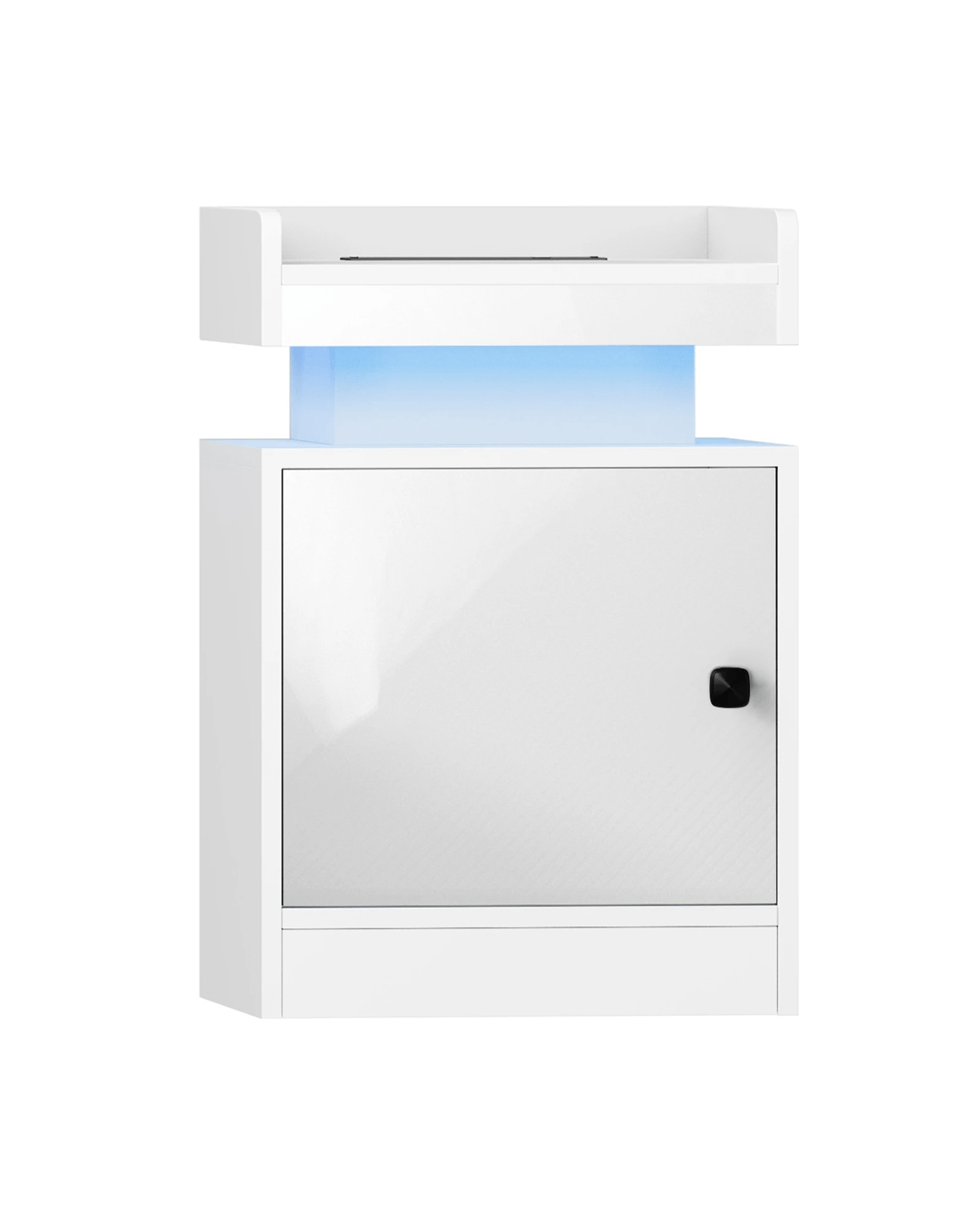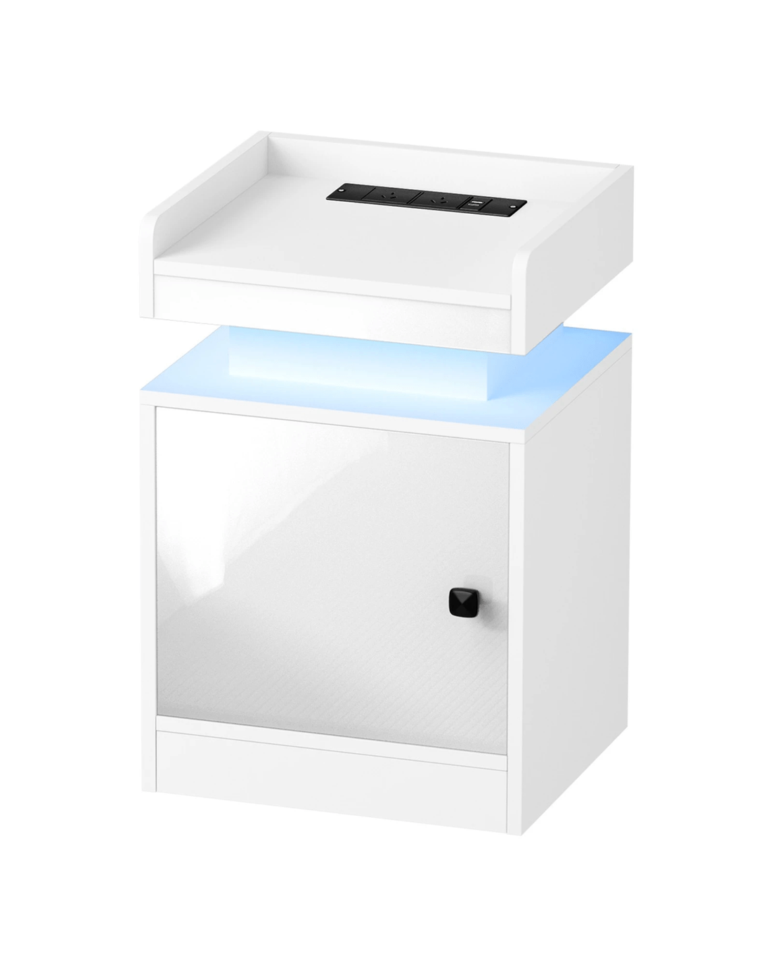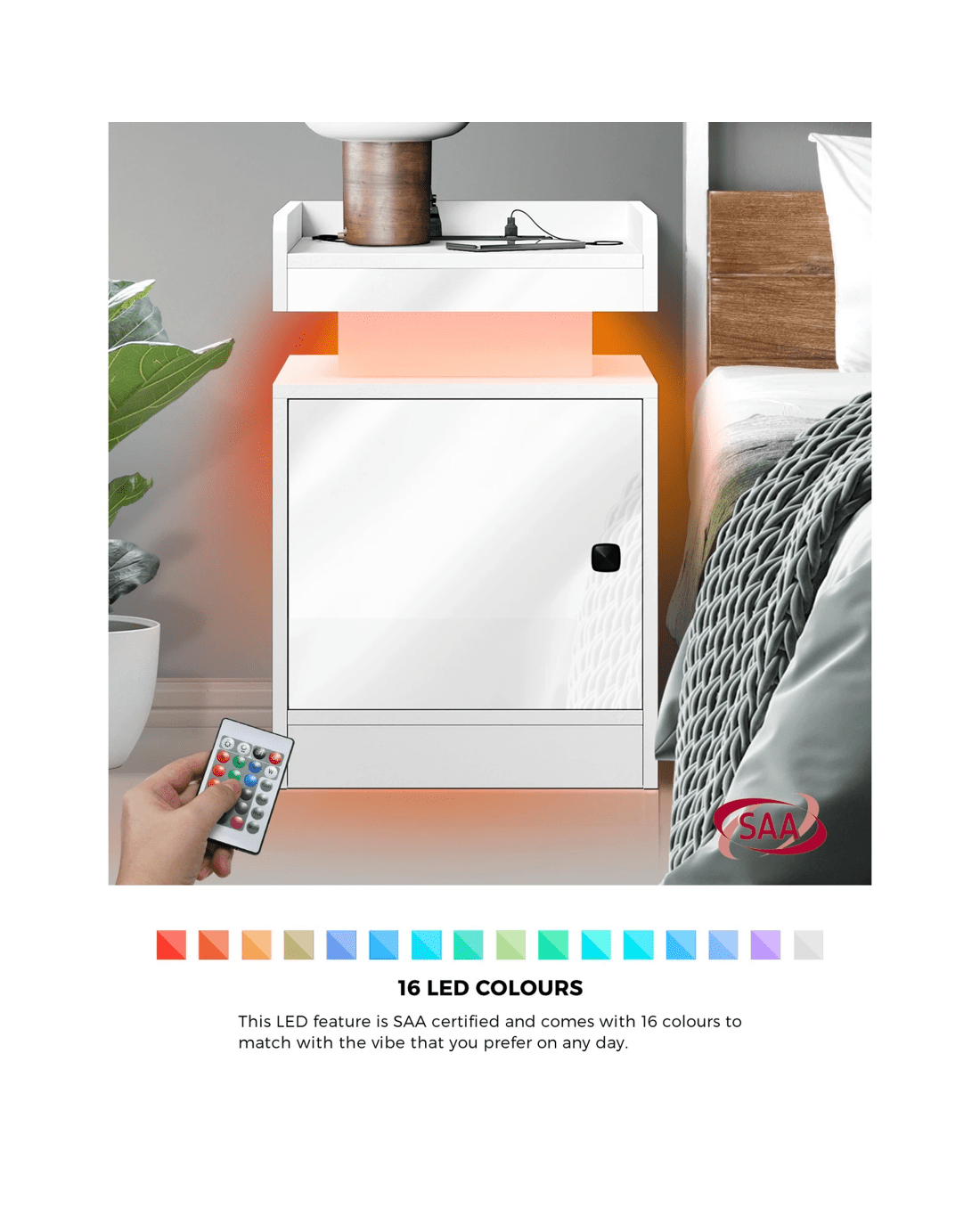 But what's really astounding about this bedside table is the customisable LED lighting with 16 colours and 4 flashing modes to create a spectacular lightshow or ambient lighting for perfect rest and relaxation. The bedside table can even be a showcase for your treasured mementos or collectibles with display lighting. Everything is easily set with a handy remote control at your fingertips. Plus, two useful AC power outlets and a USB-A and a USB-C port are also built-in for convenient charging or powering of your favourite media devices.