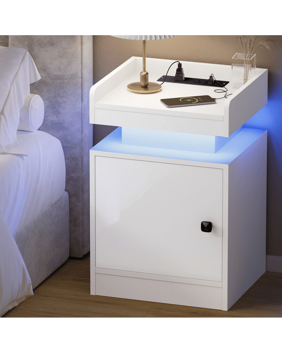 Sold by Kamprad's Oikos 1943Oikiture Bedside Table Led Nightstand Usb Charging Station - White