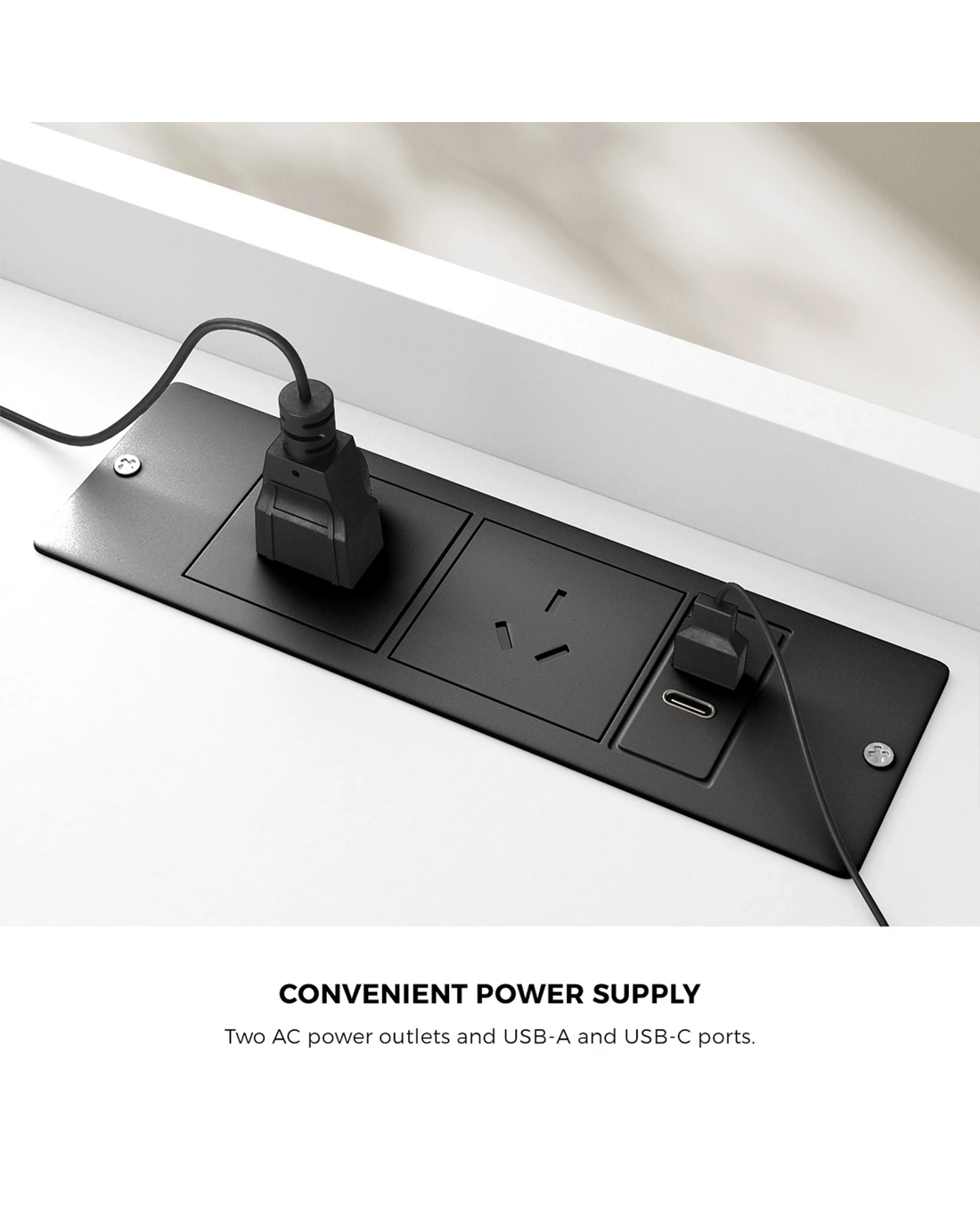 Power socket: Two AC outlets and USB-A and USB-C ports
