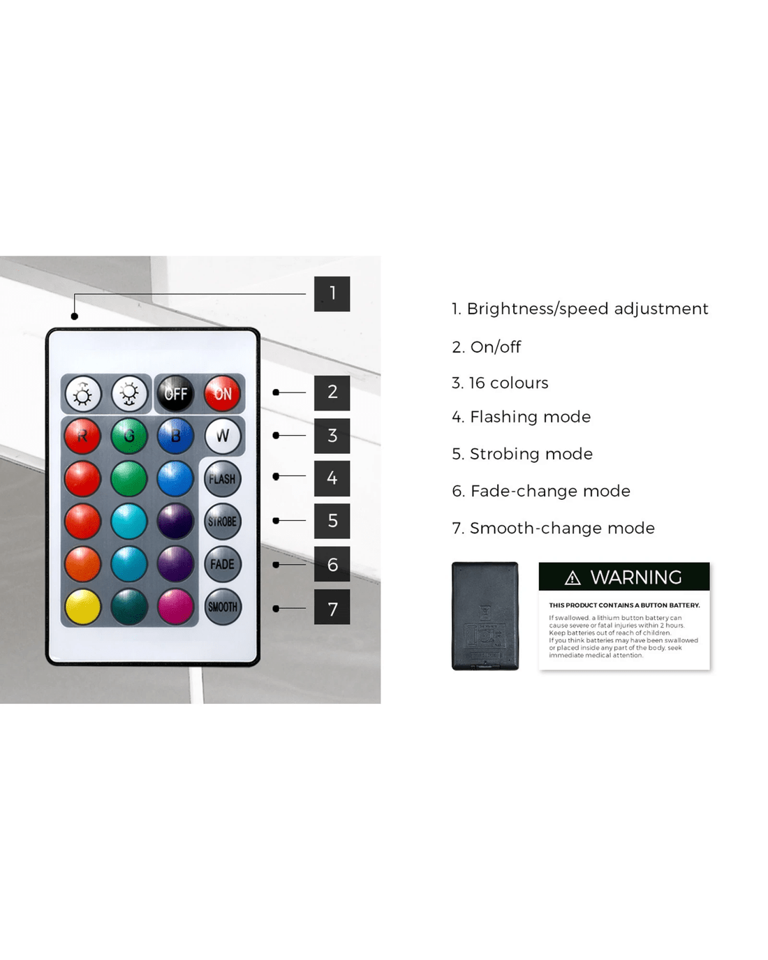 16 LED colours and 4 flashing modes
