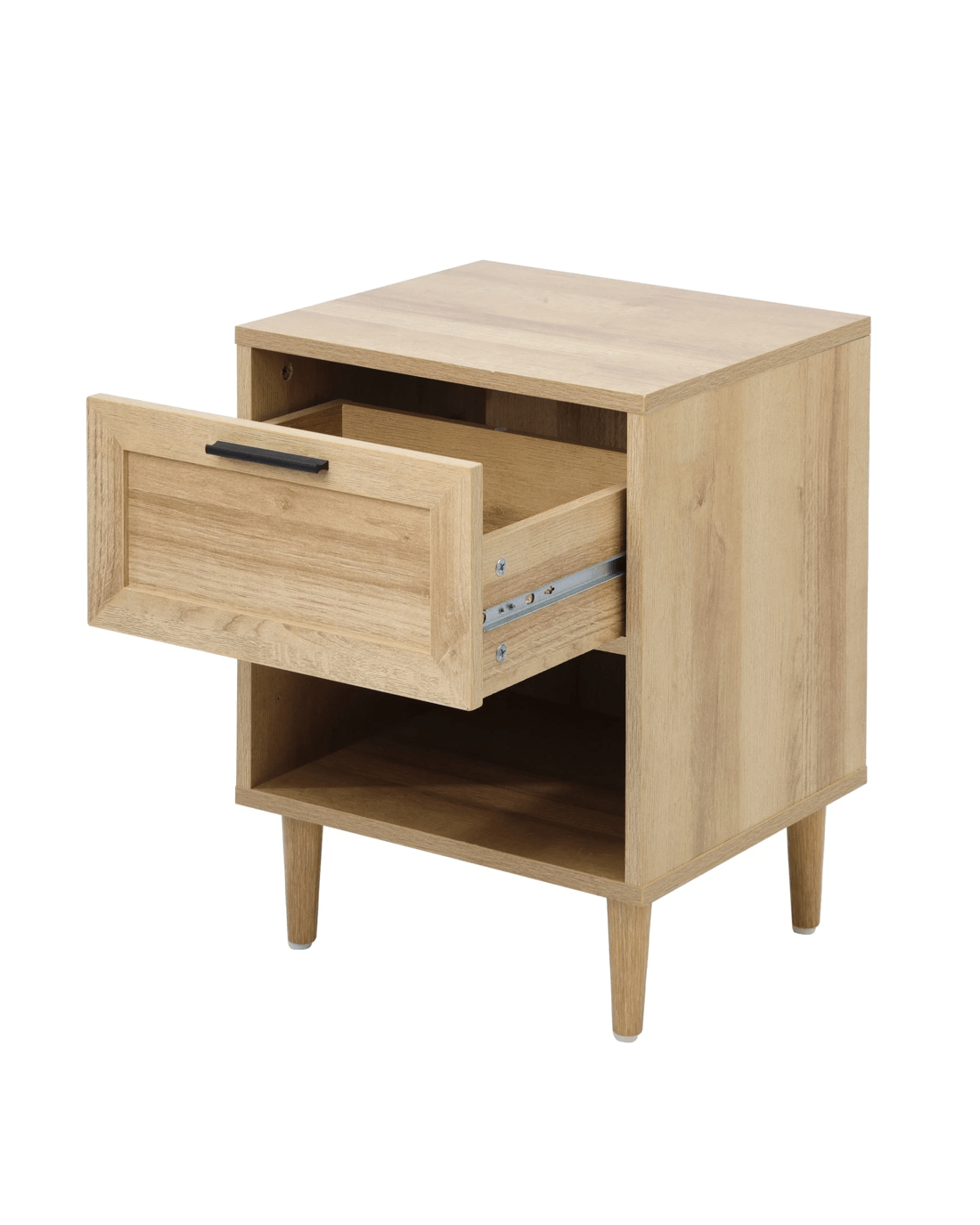 Featuring a wood blend finish with sculpted indents, the bedside table has all the vibes of a contemporary piece that transcends style and trends. The single drawer is blessed with ample space whilst the open shelf below provides additional storage real estate for frequently used or accessed items.