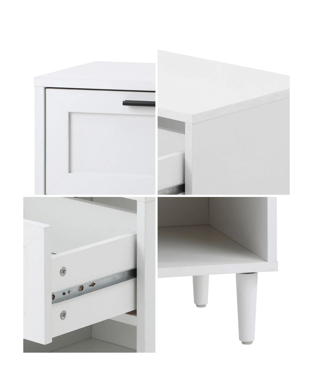 The smooth finishing is near flawless with meticulous attention to details. Every aspect is smooth to the touch and every joint a harmonious fit. Likewise, the sturdy 15mm particle board construction with quality components, viz the aluminium alloy handle and solid wood legs, ensures that the bedside table will serve its purpose with total durability and longevity.