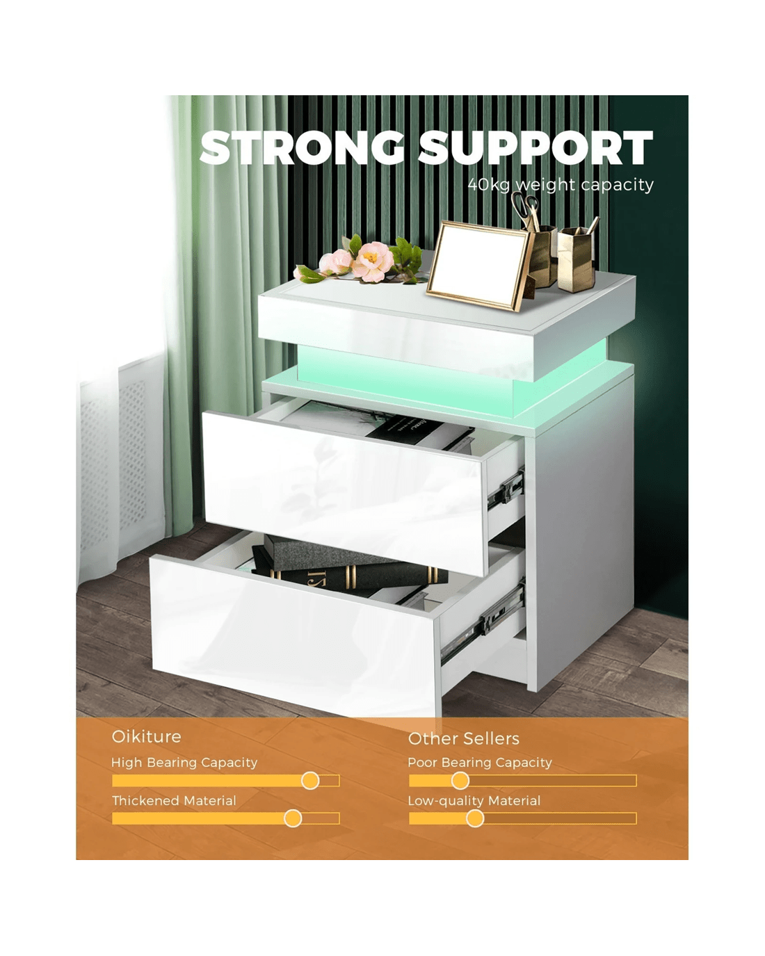 Sold by Kamprad's Oikos 1943Oikiture Bedside Table Rgb Led Nightstand Cabinet 2 Drawers - White