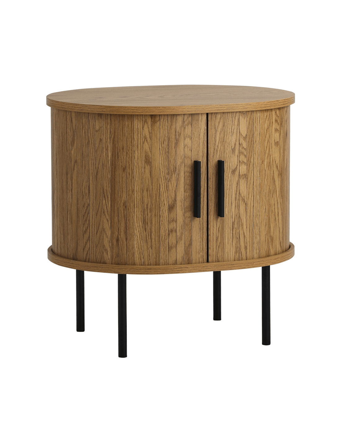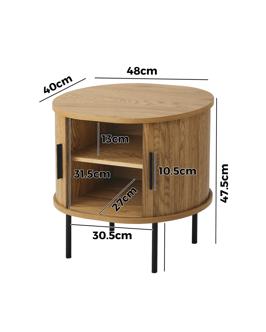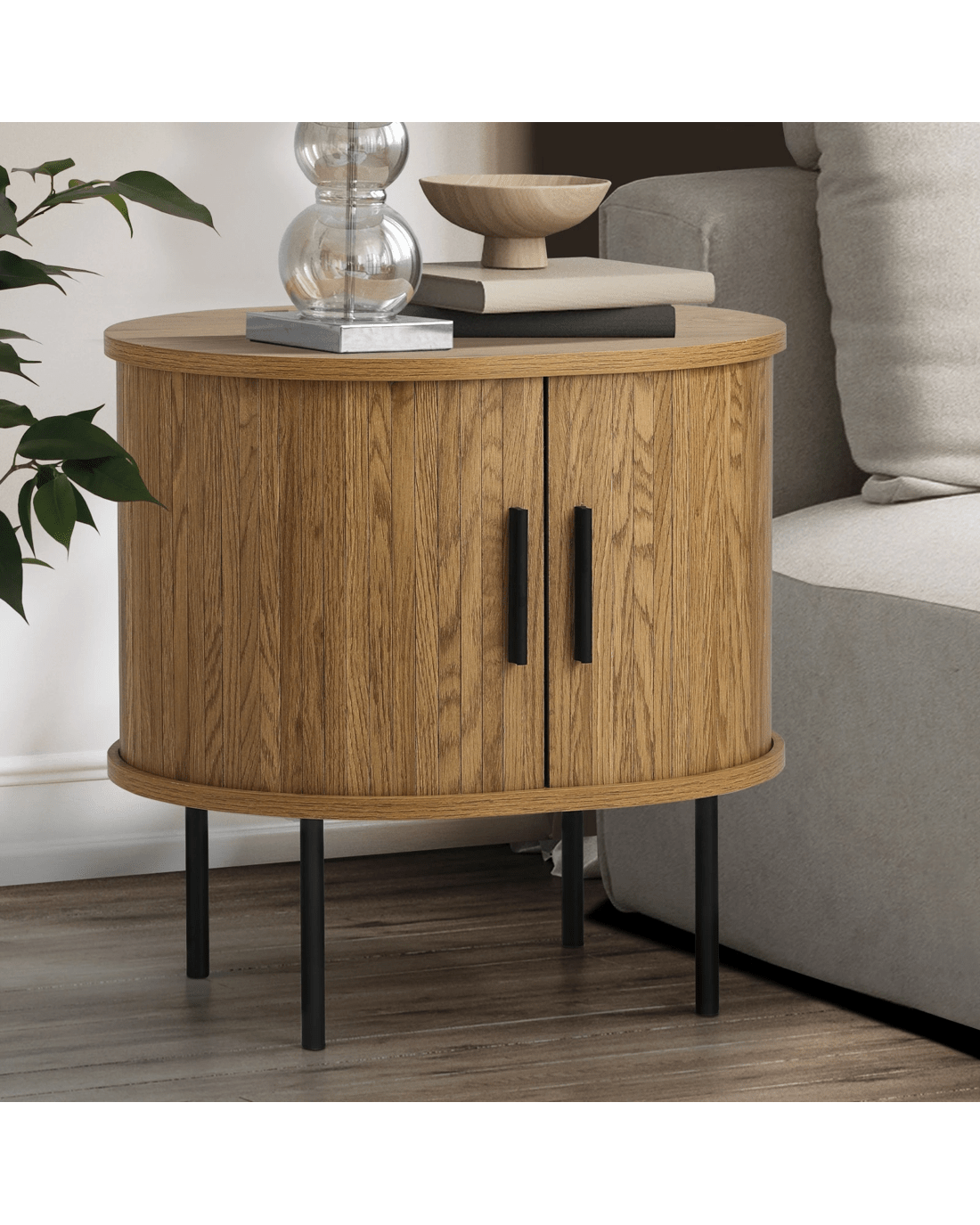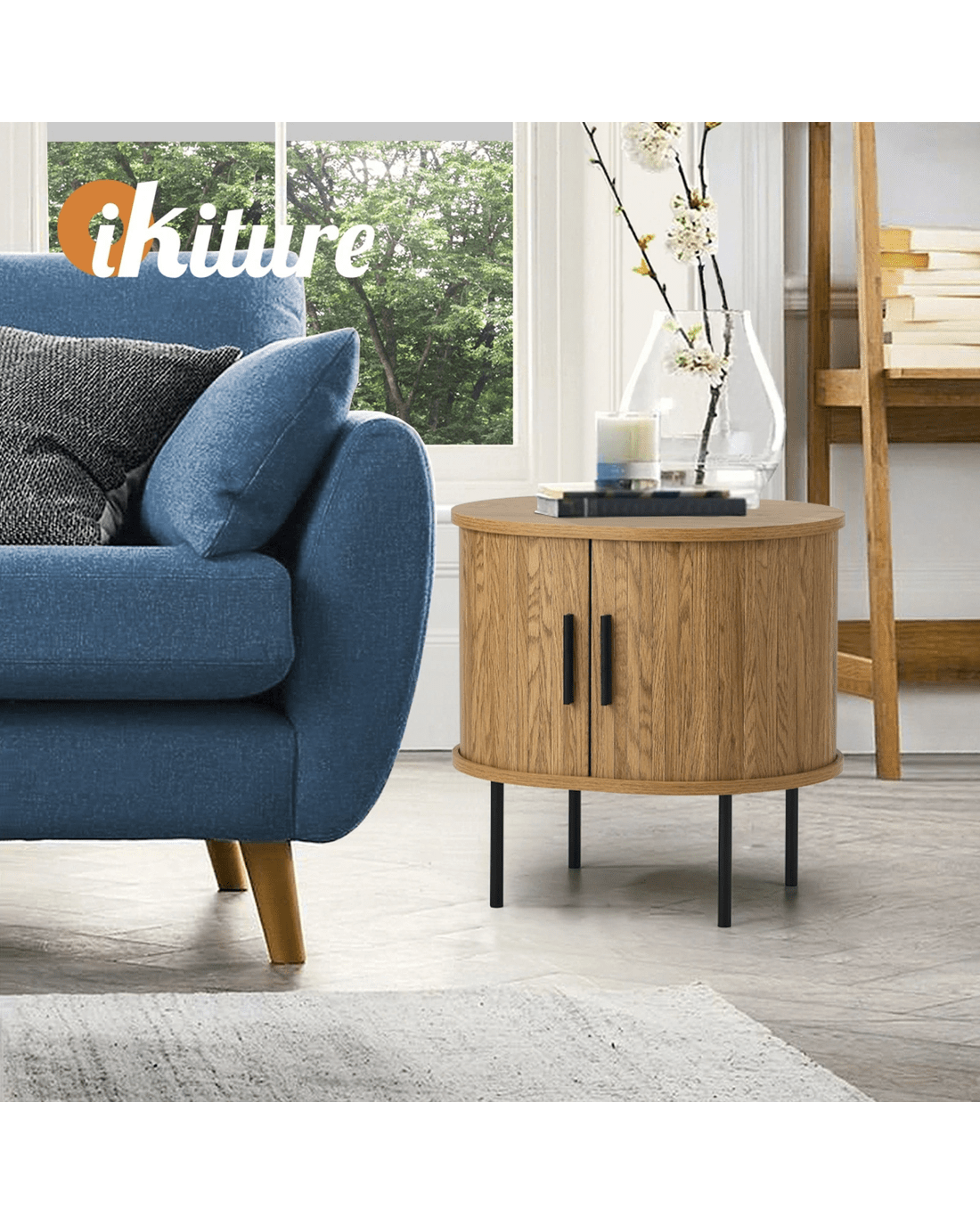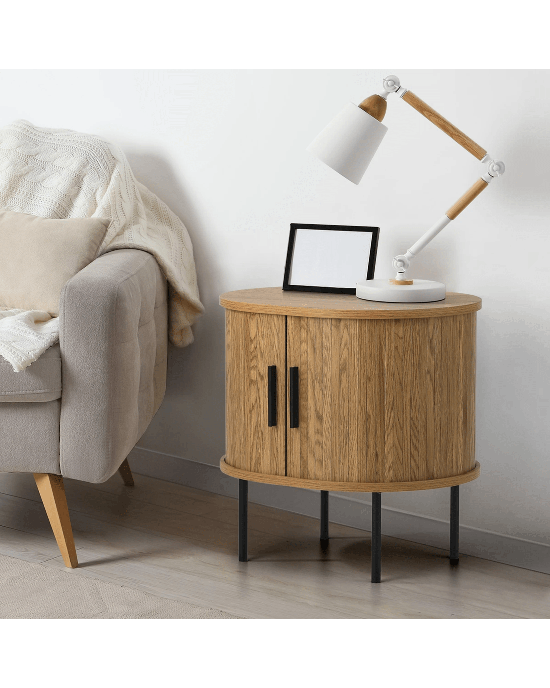 The humble bedside table is undoubtedly one of life's better creations. Functional. Convenient. Tidy. Organised. A desirable furniture piece to complete your stylish bedside setup. And an Oikiture Bedside Table ticks all the right boxes to enhance your bedside experience. With its retro designer vibes, our rounded bedside table will sit well with any modern and eclectic home decor. Its versatile form and function are equally matched with ample shelf-storage space within and augmented by twin sliding doors to keep the contents neatly stored in a dust-free compartment. The seamless wood-like ridges on the doors also add embellished textures that make it stand out as an impressive art piece. The woodgrain finishing is near flawless with meticulous attention to details. Every aspect is smooth to the touch and every joint a harmonious fit. Likewise, the sturdy 15mm particle board and MDF construction with quality components ensures that the bedside table will serve its purpose with total durability and longevity. And cleaning and maintenance is just a simple wipe away to keep this attractive piece in its pristine condition. The Oikiture Bedside Table is a must-have to give your bedroom (or even any room) a retrospective presence with timeless beauty.