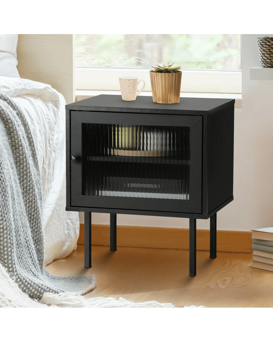 The humble bedside table is undoubtedly one of life's better creations. Functional. Convenient. Tidy. Organised. A desirable furniture piece to complete your stylish bedside setup. And an Oikiture Bedside Table ticks all the right boxes to enhance your bedside experience. With its retrospective vibes, our bedside table will sit well with any modern and eclectic home decor. Its versatile form and function are equally matched with ample shelf-storage space within and augmented by a reeded tempered-glass door to keep the contents neatly stored with privacy in a dust-free compartment. The finishing is near flawless with meticulous attention to details. Every aspect is smooth to the touch and every joint a harmonious fit. Likewise, the sturdy 15mm particle board construction with quality components ensures that the bedside table will serve its purpose with total durability and longevity. And cleaning and maintenance is just a simple wipe away to keep this attractive piece in its pristine condition. With a choice of three neutral hues, the Oikiture Bedside Table is a must-have to give your bedroom (or even any room) a touch of modern vibe with timeless beauty.