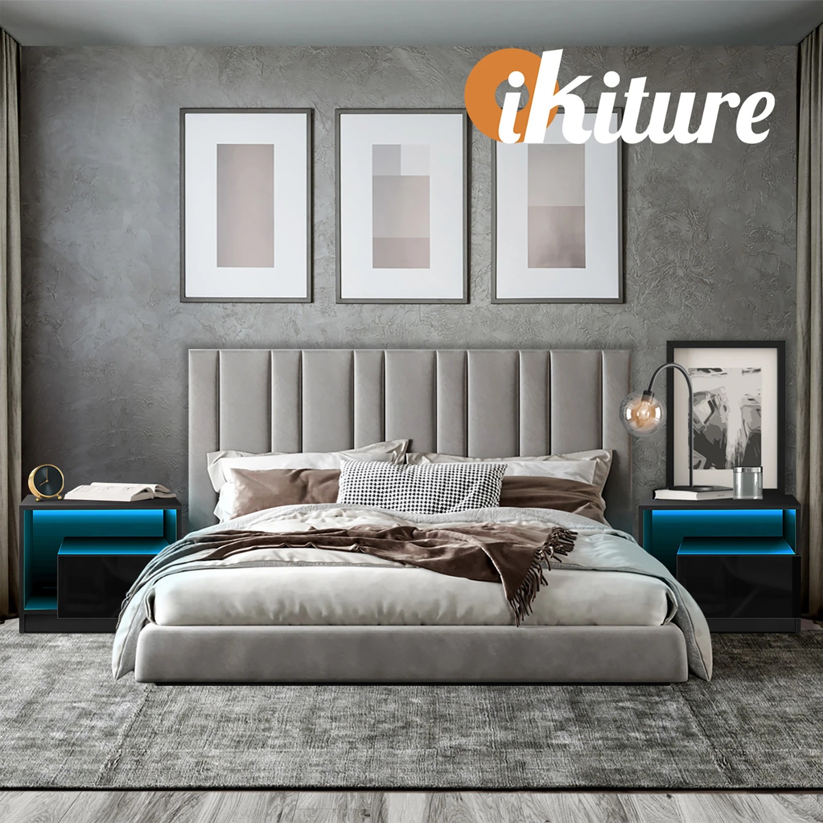 Oikiture Bedside Tables Rgb Led Drawers High Gloss Nightstand - Black