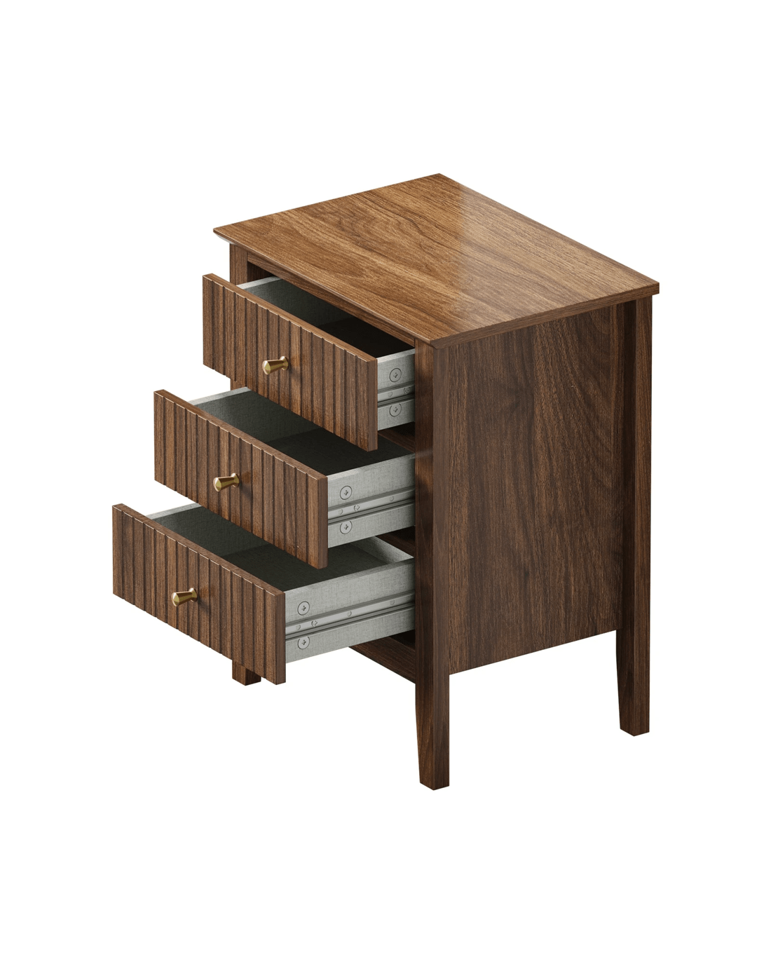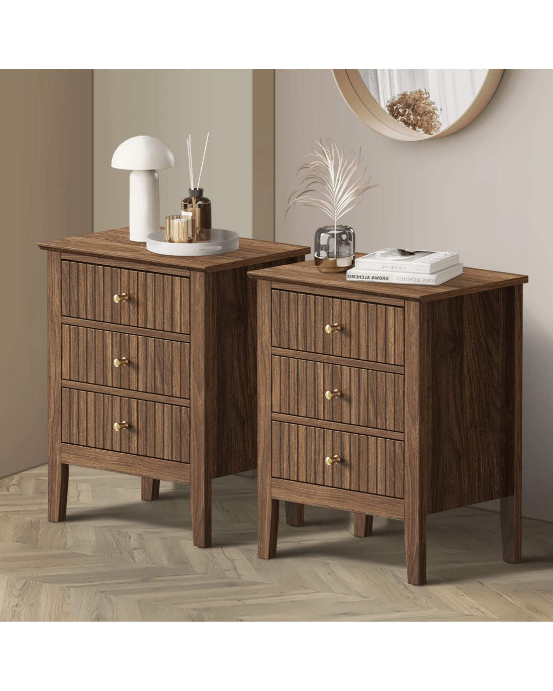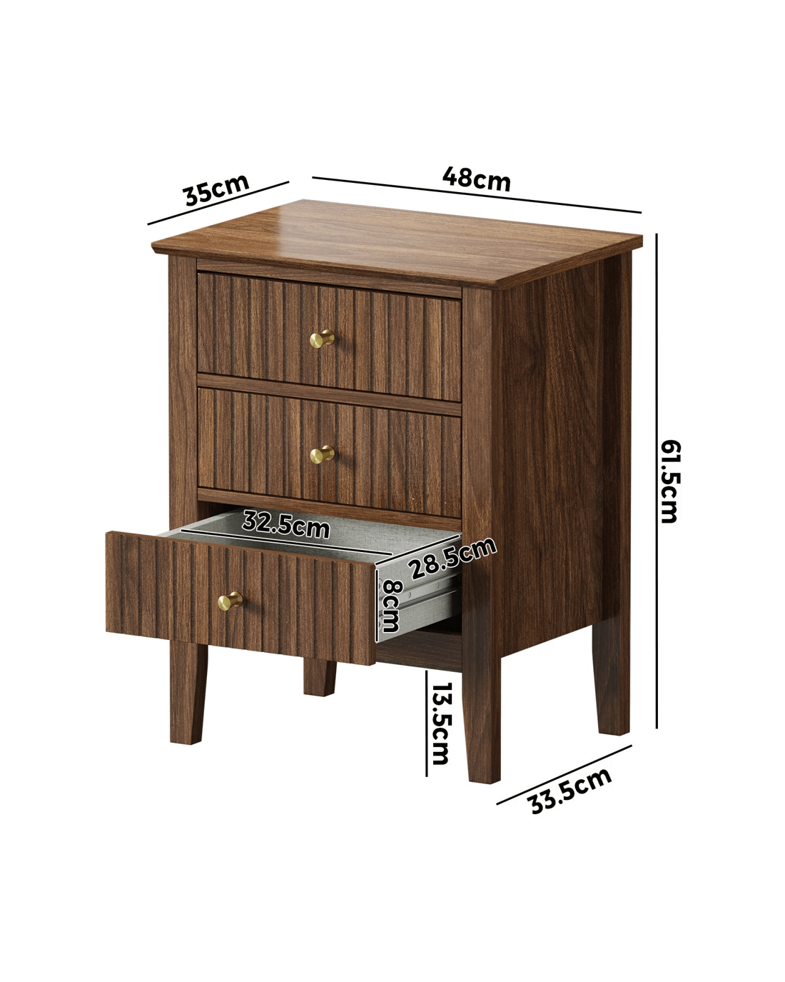 In terms of style, the bedside table has all the vibes of a cottage-inspired piece that stands out from the ordinary. With character and presence to add a rustic touch to your decor. The triple drawers, with stripe textured fronts, are blessed with ample space whilst the auric-hue brass handles make for easy opening and closing besides their aesthetic qualities.