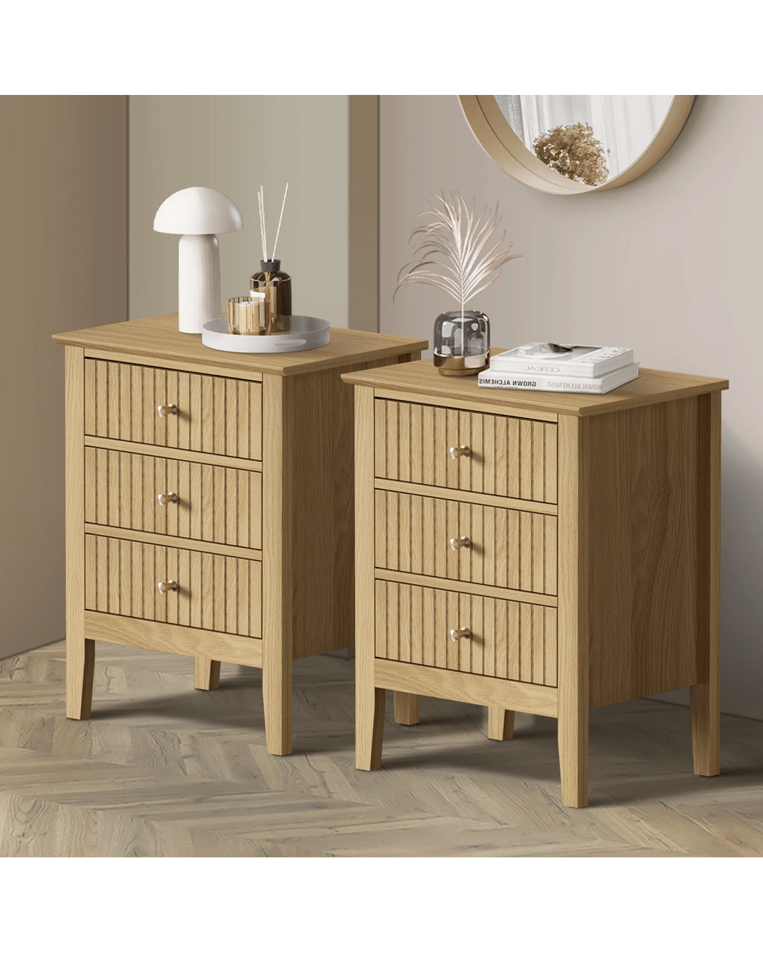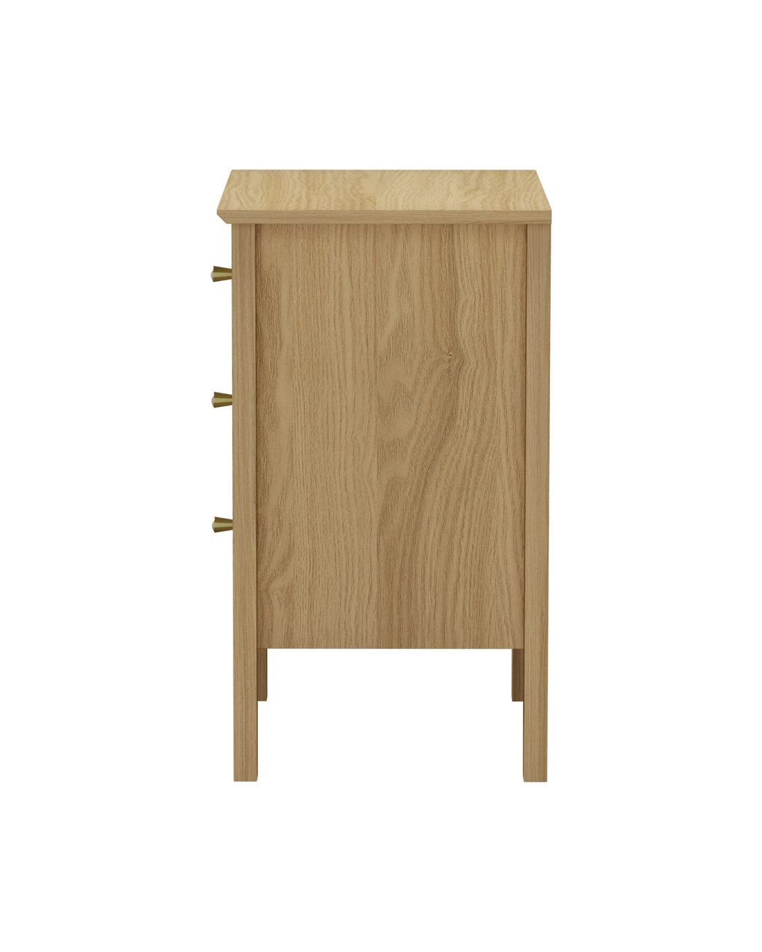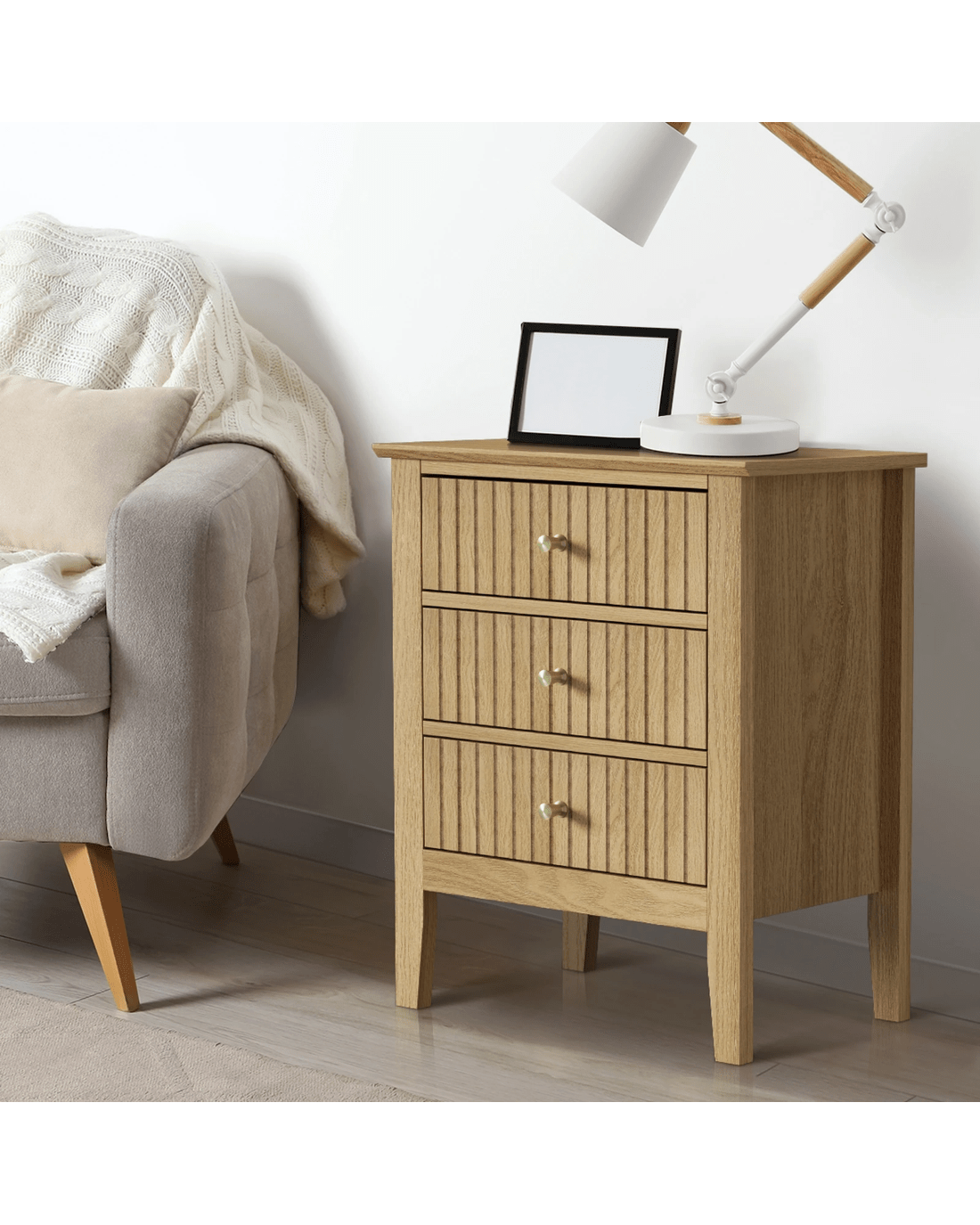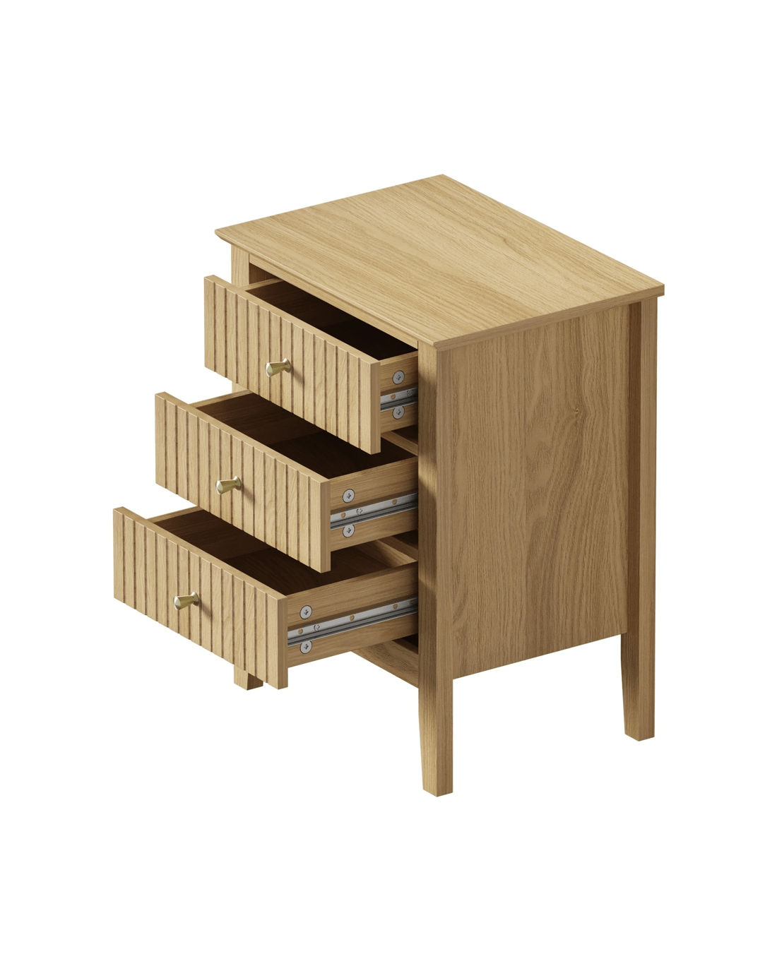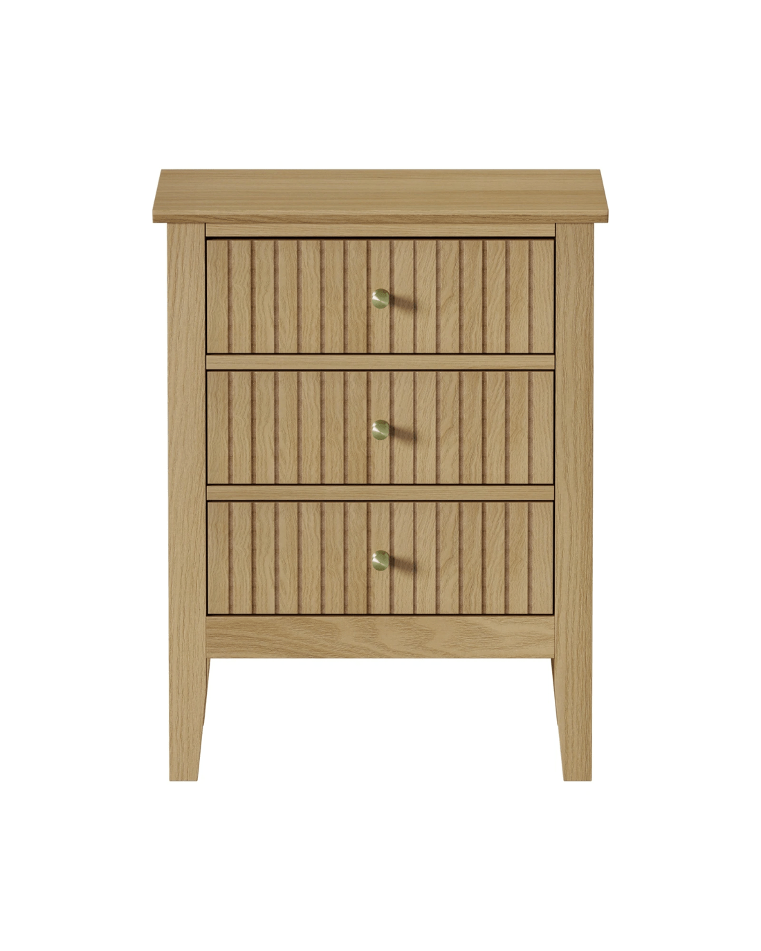In terms of style, the bedside table has all the vibes of a cottage-inspired piece that stands out from the ordinary. With character and presence to add a rustic touch to your decor. The triple drawers, with stripe textured fronts, are blessed with ample space whilst the auric-hue brass handles make for easy opening and closing besides their aesthetic qualities.