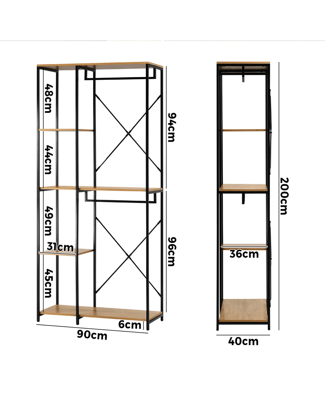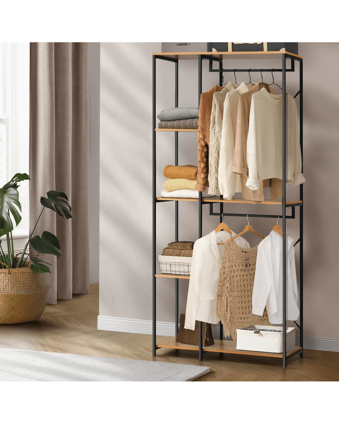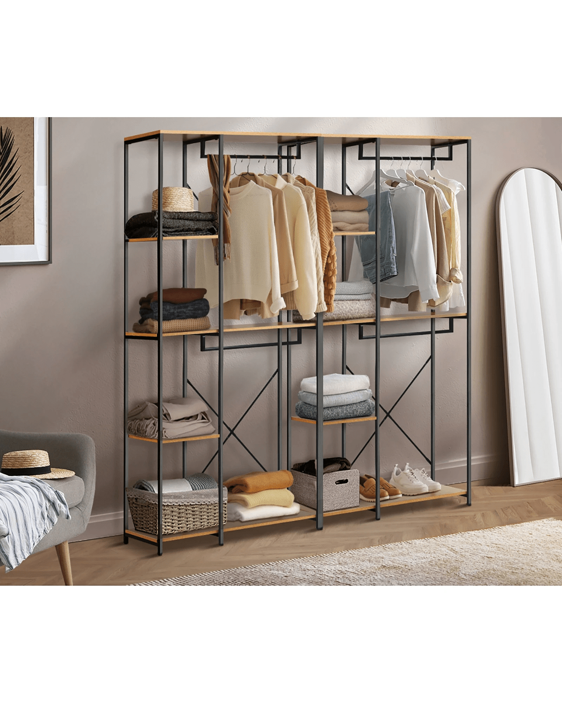 Transform your bedroom or dressing area into a statement of modern style and functional elegance with our Oikiture industrial open wardrobe. Elevate your organizational game with this unique piece that not only adds visual interest but also enhances the overall aesthetic of your living space. Welcome a wardrobe that speaks to both fashion and functionality, creating an urban retreat within the comfort of your home.