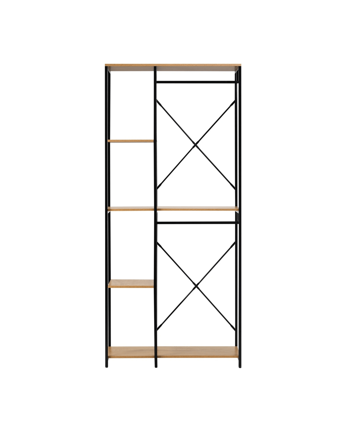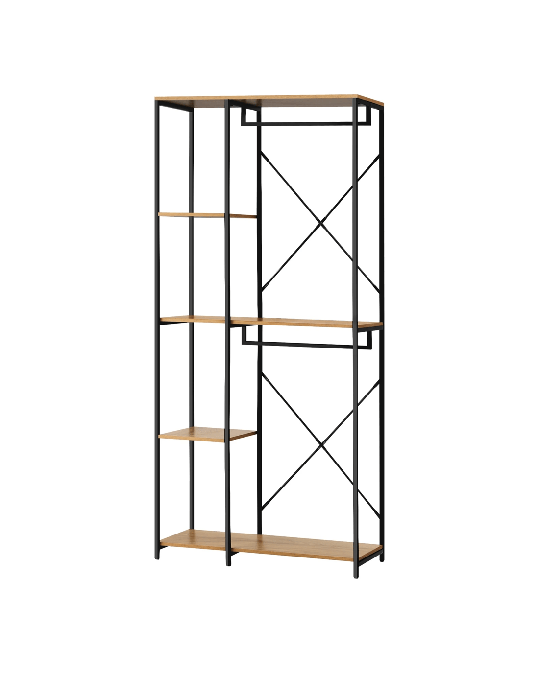 Featuring open shelving and hanging space, this wardrobe allows you to showcase your fashion-forward sensibilities. The exposed design not only adds a touch of contemporary style but also allows for easy access to your favorite garments and accessories. The combination of sturdy shelves and hanging rods creates a functional and adaptable storage solution for both folded and hanging items.