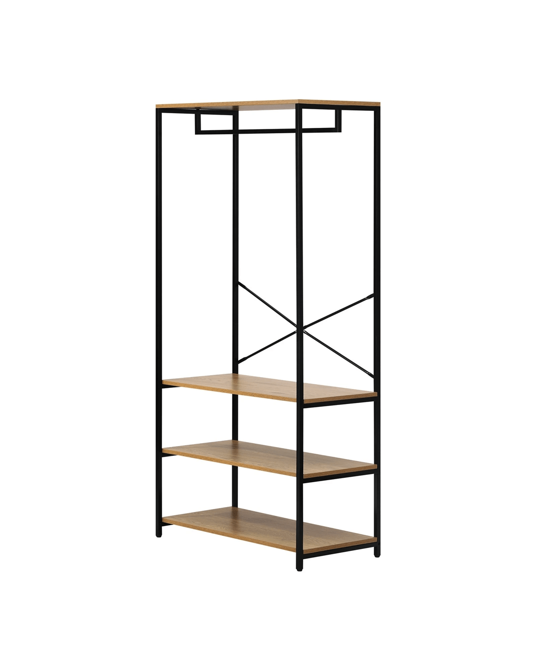 Featuring open shelving and hanging space, this wardrobe allows you to showcase your fashion-forward sensibilities. The exposed design not only adds a touch of contemporary style but also allows for easy access to your favorite garments and accessories. The combination of sturdy shelves and hanging rods creates a functional and adaptable storage solution for both folded and hanging items.