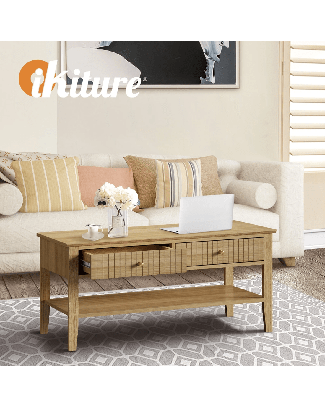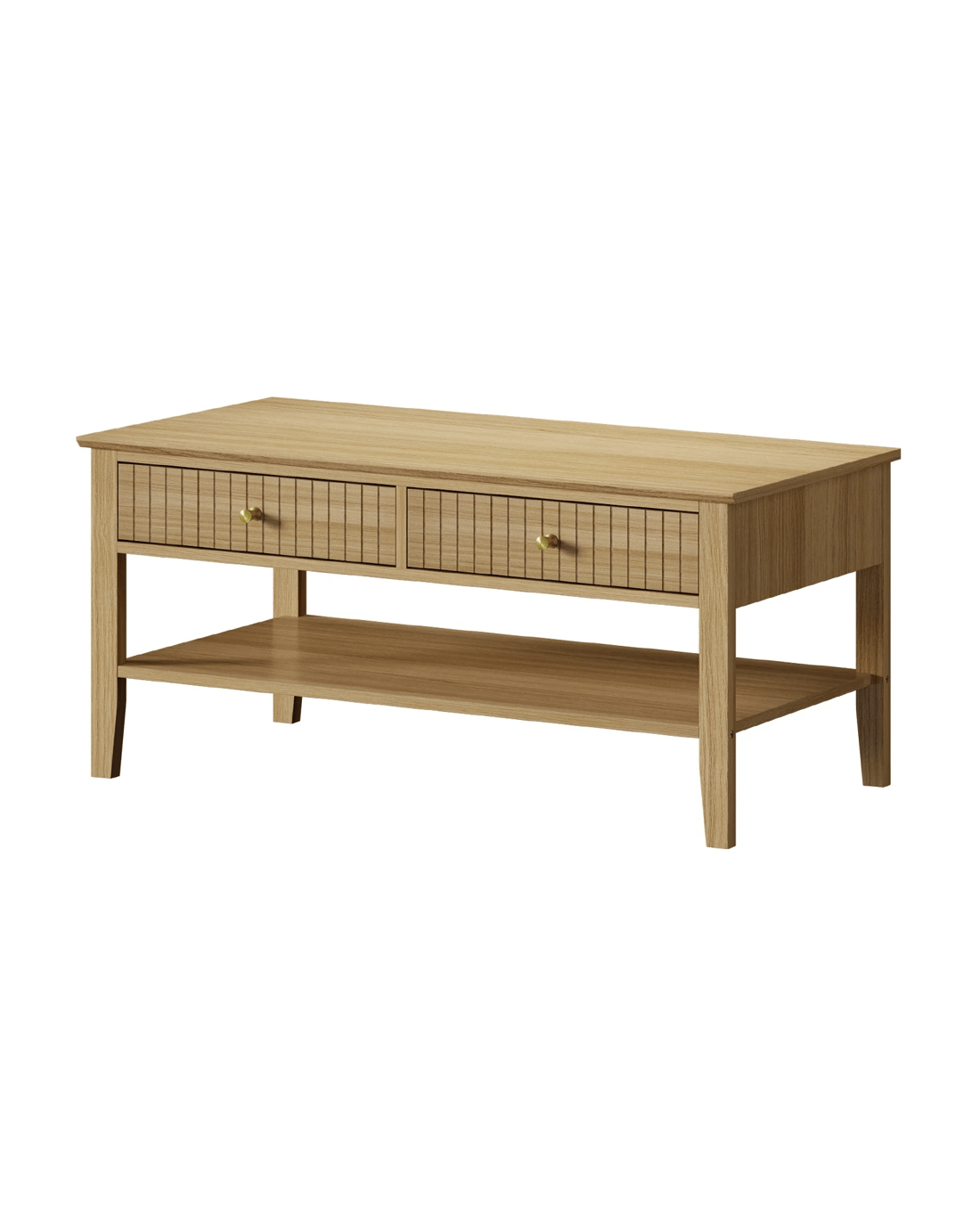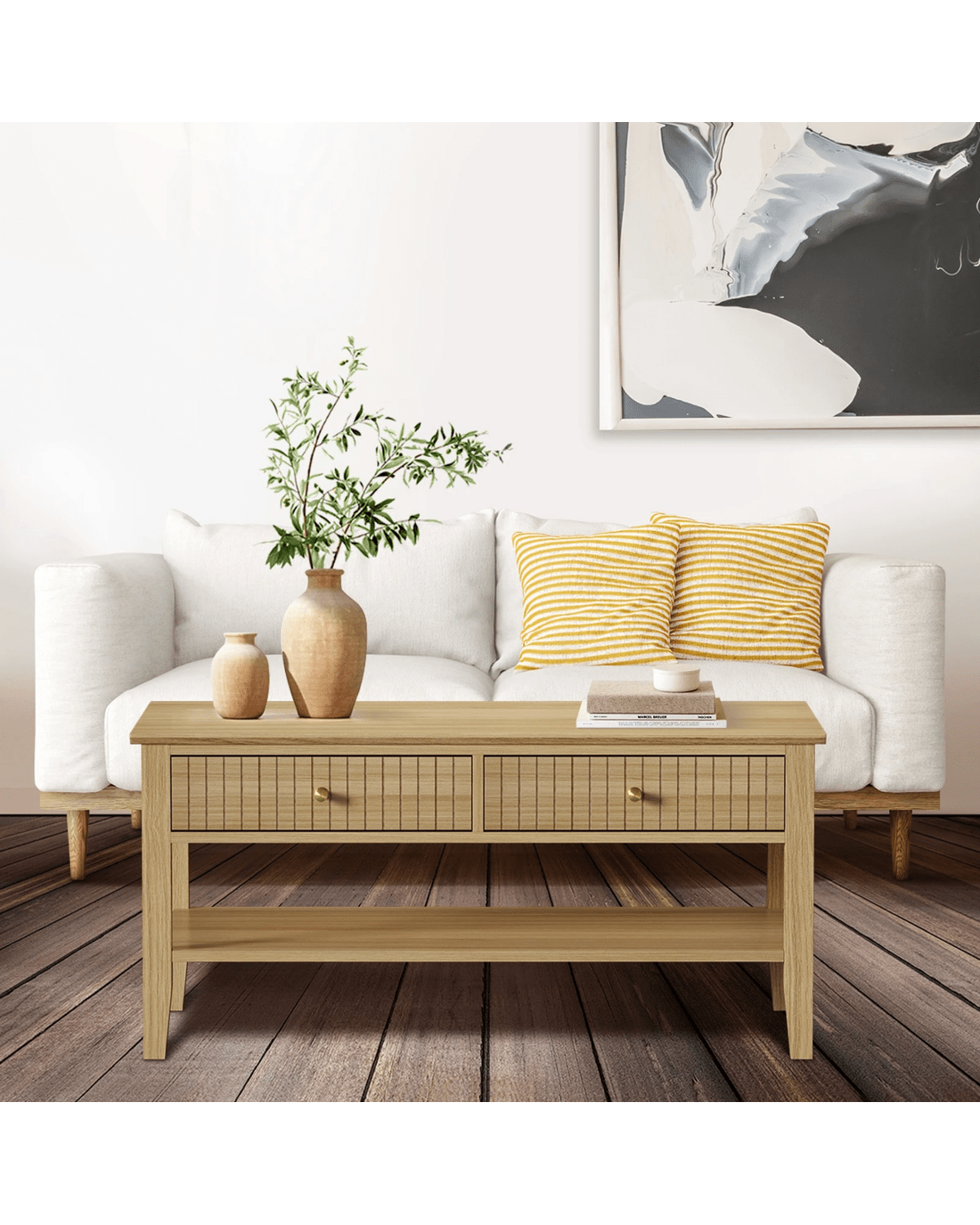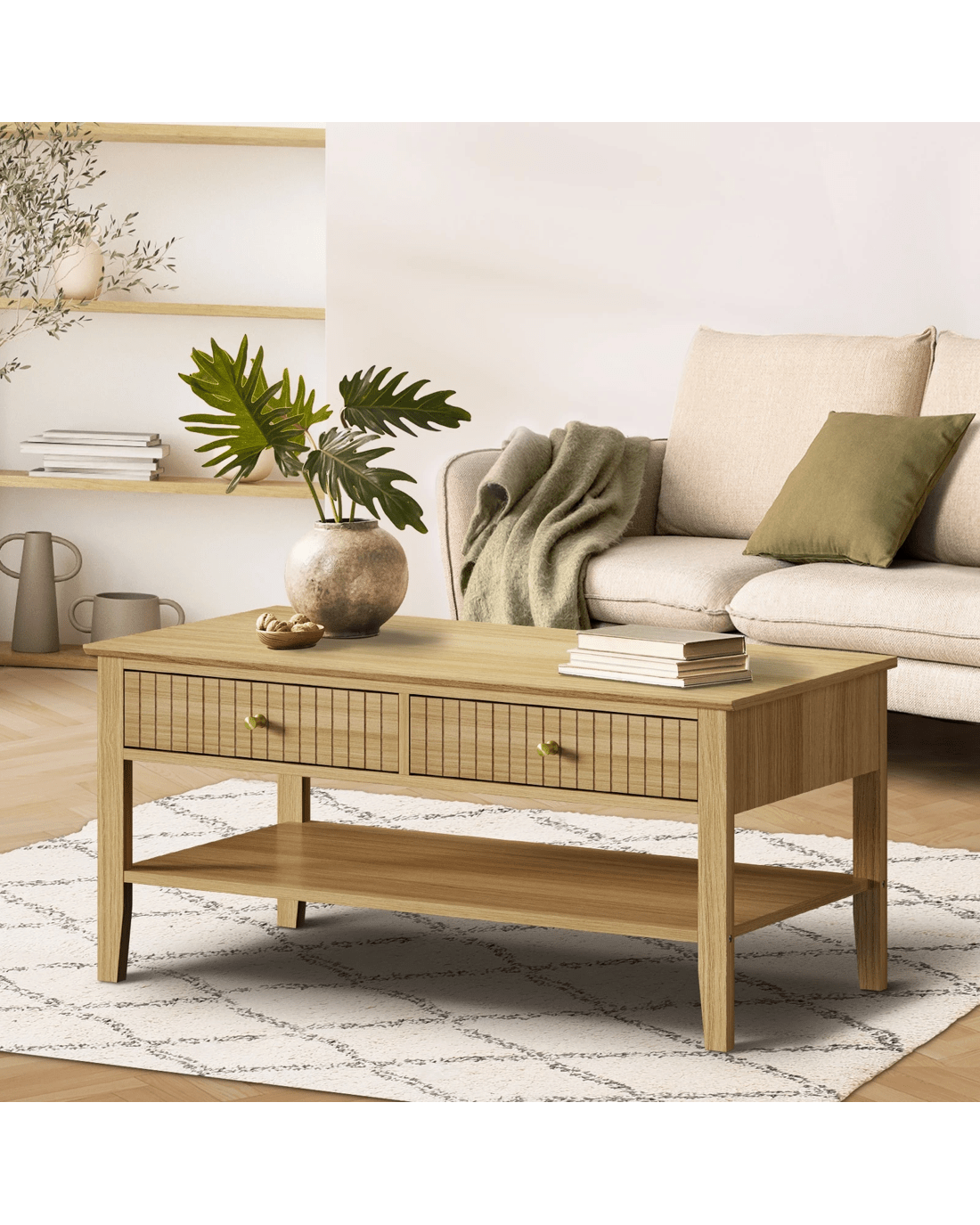 Oikiture Coffee Table Rectangle Table Side Storage Drawers Shelving - Natural