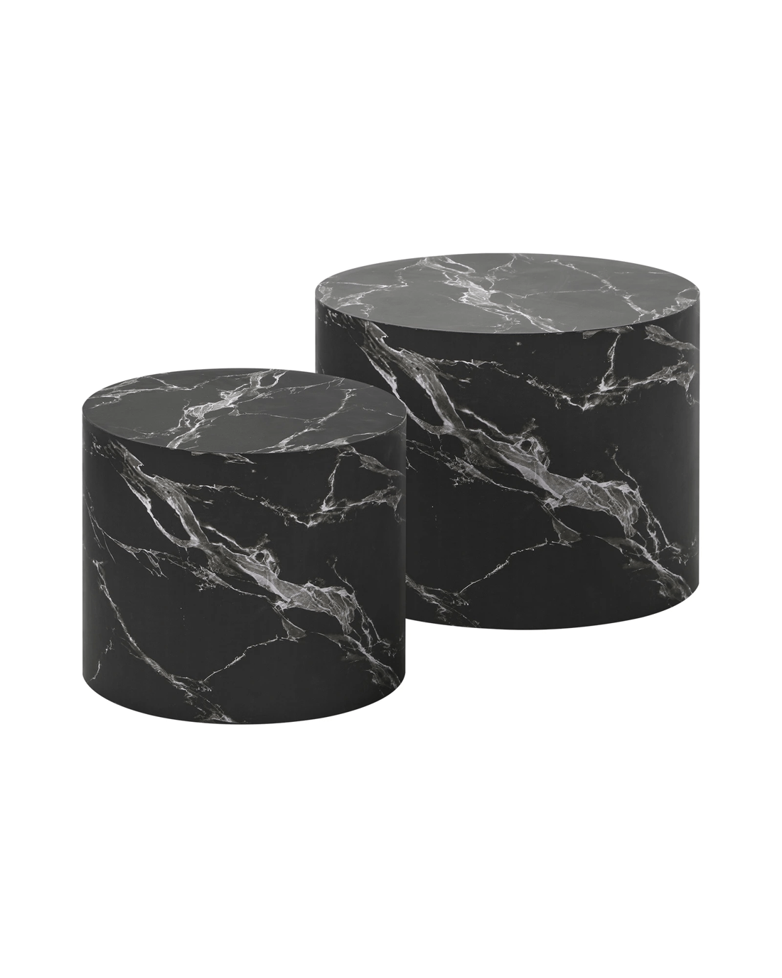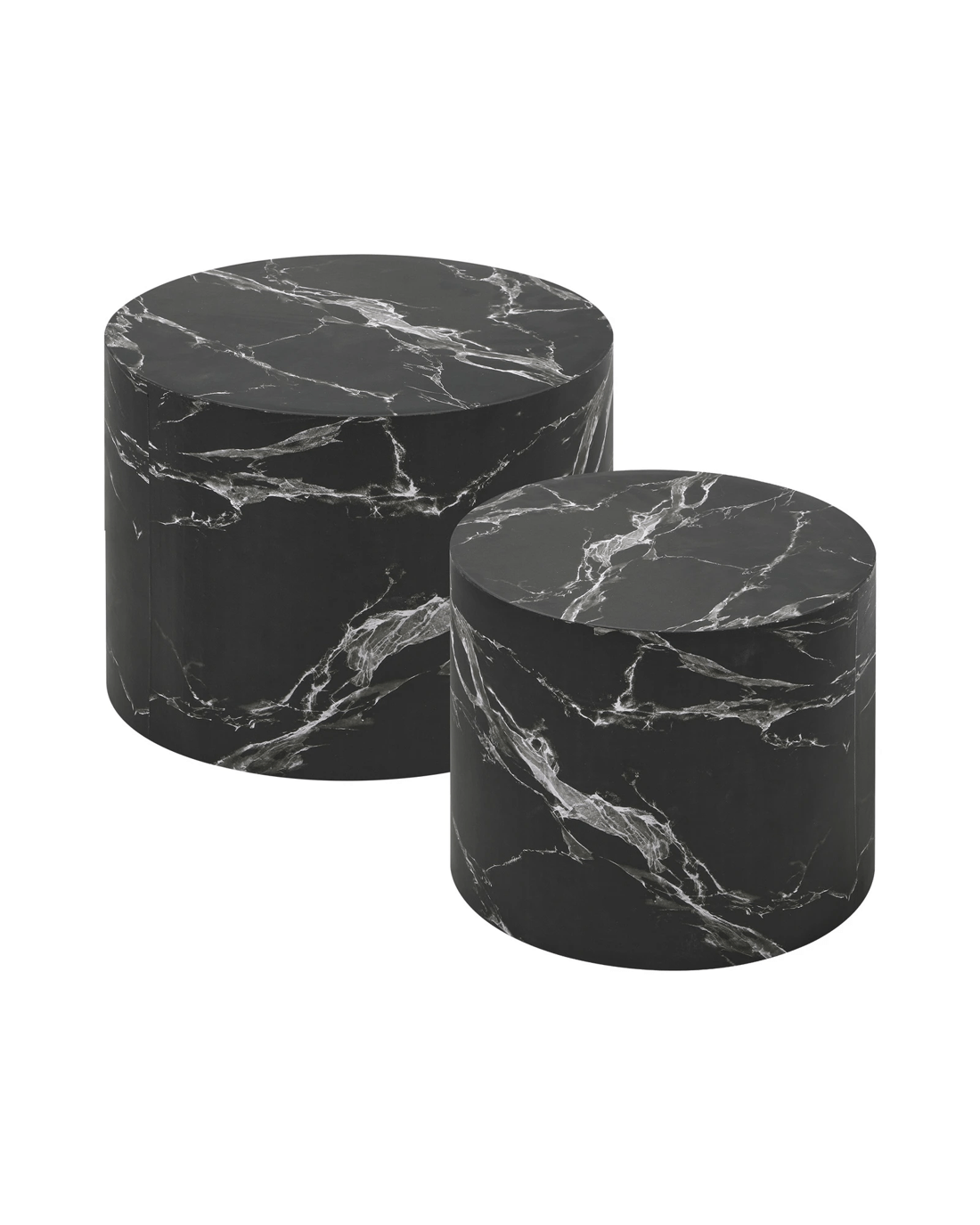 Comprising two identical round coffee tables, this duo is clad with a marble-effect melamine finish to simulate real marble blocks. Absolutely stunning veins with lots of classic overtones.