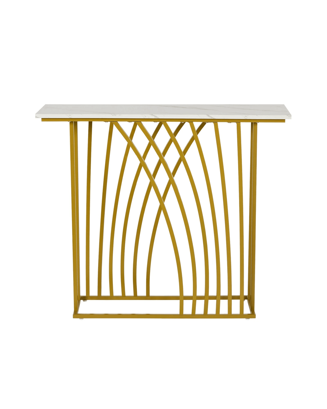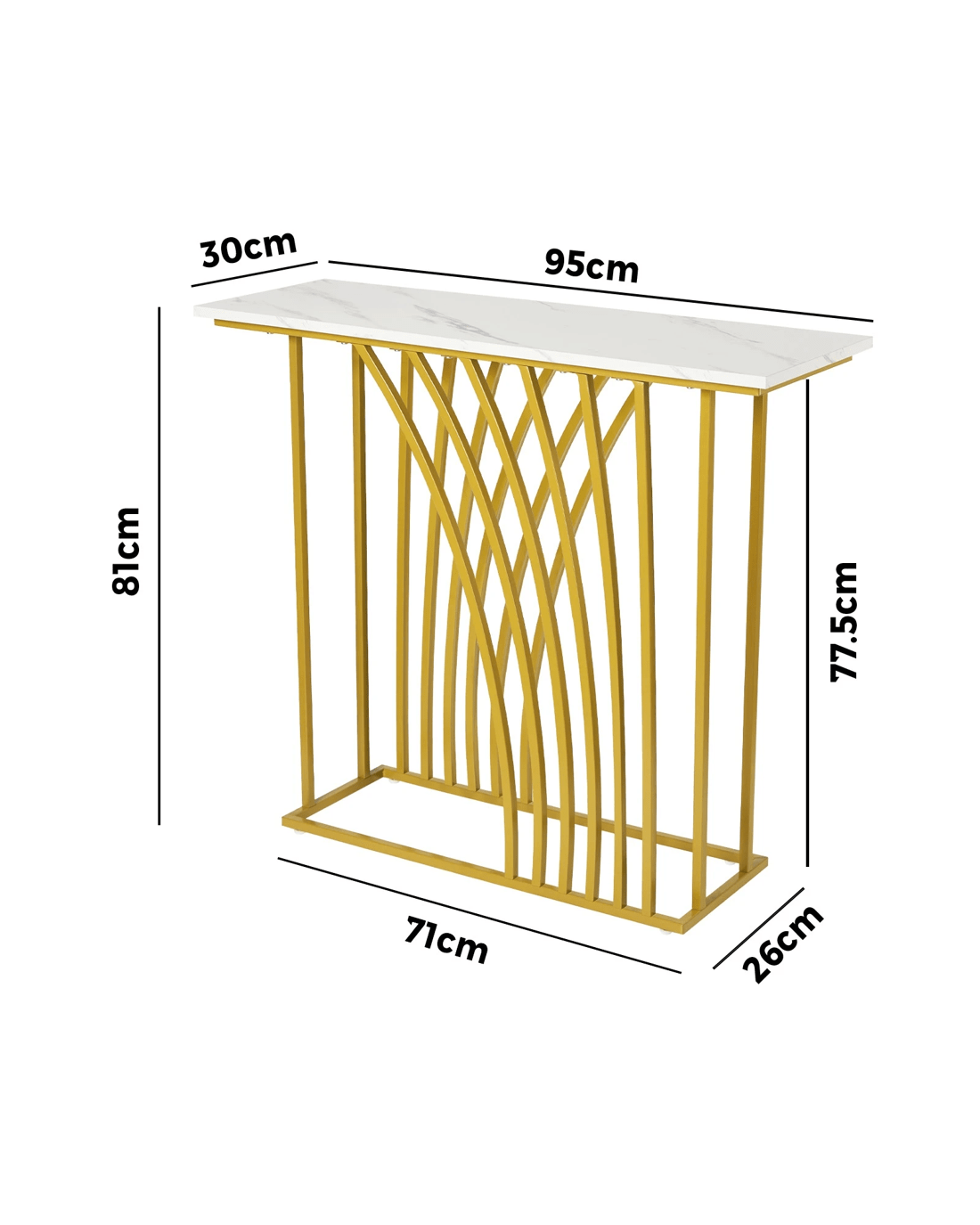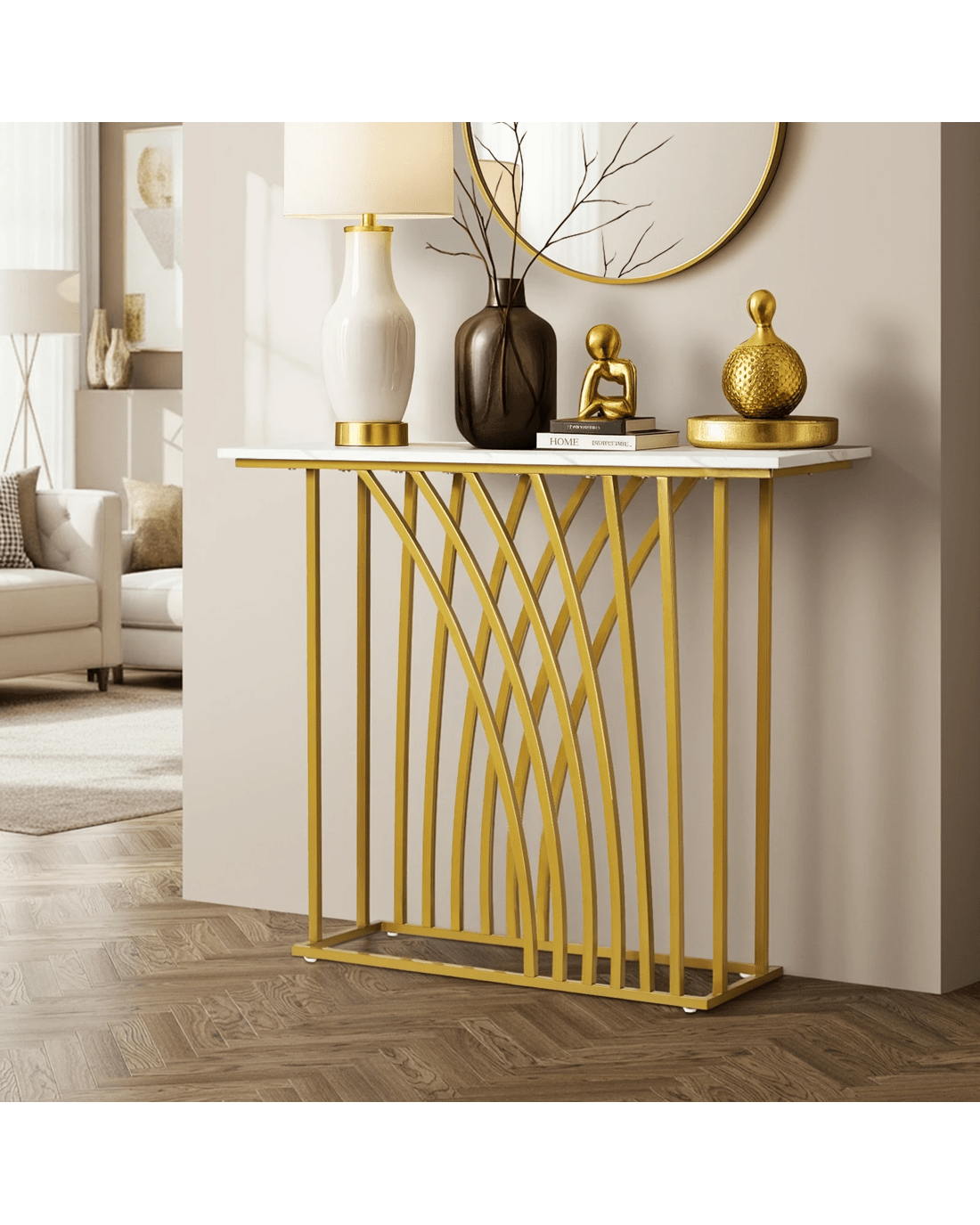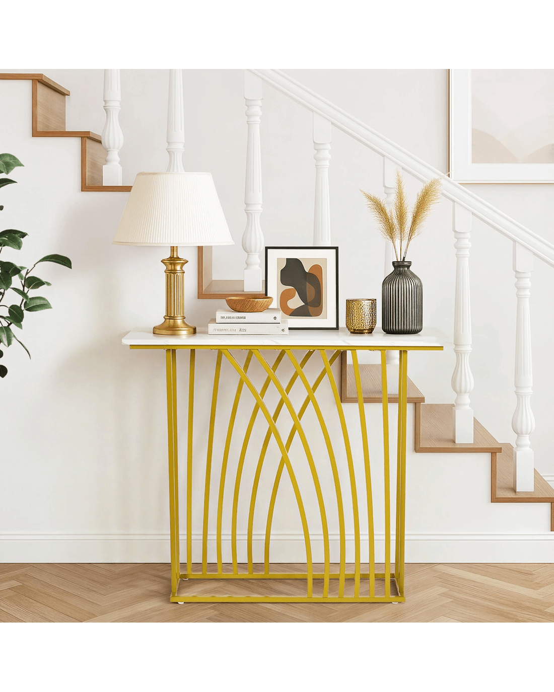 Crafted with high-quality materials with close attention to details, our console table is built to last. The unique curved gold-plated stand - an eye-catching feature that captures immediate attention - provides a solid structure for the console table, while the smooth and marble-like twin tabletop offers a sleek and sophisticated surface for displaying decorative items or everyday essentials. The clean lines and sleek design will complement any decor style with ease. Better still, its presence need not be at just the hallway but in every living space or room that warrants your creativity and imagination.